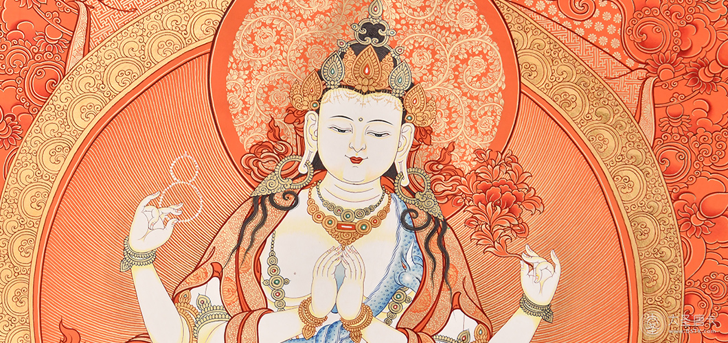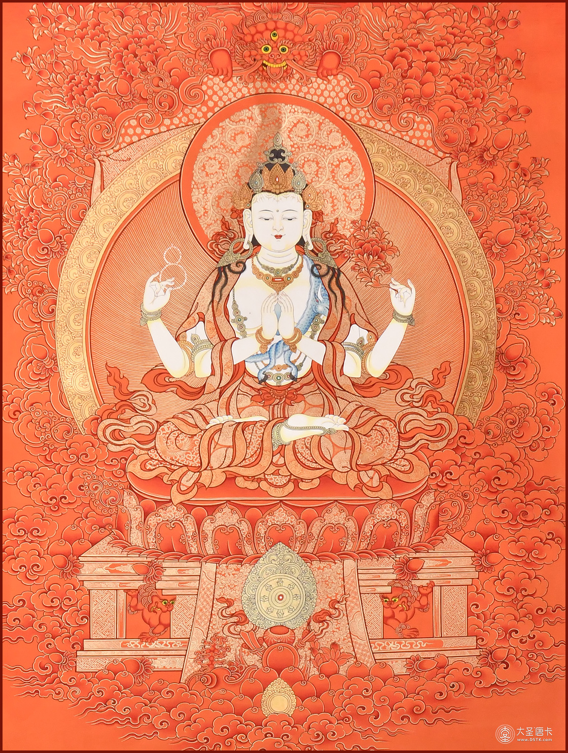 四臂觀音,雪域西藏的守護神,為西藏佛教密宗本尊之一。本尊身顏潔白如月,頭戴五佛冠,發(fā)黑色結髻,中央二手合掌於胸前,捧有摩尼寶珠,右手持水晶念珠。左手拈八瓣蓮花與耳際齊,面貌寂靜含笑。