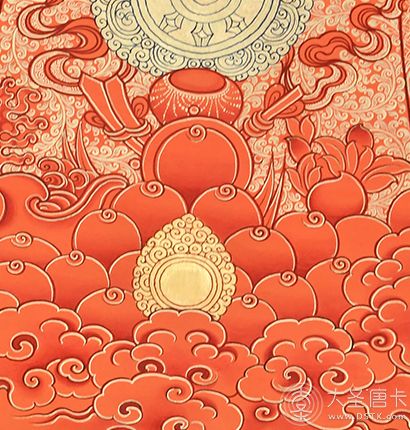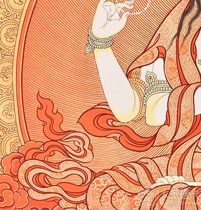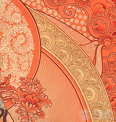 在繪制佛像服飾等位置時,用刻金技法,使圖案更具豐富的層次和立體感,用金勾勒的線條和圖案不但明亮度進一步提高,讓畫面更加燦爛,而且也使金在畫面上保持得更加長久。