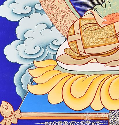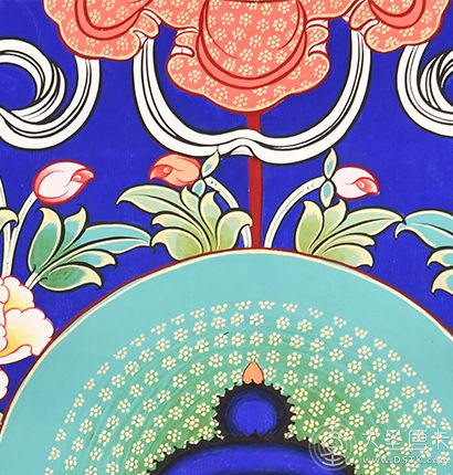 在繪制佛像服飾等位置時(shí),用刻金技法,使圖案更具豐富的層次和立體感,用金勾勒的線條和圖案不但明亮度進(jìn)一步提高,讓畫面更加燦爛,而且也使金在畫面上保持得更加長(zhǎng)久。