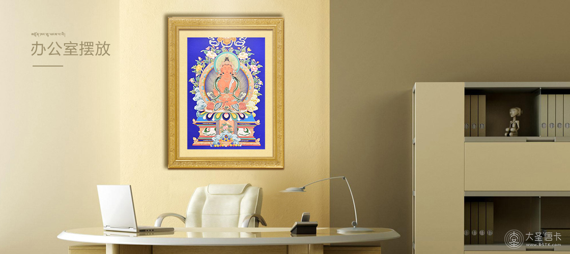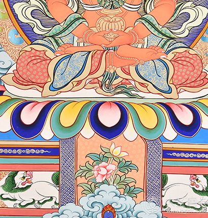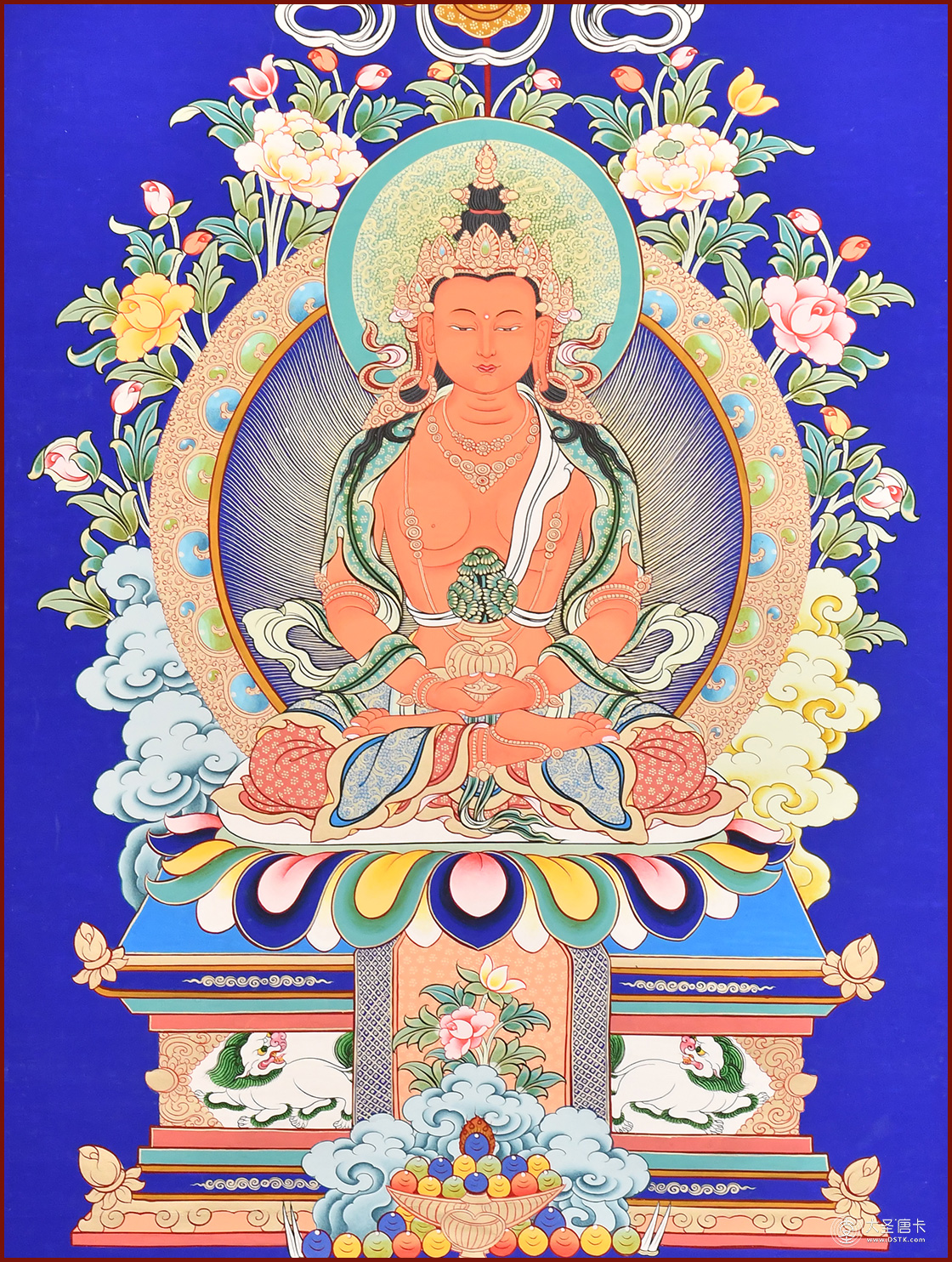 藏傳佛教中其畫像為一面二臂,肌膚紅色,盤發(fā)成髻戴五佛寶冠,上穿天衣,下著綢裙,身佩珍寶瓔珞,具足一切報(bào)身佛的種種莊嚴(yán),雙手結(jié)禪定印于膝上,托長(zhǎng)壽寶瓶,雙足以金剛雙跏趺安住于蓮花月輪上。
