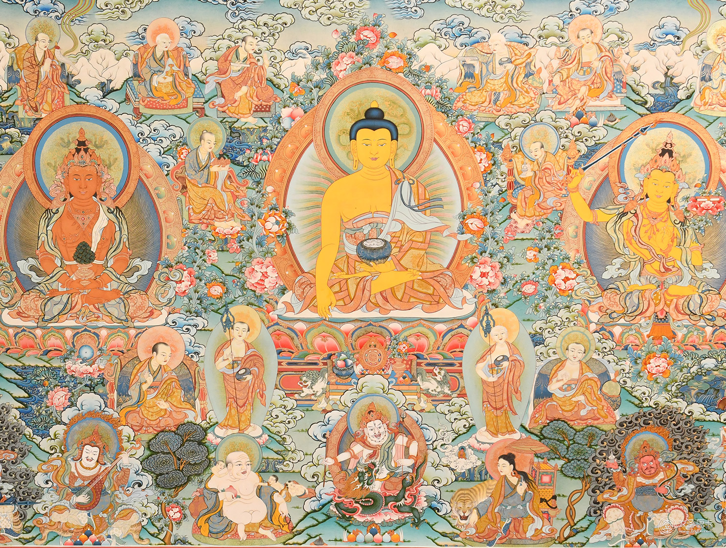 | 唐卡是歷史的瑰寶,現(xiàn)已被例入國家非物質(zhì)文化遺產(chǎn)名錄,得到了高度的重視和保護。同時由于顏料的珍稀、繪制周期長、工藝復雜大大增強了其珍藏價值。一幅好的作品可遇不可求,近年來唐卡已成為收藏界炙手可熱的藏品。 | 唐卡的形式便于攜帶,其內(nèi)容體現(xiàn)了藏傳佛教的莊重、神圣、華貴,被稱為“移動的佛像”。同時也是修行者積累善業(yè),追尋心靈的平靜與安寧的一個過程。 | 唐卡的內(nèi)容包羅萬象,它以圖像的方式承載著藏族文化精髓,是藏族智慧的結晶,廣泛傳播了藏地的文化、歷史和宗教理論。 | 唐卡絢麗的色彩、流暢的線條、嚴謹?shù)慕Y構,都充滿著濃郁的高原和游牧民族風情,無疑是難得的藝術珍品。值得一提的是唐卡繪制顏料全部為天然礦物顏料,畫面效果艷麗,可以保存千年而不變色。 |