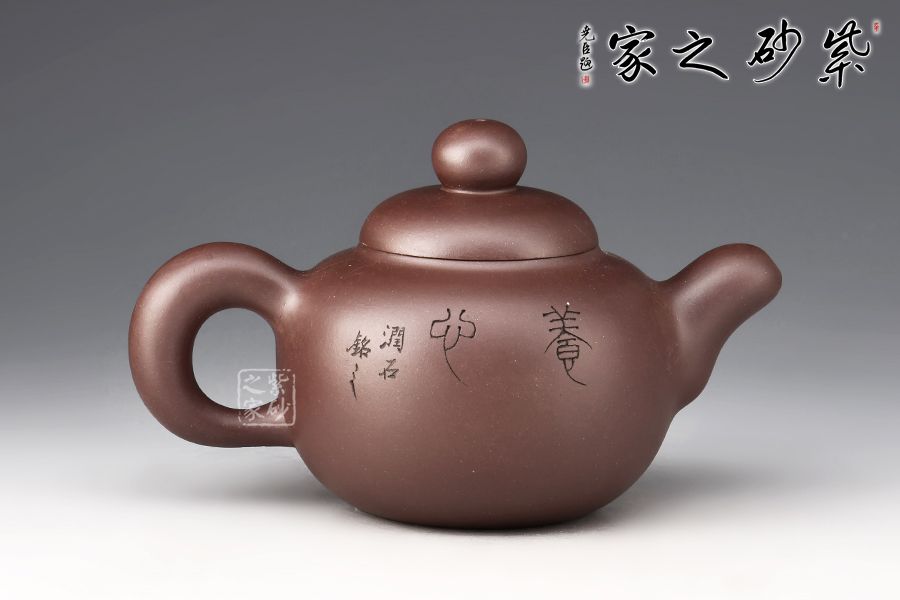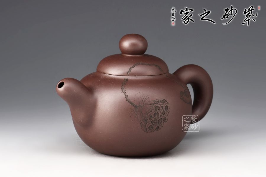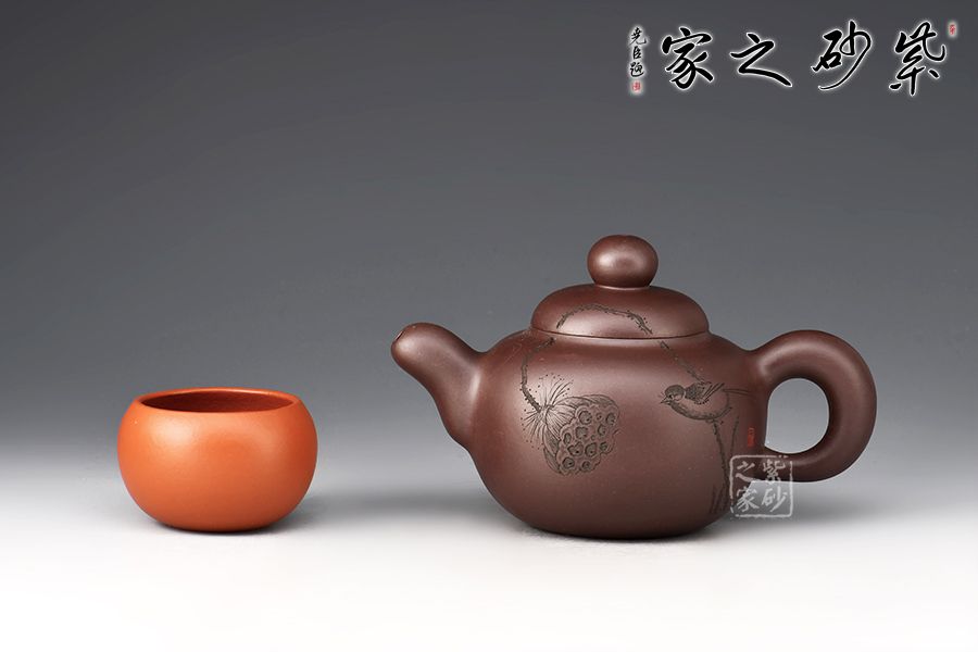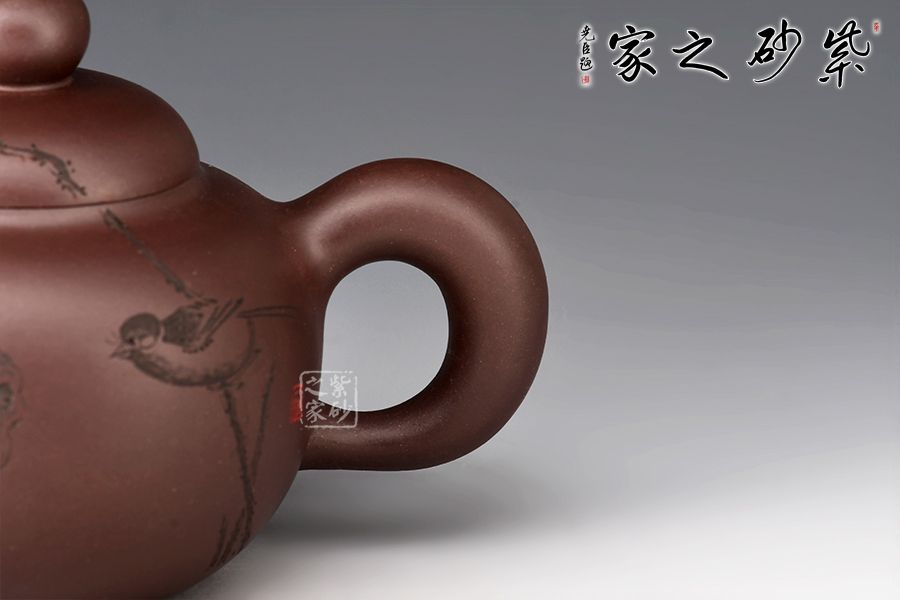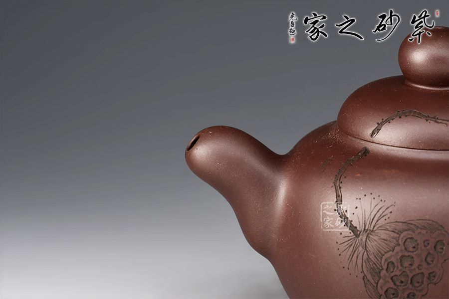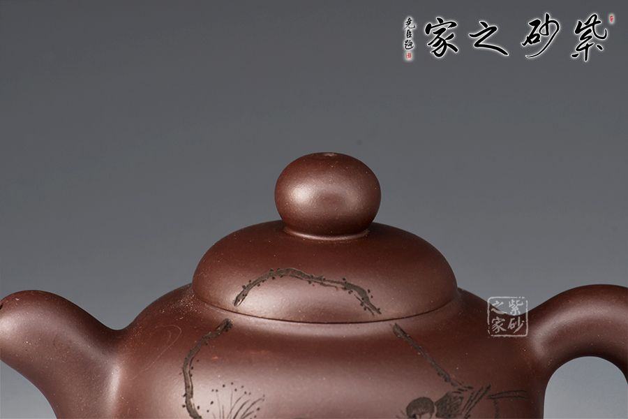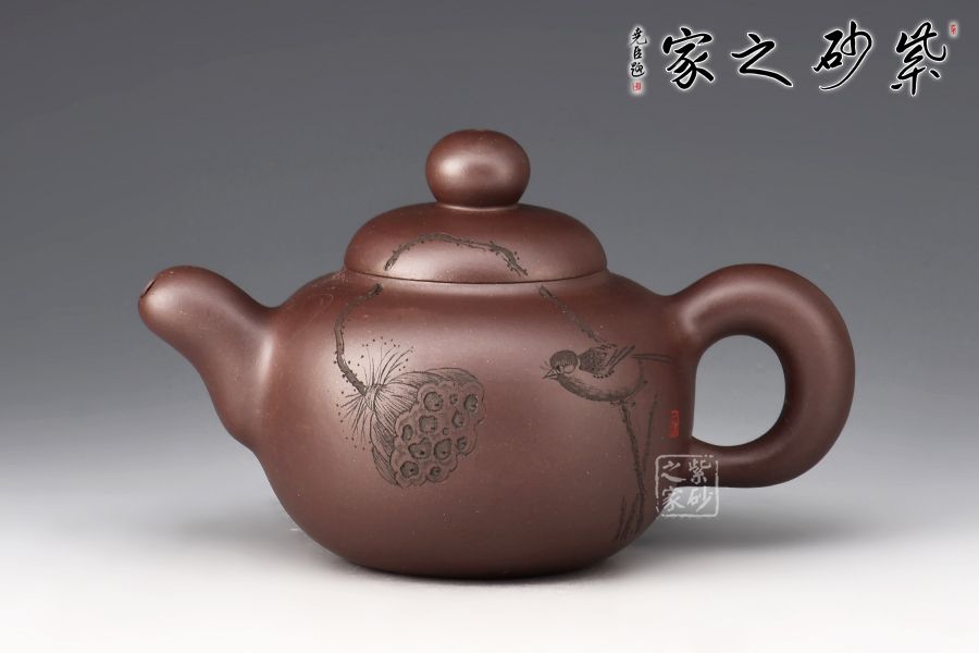 鼓型的身筒,飽滿厚實??谏w緊密結(jié)合,渾然一體。粗把,短嘴,增加了壺體的穩(wěn)定感,全器流露出沉穩(wěn)雄健、典雅凝練的氣勢。壺身雙面陶刻,正面刻繪池塘一角,小鳥嬉戲,蓮蓬,反面刻繪“養(yǎng)心”二字。