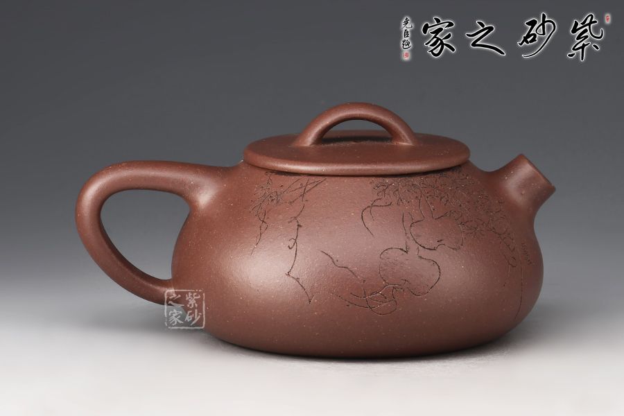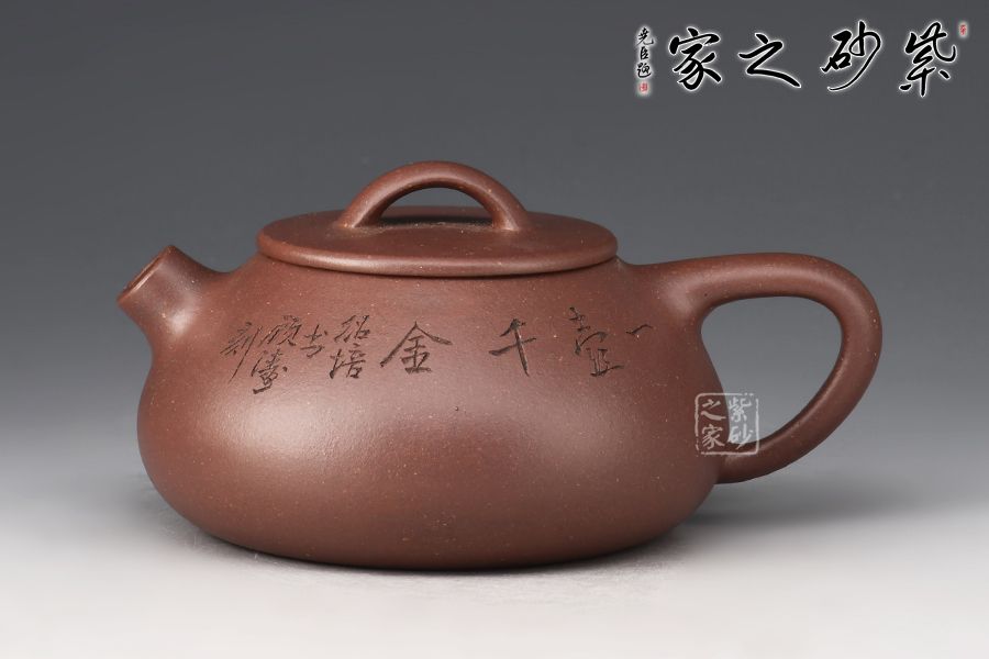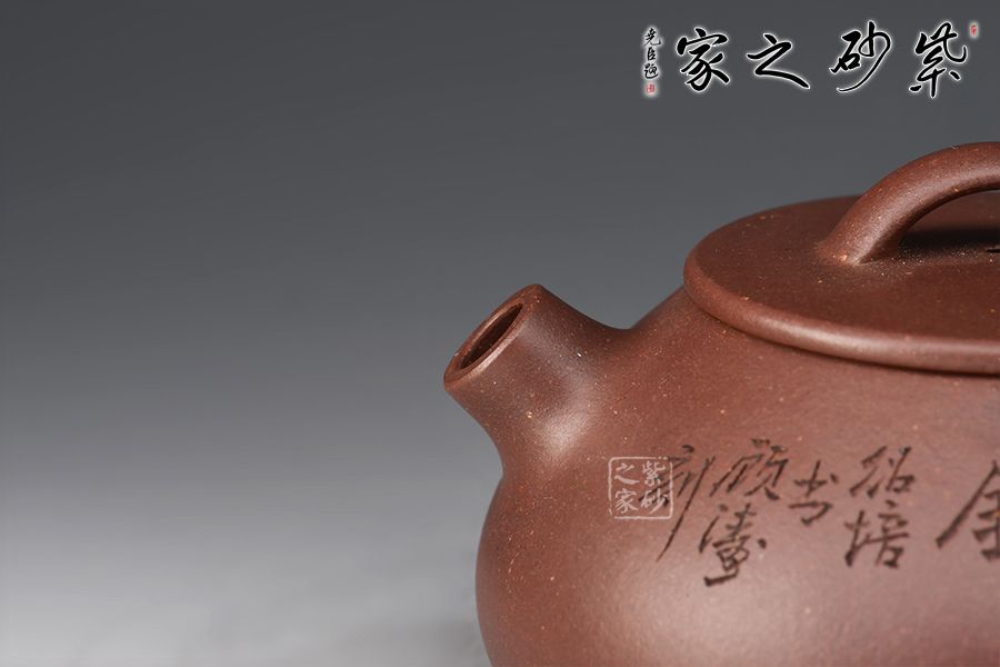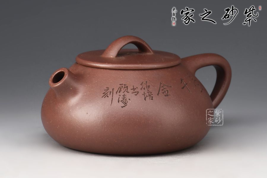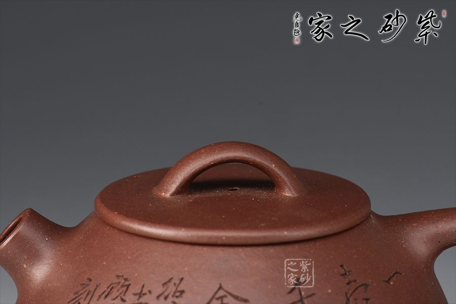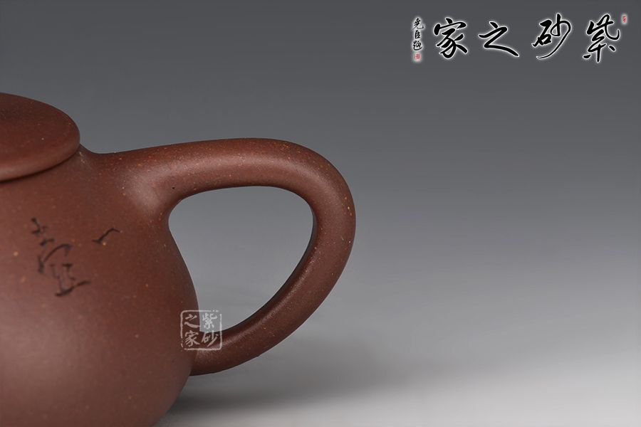 滿瓢整壺線條比較飽滿,底部和腹部弧度優(yōu)美,連成較為圓滑的壺身,壺口較大,降低了總體重心,產(chǎn)生一種橫向感覺。橋鈕搭接在平蓋之上,直流短嘴,三角把有力,略見憨態(tài),透露幾分柔美,文人氣息頗濃。
