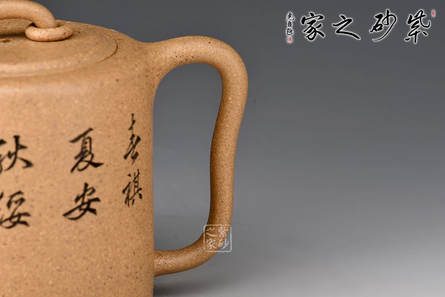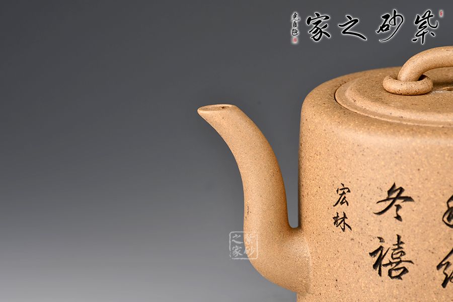 雙圈壺顧名思義,壺鈕上有兩個(gè)圓環(huán)相繞,次款雙圈壺在傳統(tǒng)基礎(chǔ)上加以微調(diào),壺體直筒,簡約大方,顯示挺秀、舒展的線韻之美。平肩、平嵌蓋,蓋的同步縮比為直筒橋梁式,一雙鎖環(huán)環(huán)繞,與壺體凸顯呼應(yīng)之勢(shì),嘴與把細(xì)長舒展,與筒身間距適中,握把舒適,出水流暢,端放穩(wěn)重。壺身筒較高,適合沖泡發(fā)酵類茶葉。