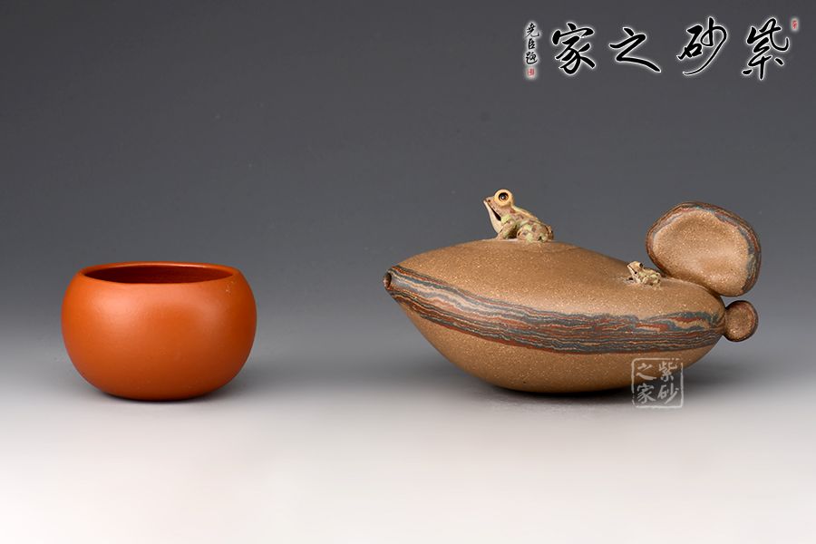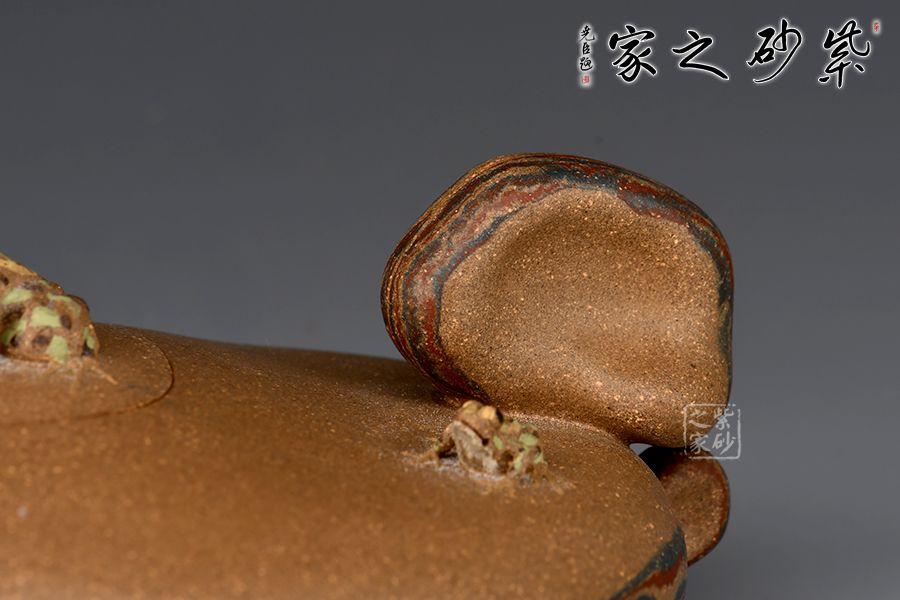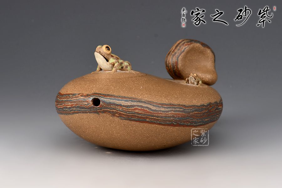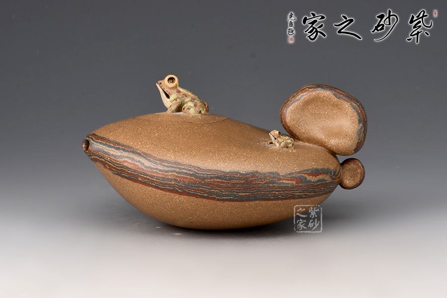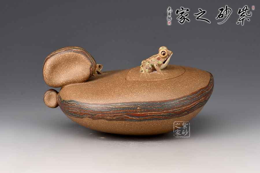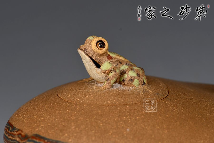 壺嘴小巧,嵌蓋與壺身為一體,壺鈕為一只遠(yuǎn)眺的青蛙,整壺動(dòng)態(tài)十足,完全打破了紫砂壺的固有形態(tài),有一種難以表達(dá)的美感!