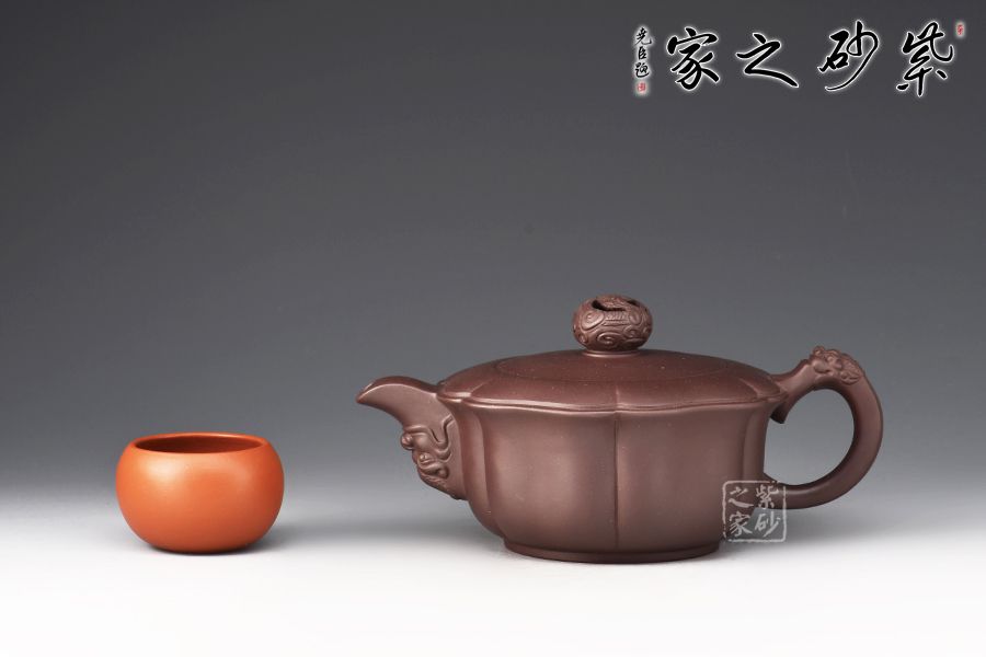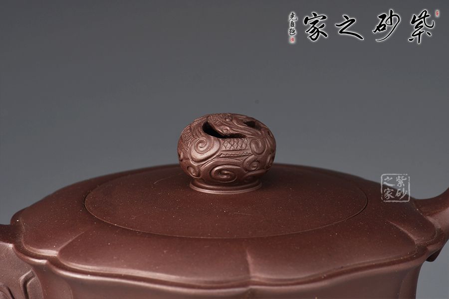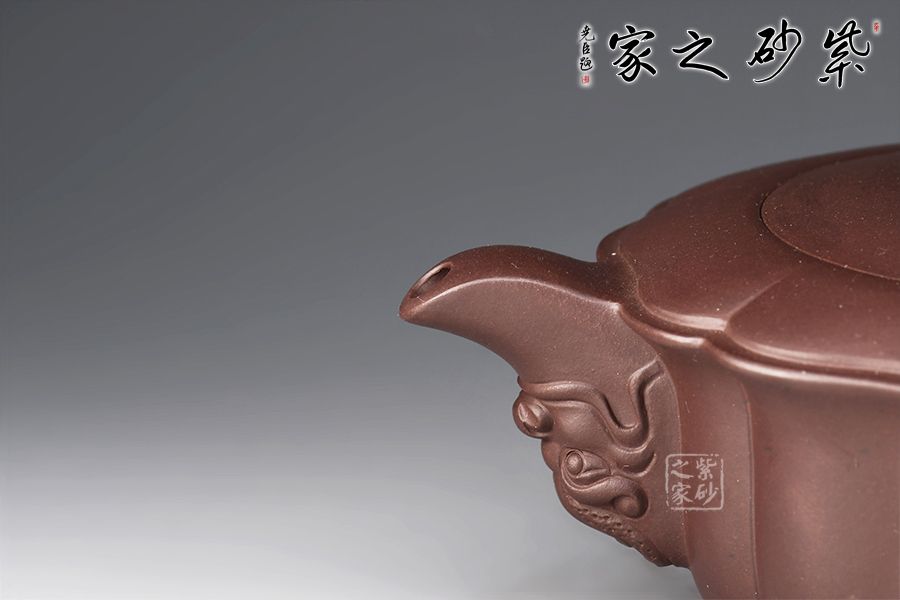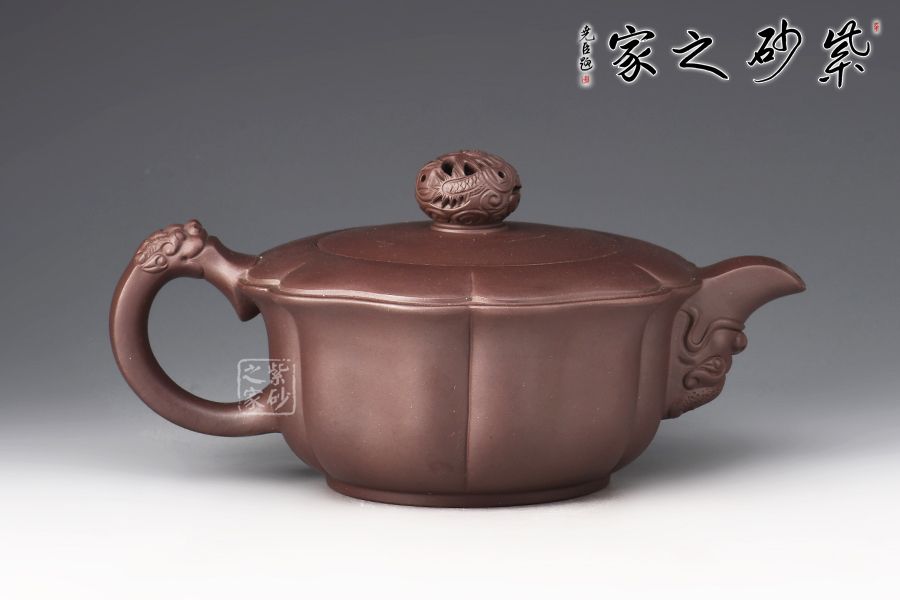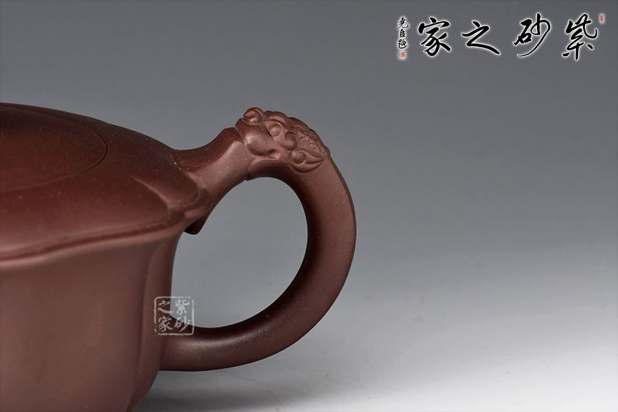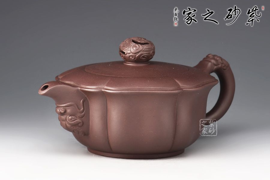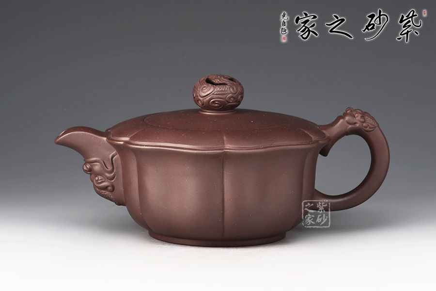 此壺壺身為碗狀,筋紋將壺身等分,比例得當(dāng),簡練大方,制作頗見功力。壺流、圈把即壺鈕皆以祥龍裝飾,寓意吉祥如意,特別是壺鈕有畫龍點睛之感,別樣美觀,點名主題。正高級工藝美術(shù)師高建中老師手制,師從中國工藝美術(shù)大師顧紹培,高工江建翔和鮑利安,功底深厚!