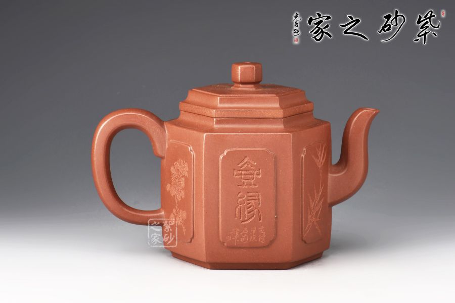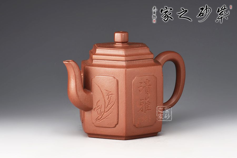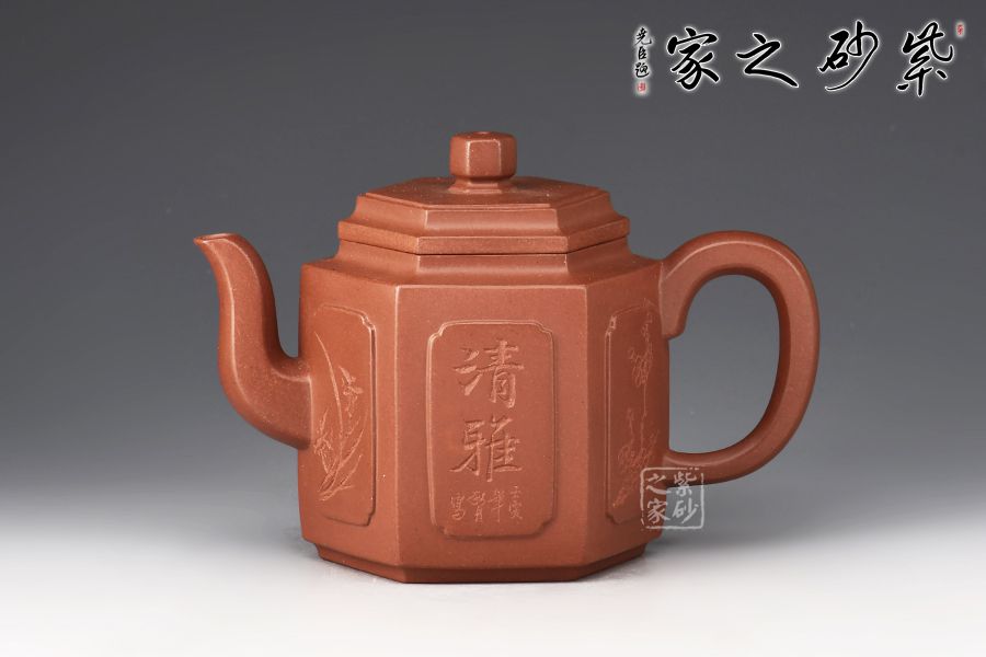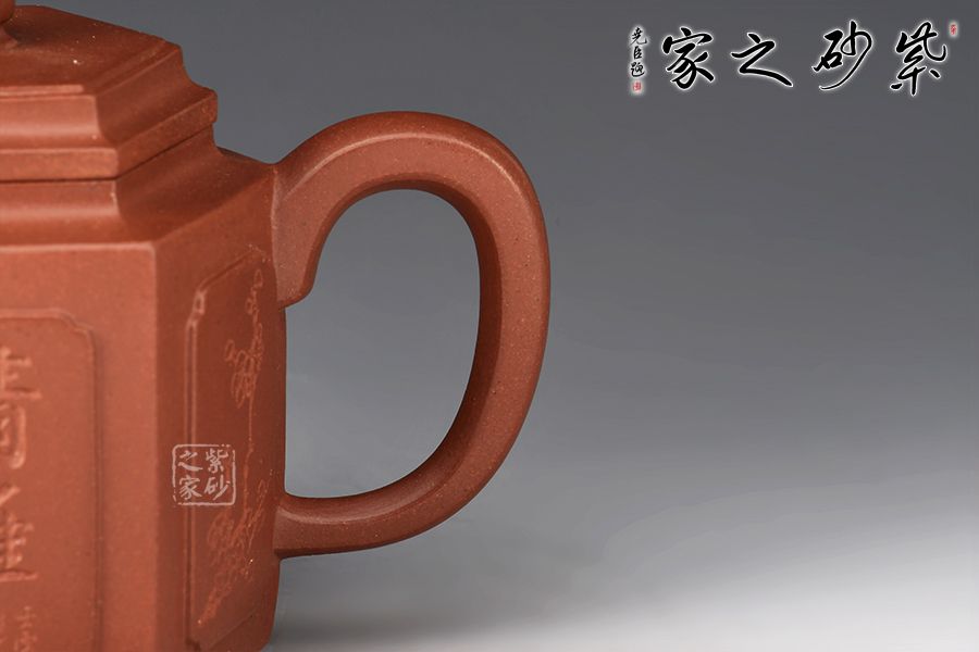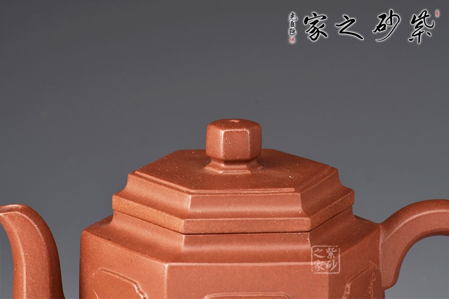 此壺身筒高挺,線條挺括,壺身由六片大小相同的長方泥塊鑲接組成,形態(tài)自然,銜接流暢。三彎流出水爽利,耳形也是棱線修飾,寓方于圓,更顯大方。蓋面亦六方,口蓋嚴絲合縫,以六方立體形蓋鈕為中心點,通貫六棱,直達壺底,線與線、線與面形成起伏節(jié)奏,剛柔并濟。