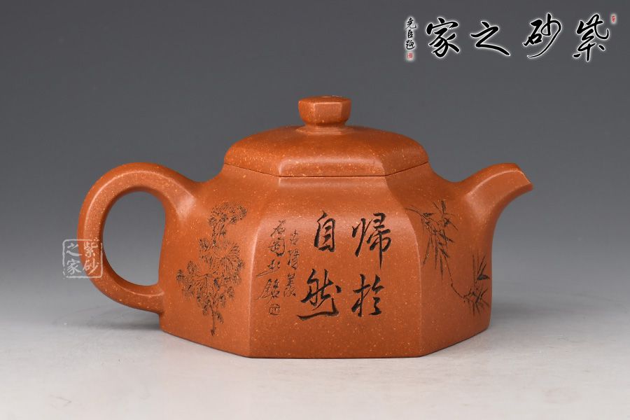 特點(diǎn):原礦因含緞泥、紅泥、紫泥等諸多共生礦,陶之后,于深沉之“橙紅色”底上,滿佈五彩斑斕的粗細(xì)、深淺之紅、黃星斑點(diǎn)。