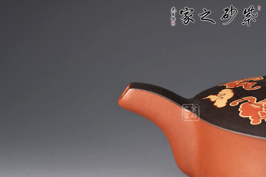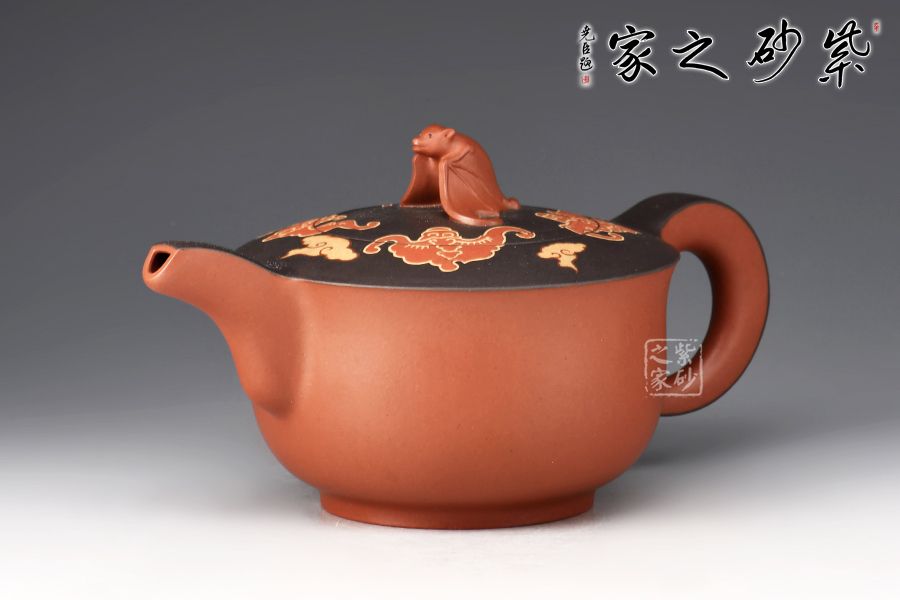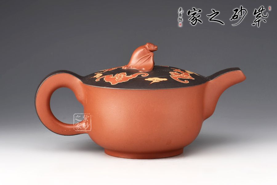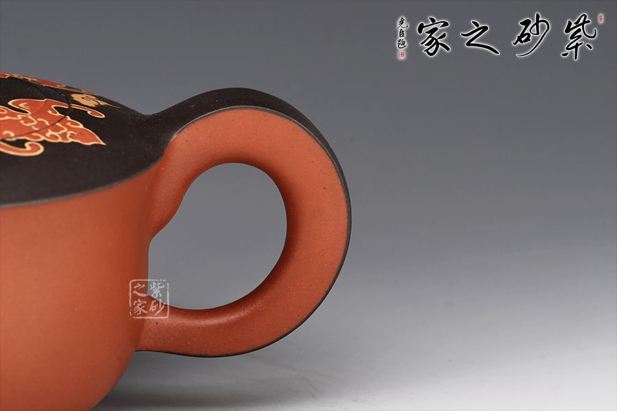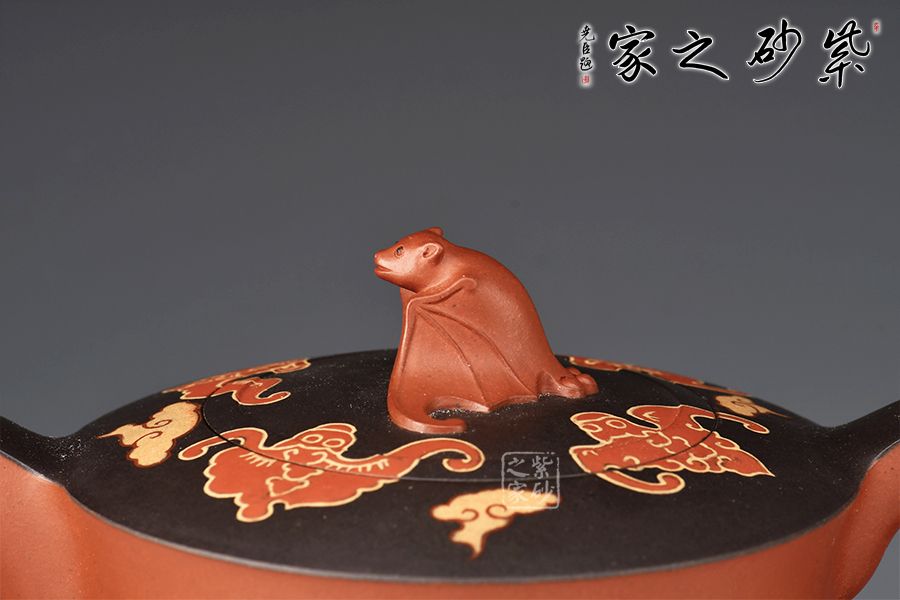 此壺以“福從天降”為主題,壺身似碗,飽滿有力,彎流嘴、平肩與把手平背形成一個(gè)平面,使流與把左右虛實(shí)對稱,嵌蓋設(shè)計(jì)讓其與壺身融為一體,蝙蝠壺鈕契合主題,與壺蓋之上琺瑯彩裝飾的祥云圖案呼應(yīng),有著美好的祝福之意。