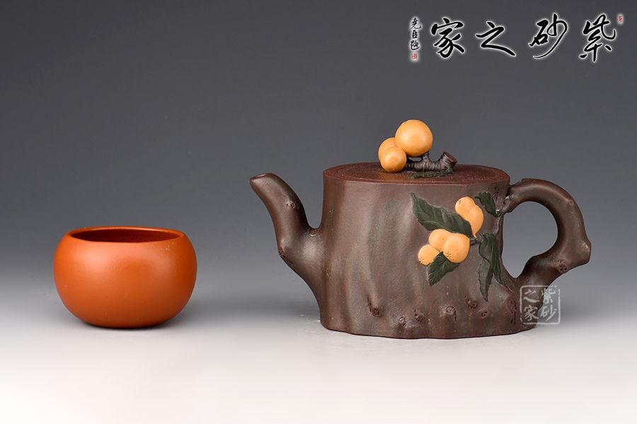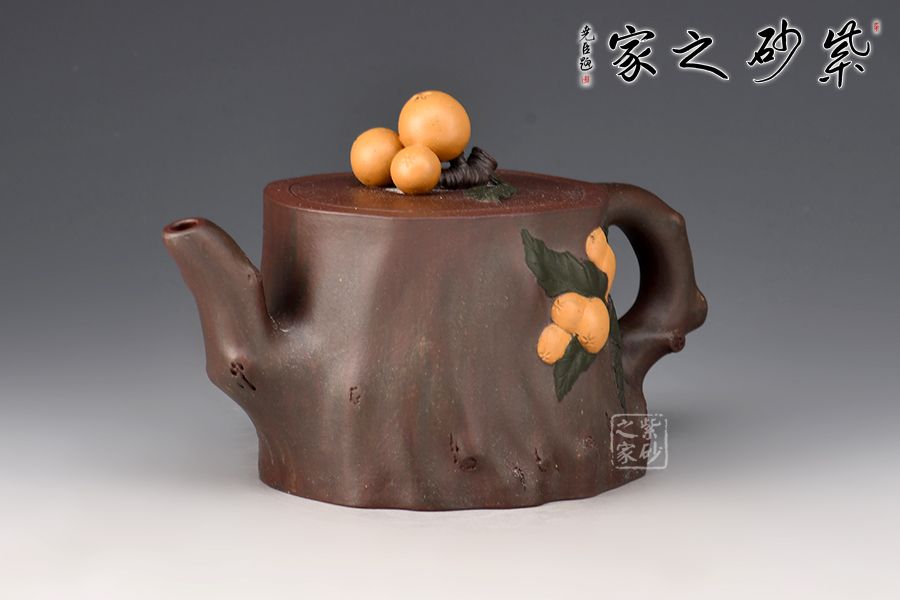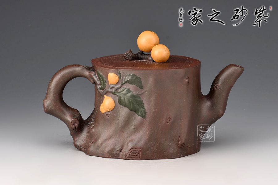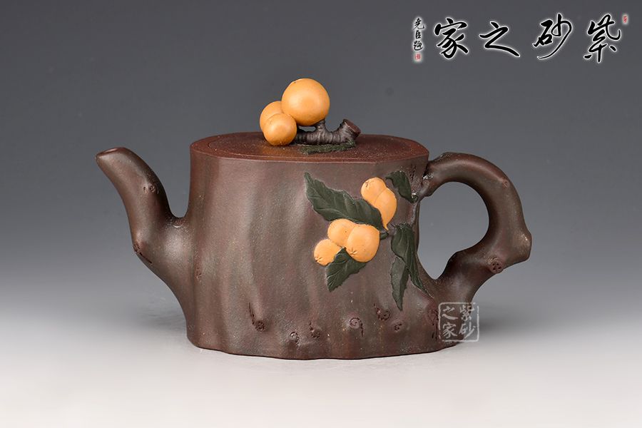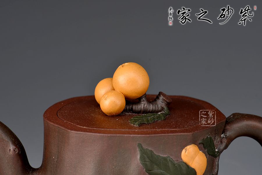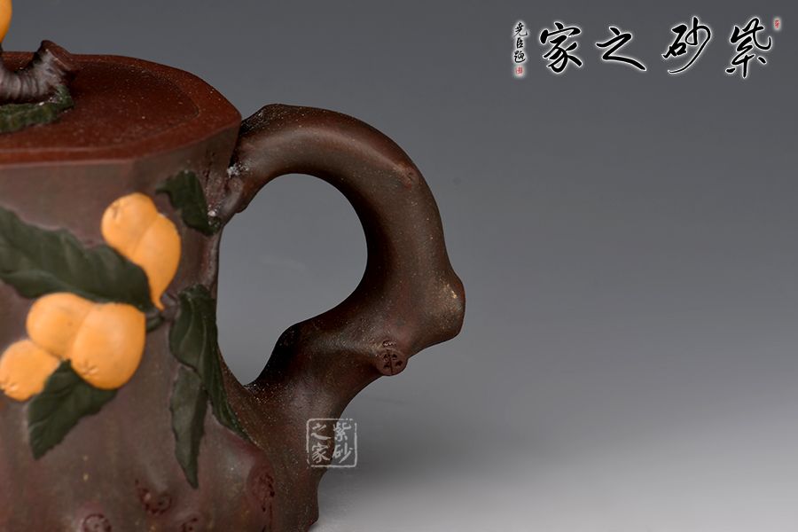 粗壯的枇杷樹干為器身,呈寫意的橢圓形,嘴、把塑成枇杷樹的細枝,粗糙任意,保留其自然形態(tài)。作品以江南鮮果枇杷為創(chuàng)作題材,充分運用紫砂材質(zhì)豐富的色彩及傳統(tǒng)工藝中花貨的裝飾手法,色彩自然豐富,布局美觀合理。