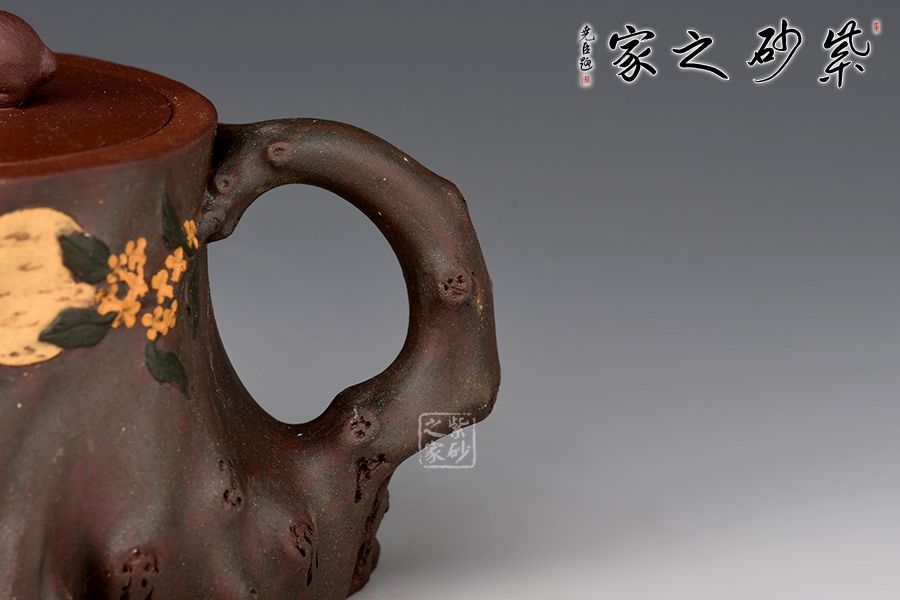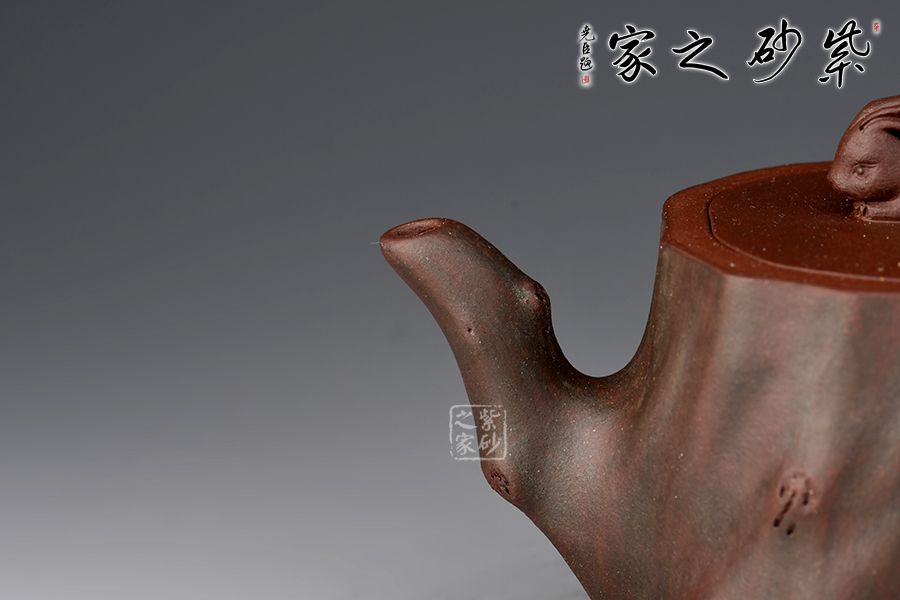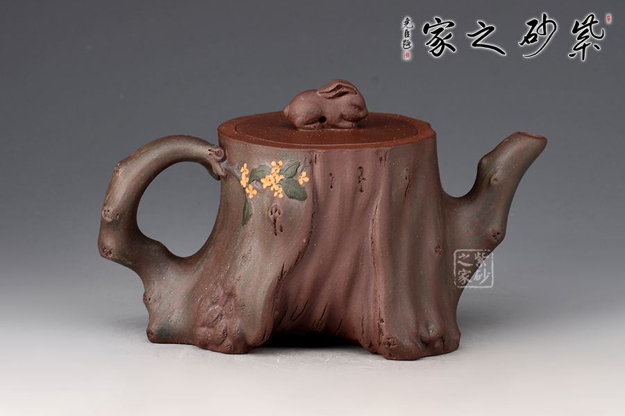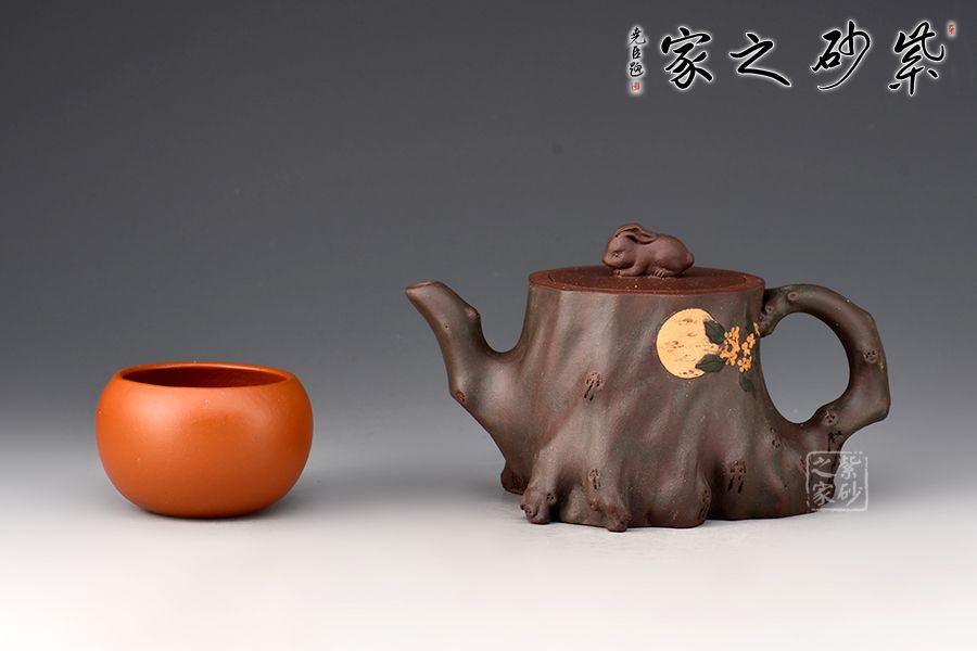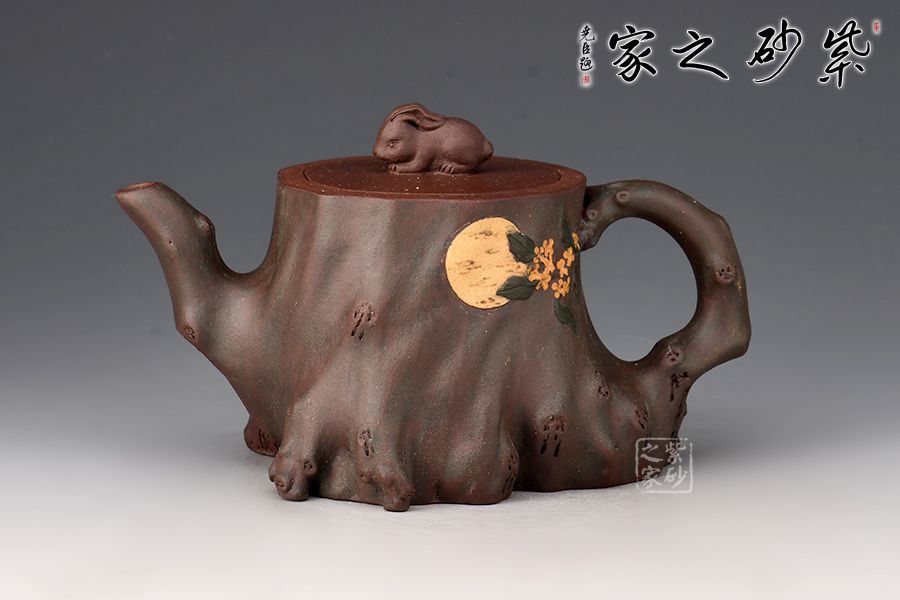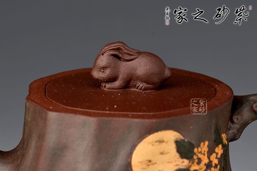 壺身用了樹樁的形象,一輪圓月明澈穹宇,桂花樹樁上,一只月兔靜靜守月,桂花樹、玉兔、明月構(gòu)成了一幅中秋團圓圖。作品絕妙之處,莫過于壺底巧妙的表現(xiàn)了一幅中國地圖。樹樁穩(wěn)妥古拙,枝干蒼勁,是堅強與不屈的象征,它象征著自強不息的中華民族。此款《中華根》是一件工藝近乎完美,內(nèi)涵極高的紫砂作品,寓意深遠,情真意切。