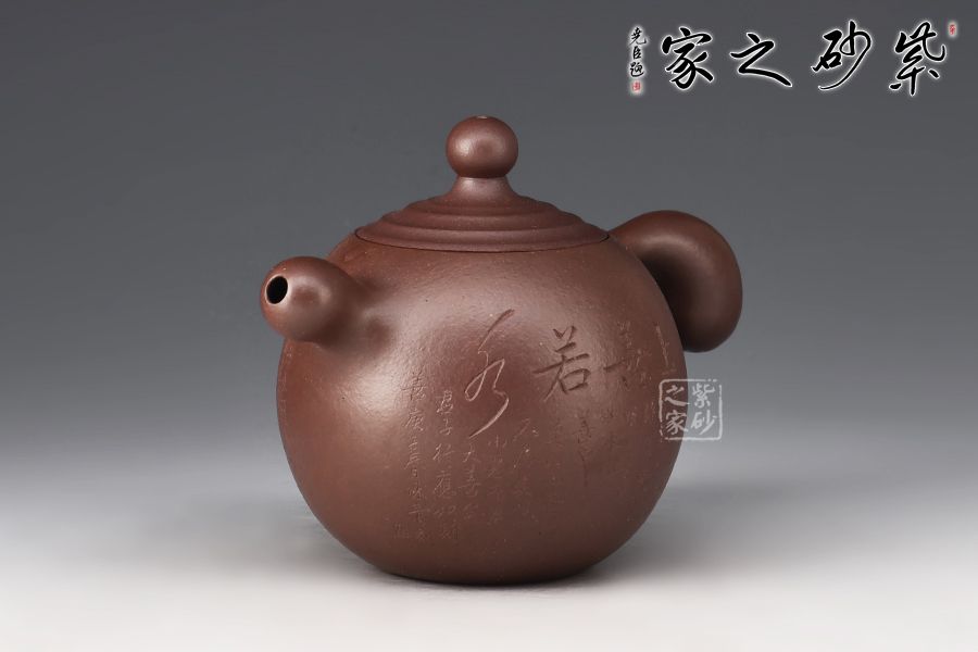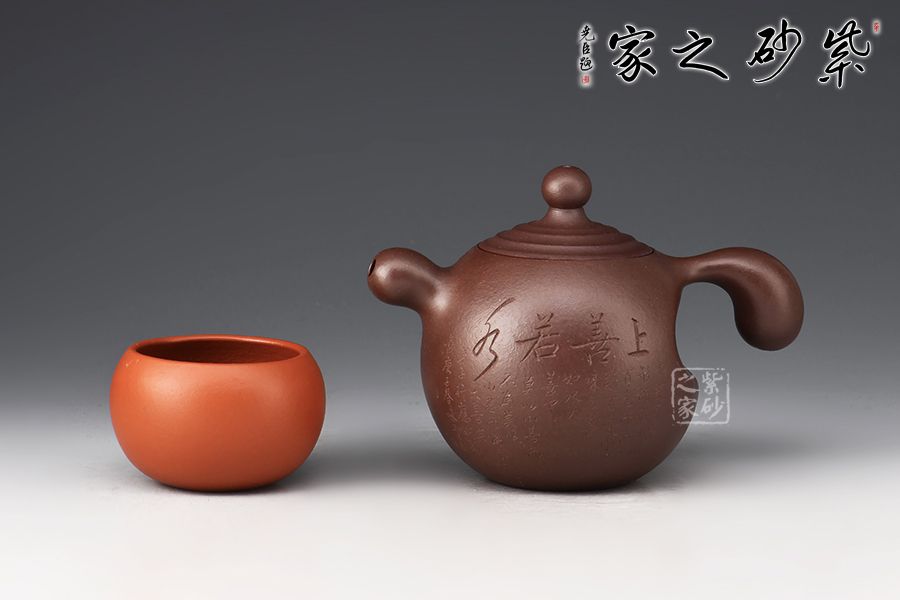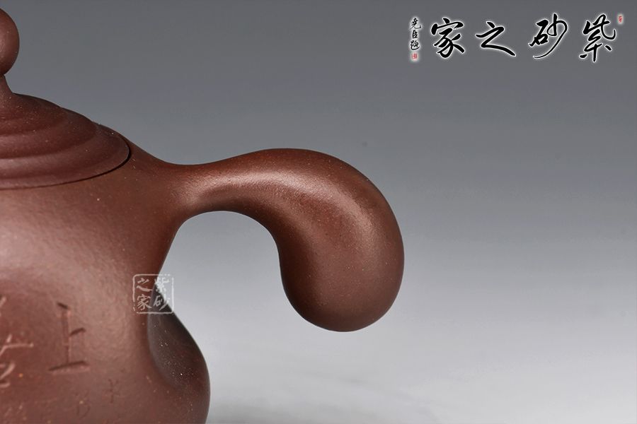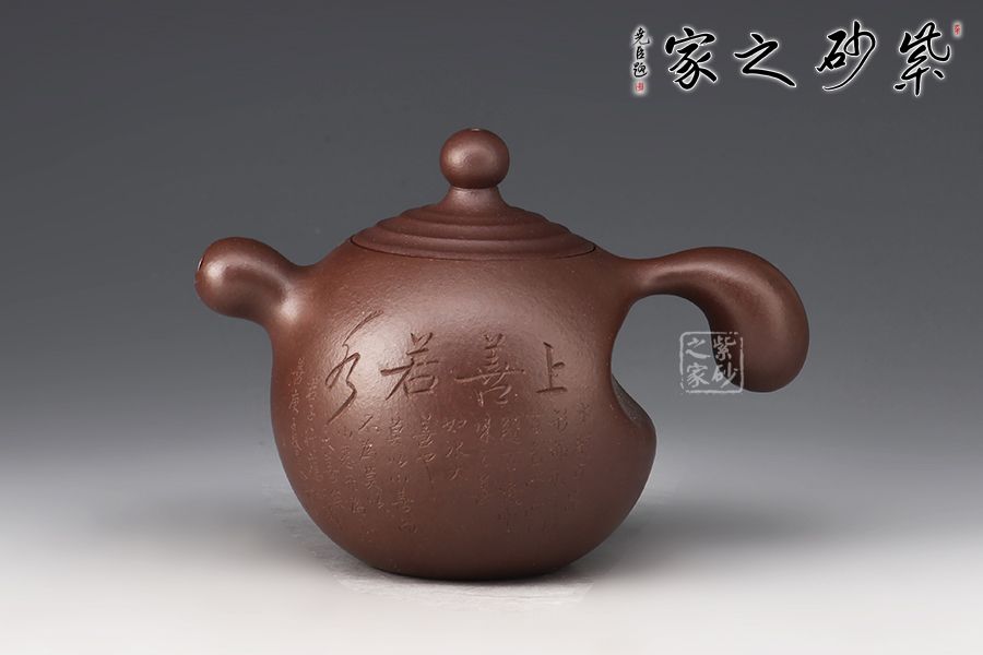 此壺名為點滴,可謂匠心獨運,壺身各部件都可以看作是一滴水,特別是壺鈕,壺蓋上凸起的筋紋好似陣陣漣漪,此壺的壺把也比較特別,拿起來特別方便,壺身刻繪“上善若水”,好壺好構思,妙!