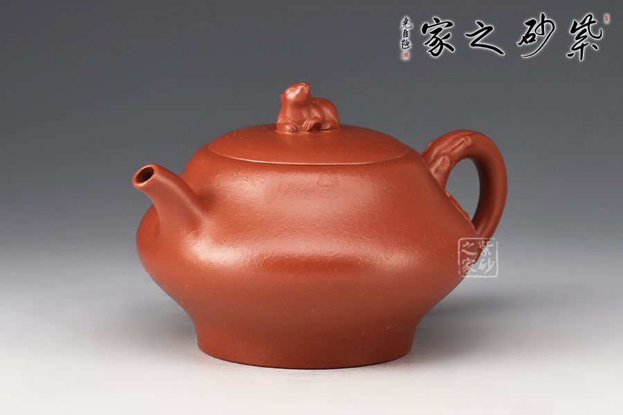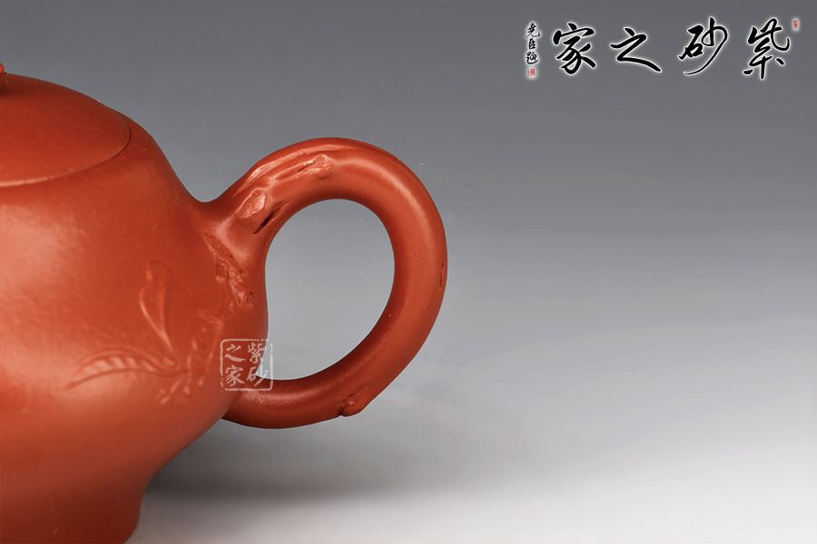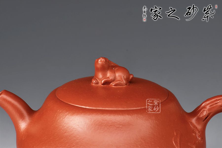 整壺以賀歲作為基本主題進(jìn)行紫砂創(chuàng)作,形式上的卯兔表現(xiàn)出一種對(duì)稱均衡的穩(wěn)重感。壺身飽滿,卯兔作壺鈕,口沿與壺身接合圓潤(rùn),腰身獨(dú)具匠心,花枝從壺把延伸至壺體,端把枝干遒勁纖細(xì),與整體通貫一氣,制作精工考究。整體觀之,以禪心入器,秀麗飄逸,精巧勻稱。