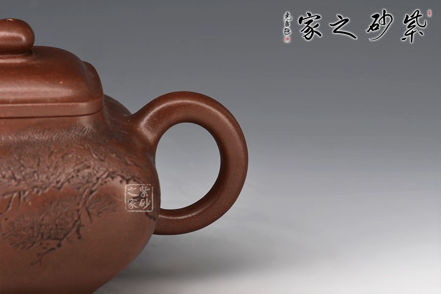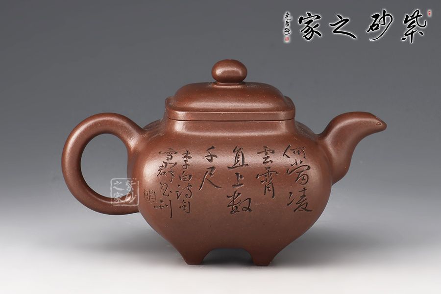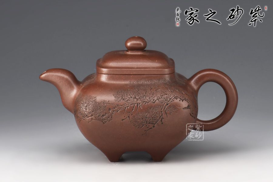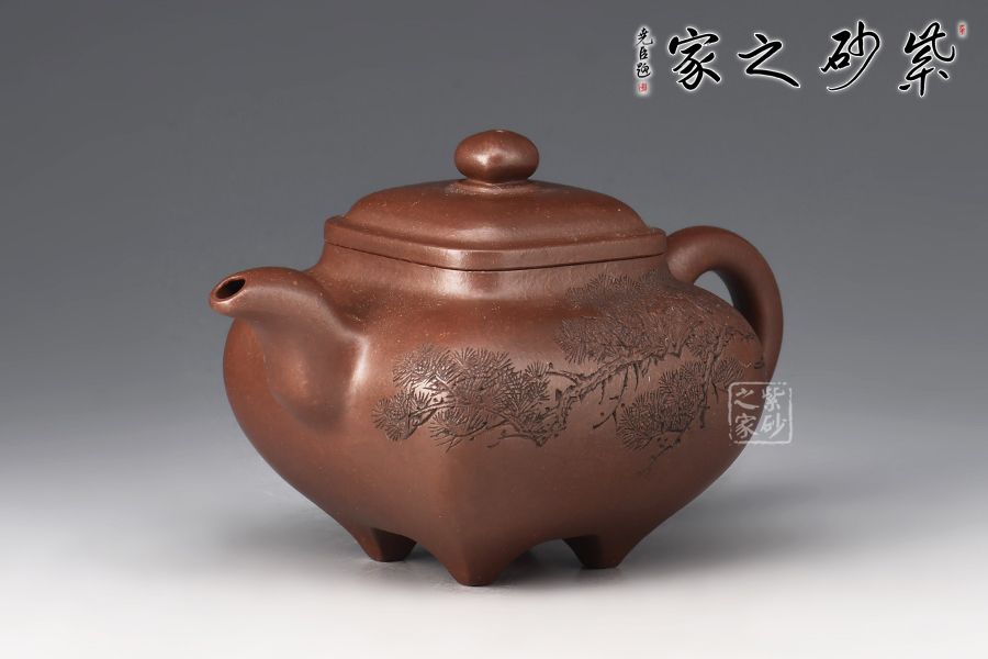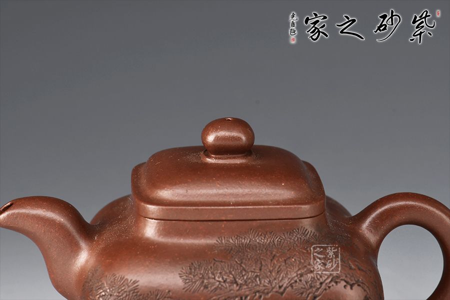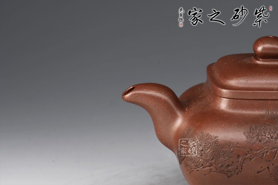 此壺色澤醇厚內(nèi)斂,富有更多的神秘和細(xì)膩;器身形狀以方器為基本形,但方中寓圓,比一般方器多了一份圓潤(rùn)之美;壺嘴的造型難度亦高,彎流式曲折有致,出水流暢;壺蓋為四方型圓角,壓蓋形式,制作精良;底足皆采用四顆“釘足”形式,精巧別致,落地穩(wěn)重。