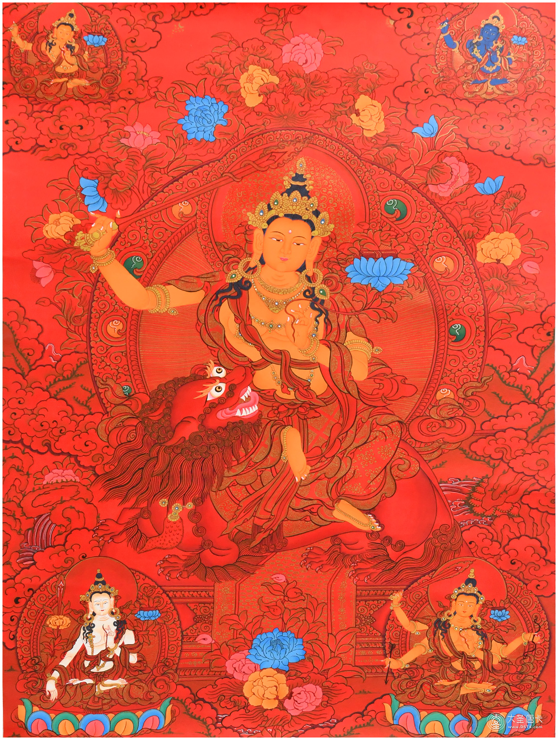 文殊菩薩為諸佛、諸菩薩之師,是大智慧的象征,智慧無雙,有開悟明智的加持力。通常手持慧劍,騎乘獅子,比喻以智慧利劍斬斷煩惱,以獅吼威風震懾魔怨。