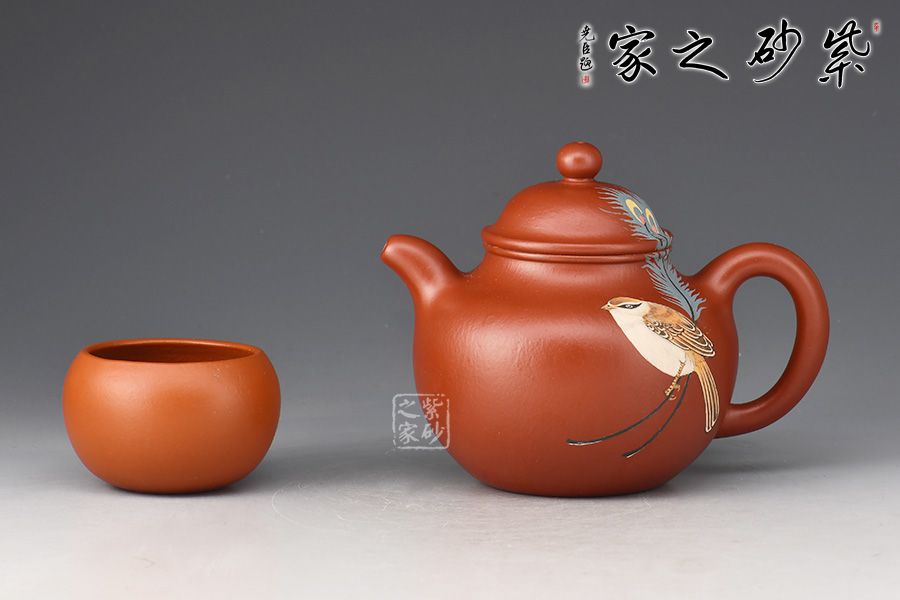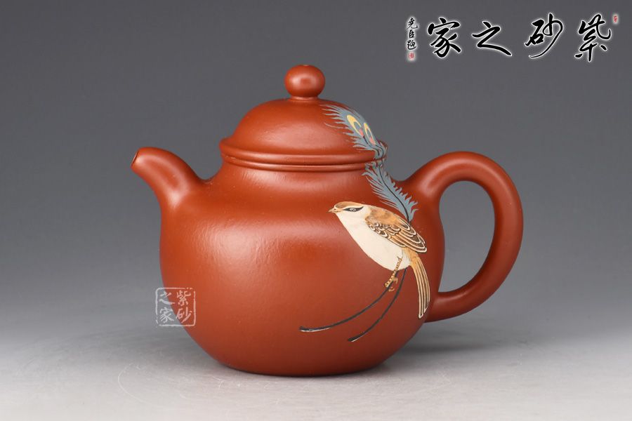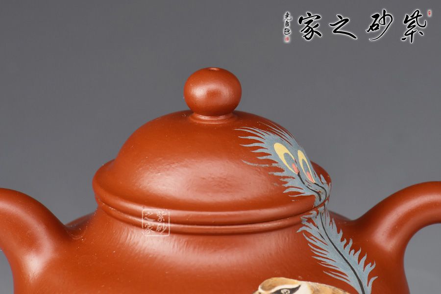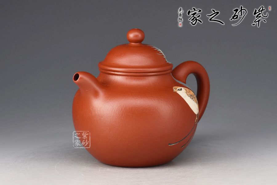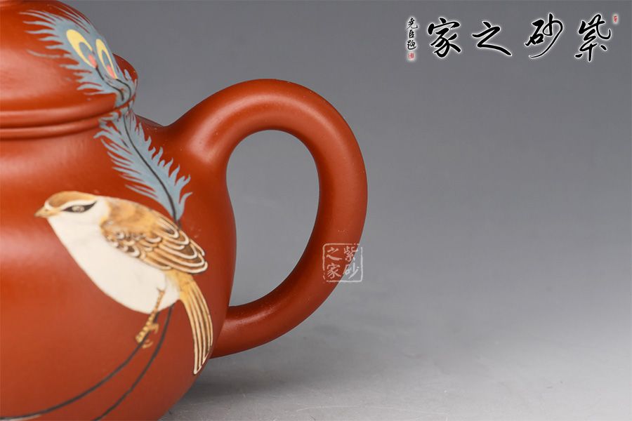 蓮子,乃經(jīng)久不衰之經(jīng)典圓器造型。此作精選原礦朱泥作胎,全手精工所制,泥色亮麗,好泡養(yǎng)。身筒圓潤如寶珠,肩頸線條的處理,壺腹下部的收底,都處理得恰到好處。鈕、蓋至壺身層次感分明,流、把比例得當(dāng),古樸雅拙。泥繪裝飾,小鳥、羽毛,栩栩如生。簡練的線條,勾勒出古器之美蘊,經(jīng)典實用,賞用俱佳。