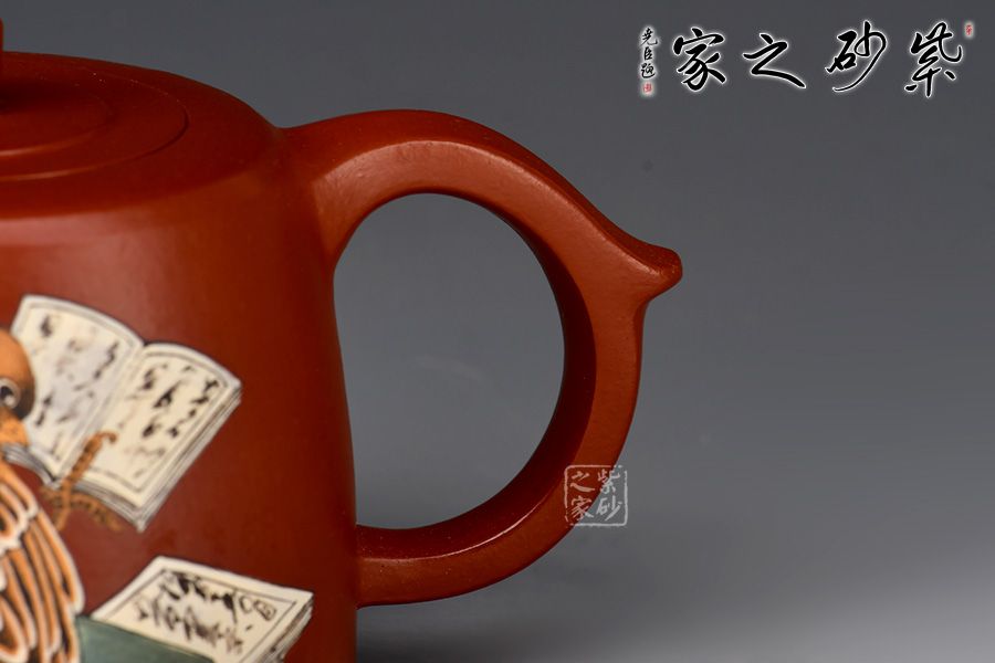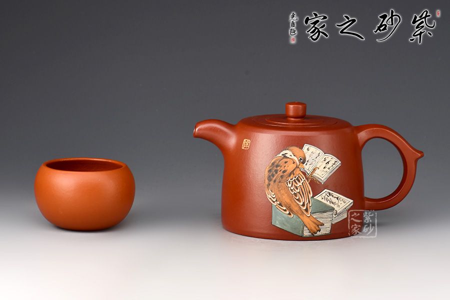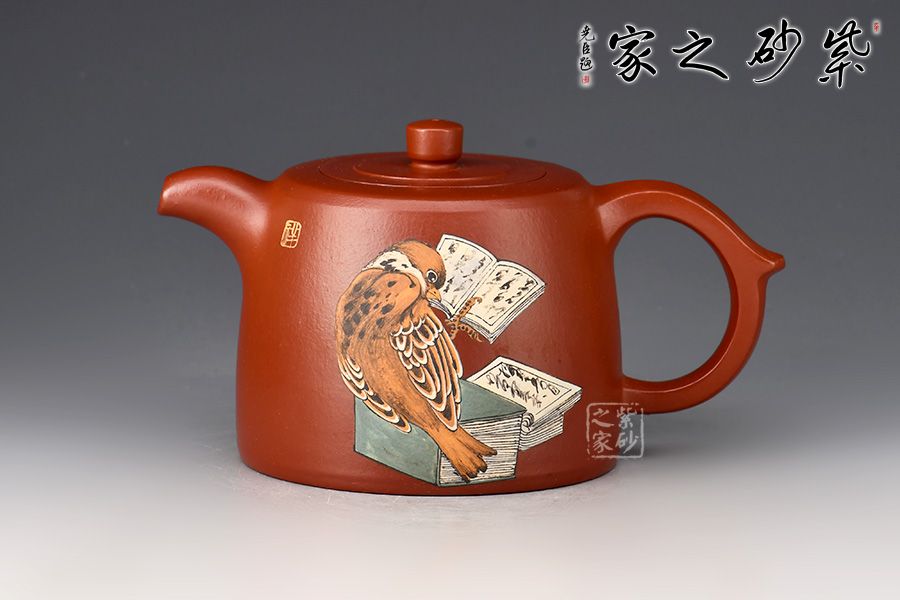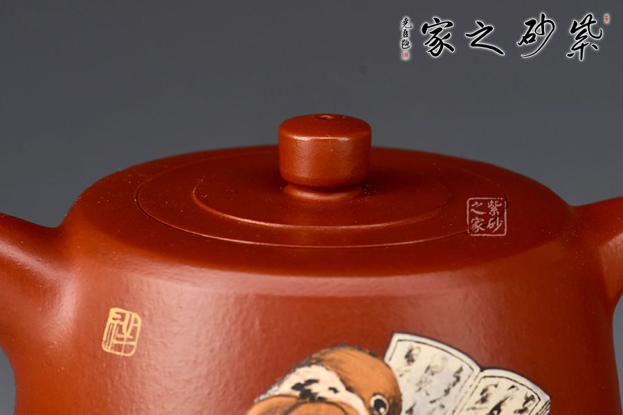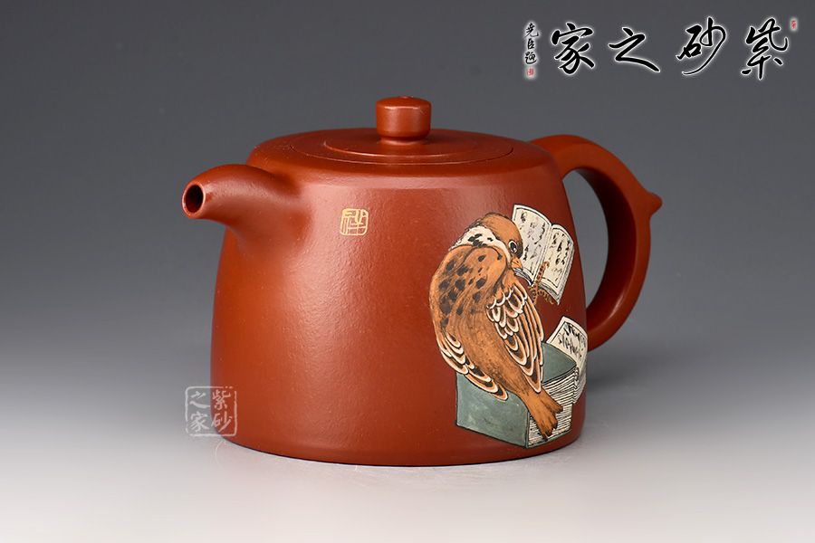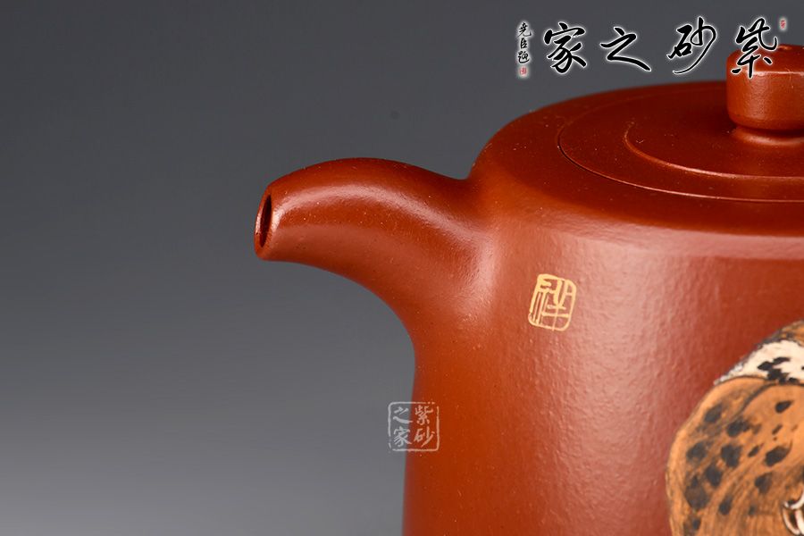 此壺為作者精選原礦朱泥,全手工精制而成。造型簡素樸拙,線條簡潔明快,圓柱體壺身氣韻飽滿,嵌蓋蓋面作多圈裝飾,與柱鈕之形相互映襯,卓顯古雅。一彎流曲而微妙,耳把則呈倒鉤形,一點飛龍飾于把中,盡顯悠揚氣勢,各部件搭配得恰到好處。壺腹彩繪裝飾,,色澤運用得當,賞用藏皆可。