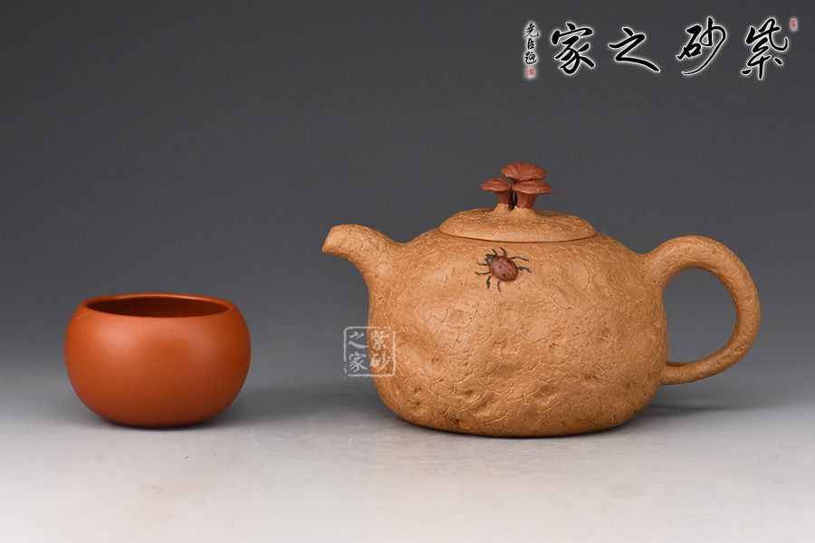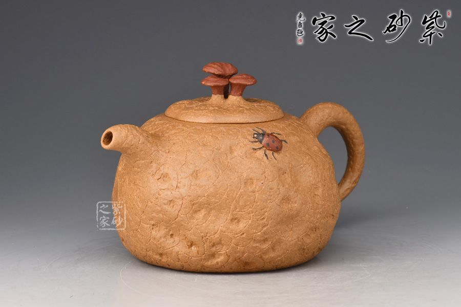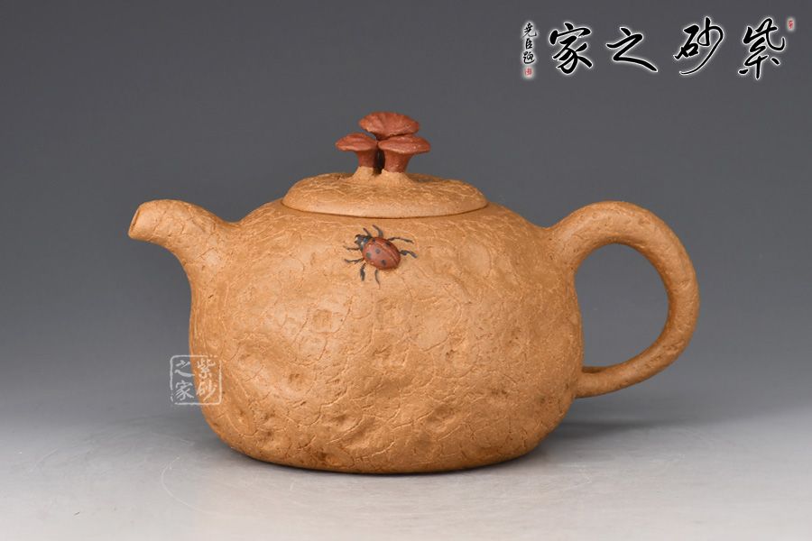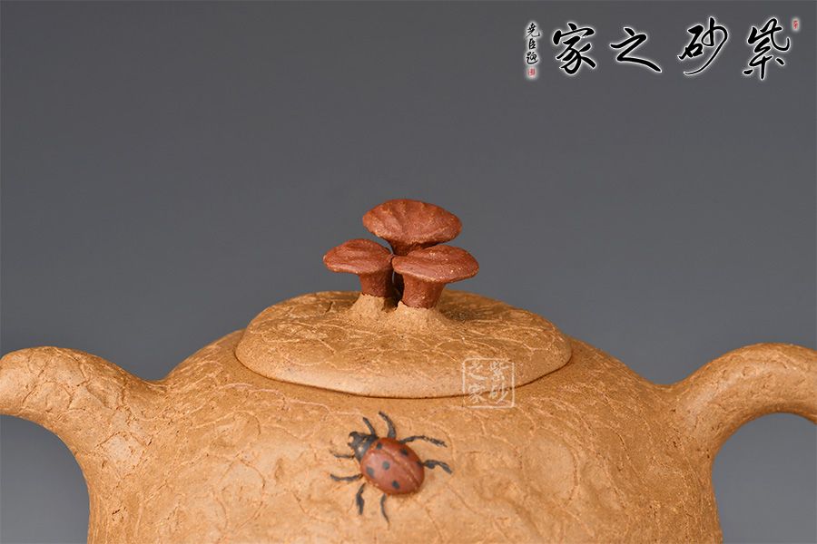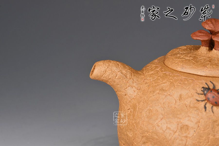 此壺為作者選用原礦段泥,全手工精制而成。壺身扁圓,運(yùn)用嫻熟的手法塑就樹癭滄桑斑駁的紋理,刻畫細(xì)膩,老味十足。靈芝為蓋,流、把化為枝干,壺流一彎,壺柄自然垂落,末端分叉而為。一只瓢蟲趴于壺身,花紋清晰可見。