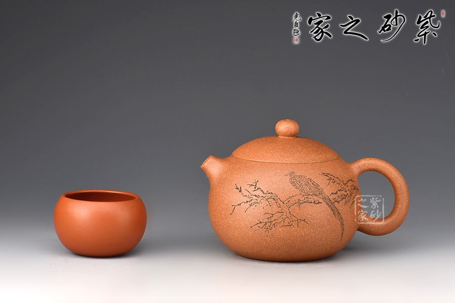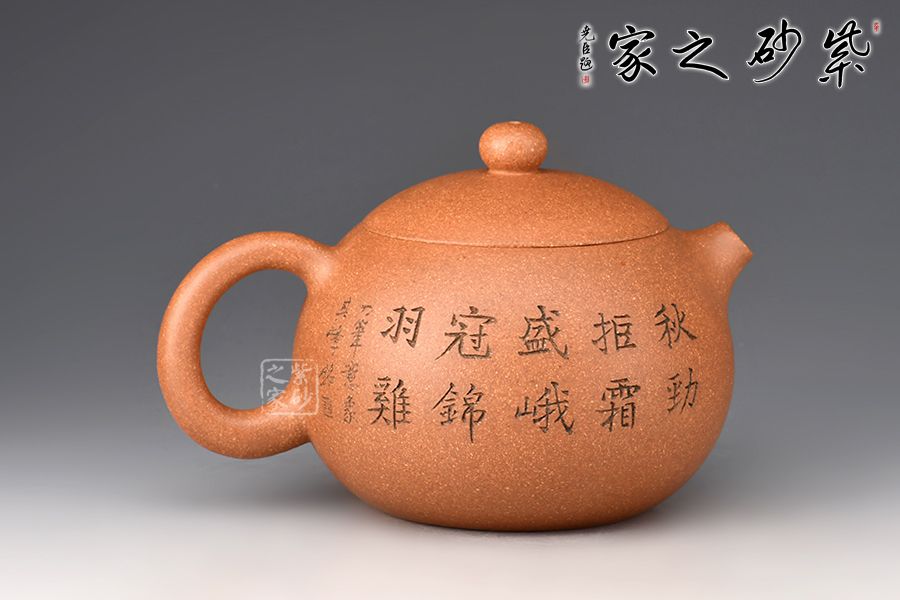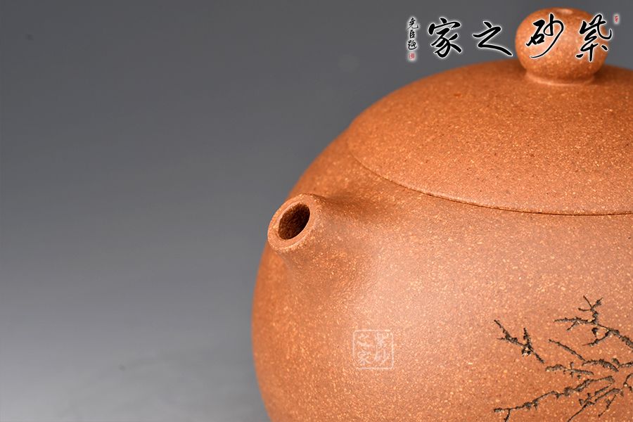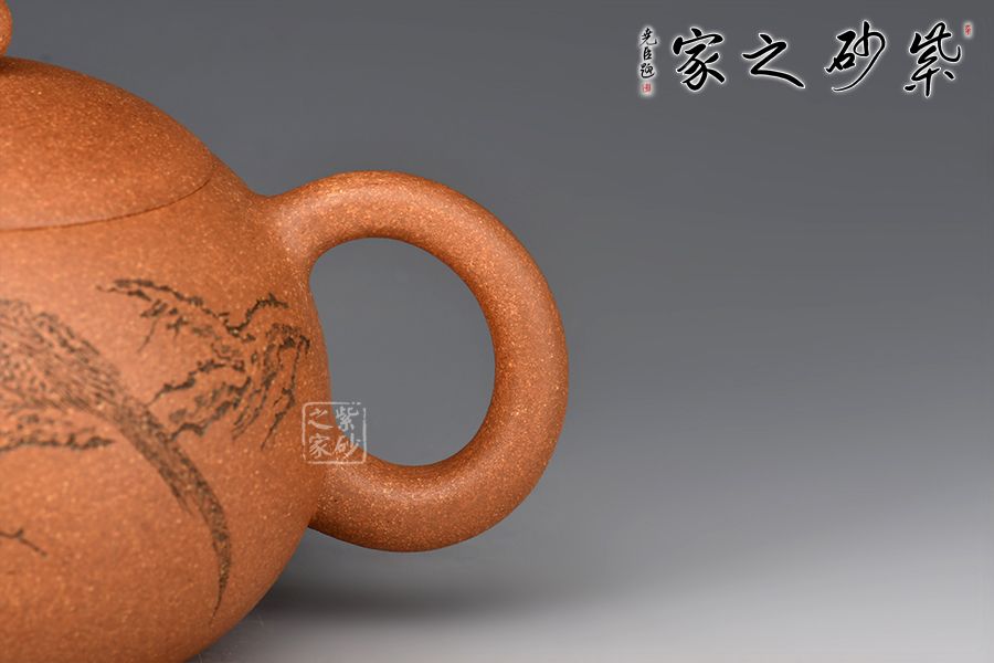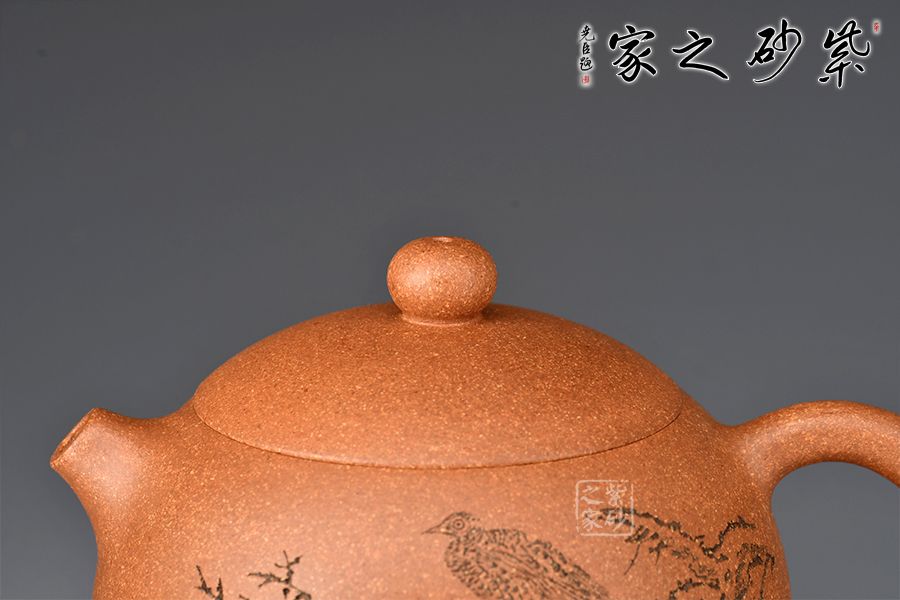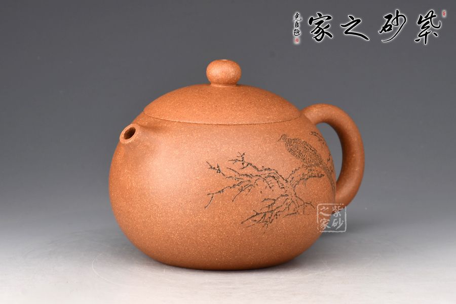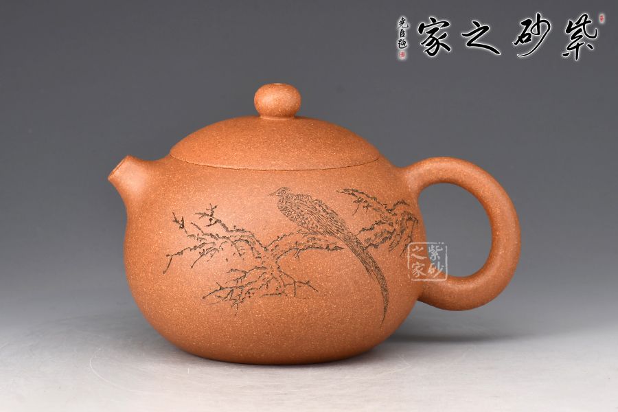 西施壺,傳統(tǒng)經(jīng)典器型,經(jīng)得起長久玩味,壺身線條舒緩柔美,簡練俊美,通身豐潤飽滿,雍容華貴;直流型壺嘴更顯得嬌小可愛,且出水利落,圓珠壺鈕拿捏便利,倒把更是端握適手,實用性佳。壺身陶刻野雞圖,寥寥幾筆刻畫的栩栩如生,賞用藏皆宜。