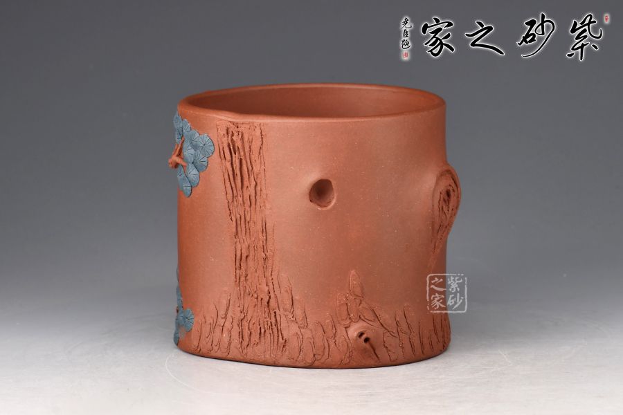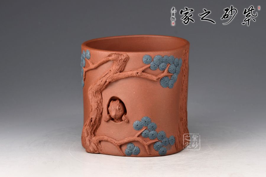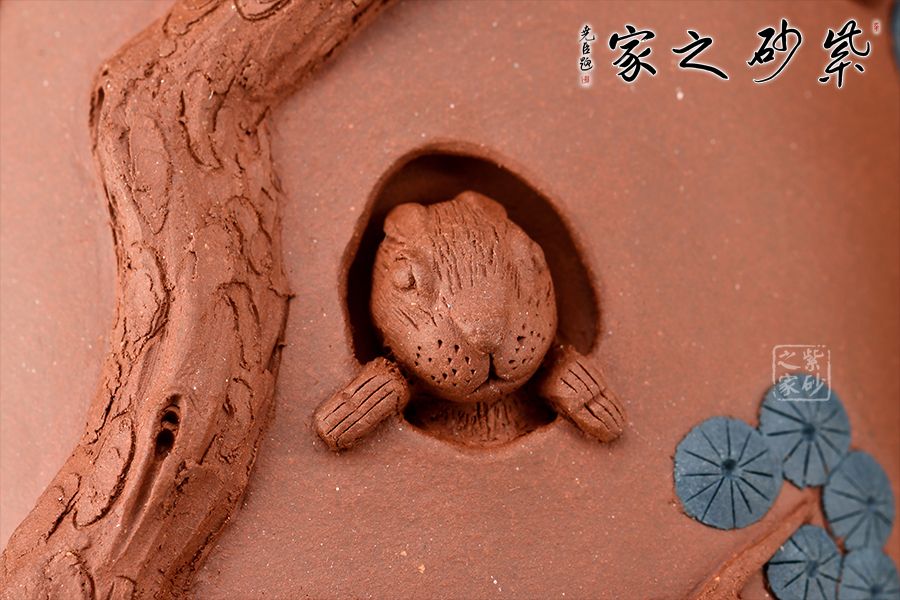 此杯以松入壺,整器泥塑工藝精美,壺面枝葉、松果、松針、癭節(jié)及斑駁肌理的刻繪逼真,盡顯生機(jī),中一松鼠露頭,活靈活現(xiàn)栩栩如生。