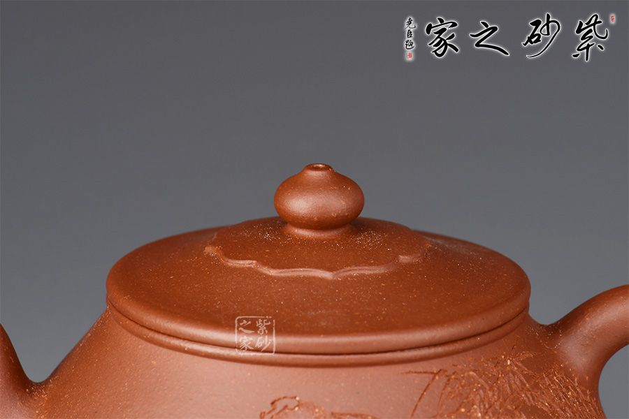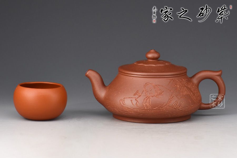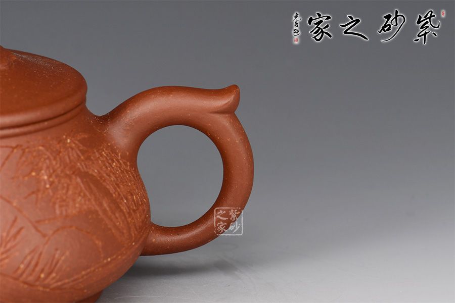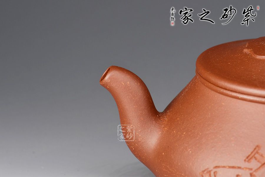 整壺端莊而不失優(yōu)雅,流線優(yōu)美。明接流嘴,強勢胥出,嘴圓潤似小口,出水迅猛爽;飛把,明接精湛,端握稱手;壓蓋設計,嚴絲合縫,滴鈕玲瓏精巧。壺身陶刻漁翁,江邊垂釣,融于自然,自有一種豁達隱逸之韻。