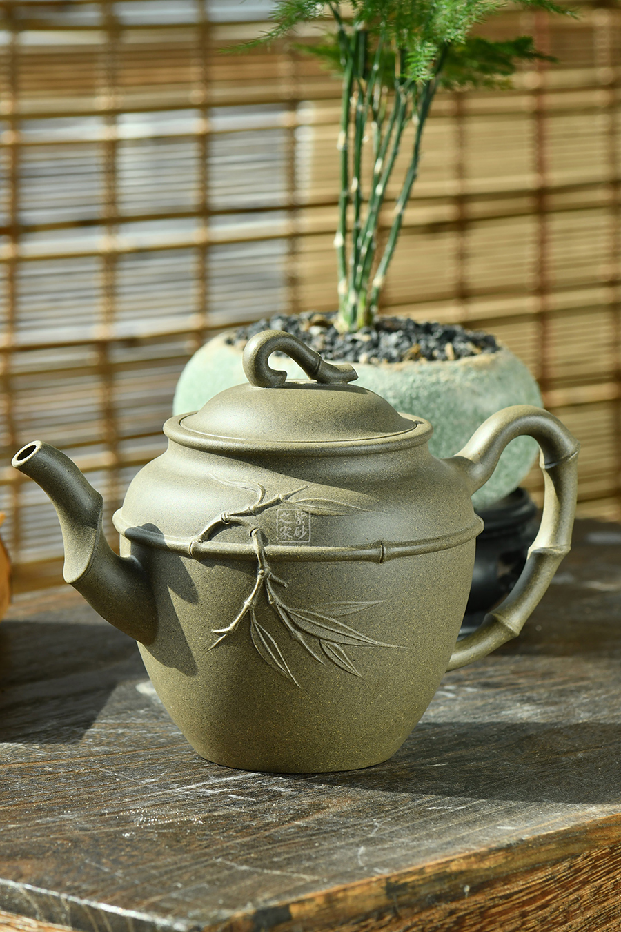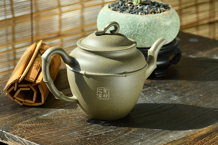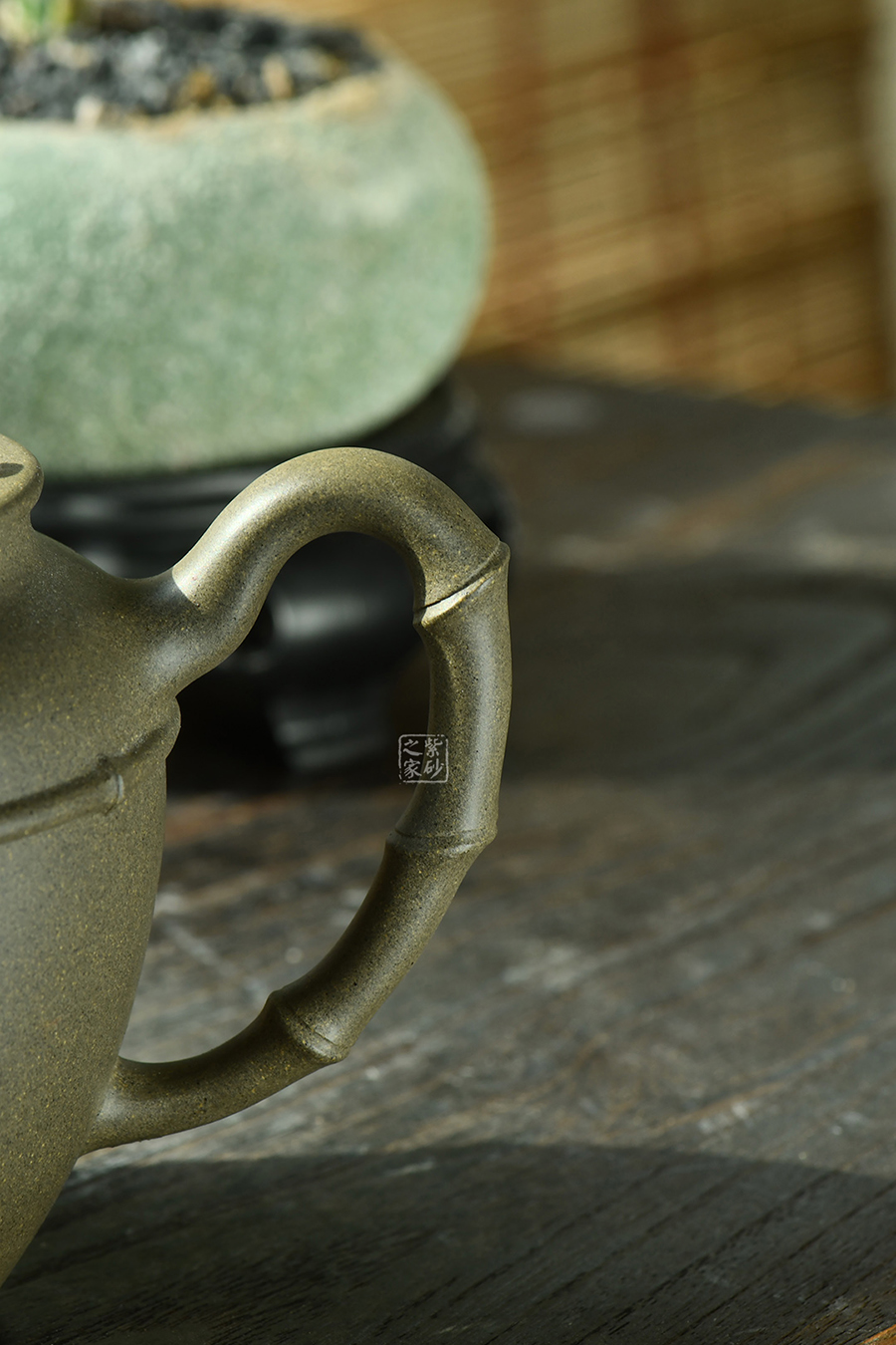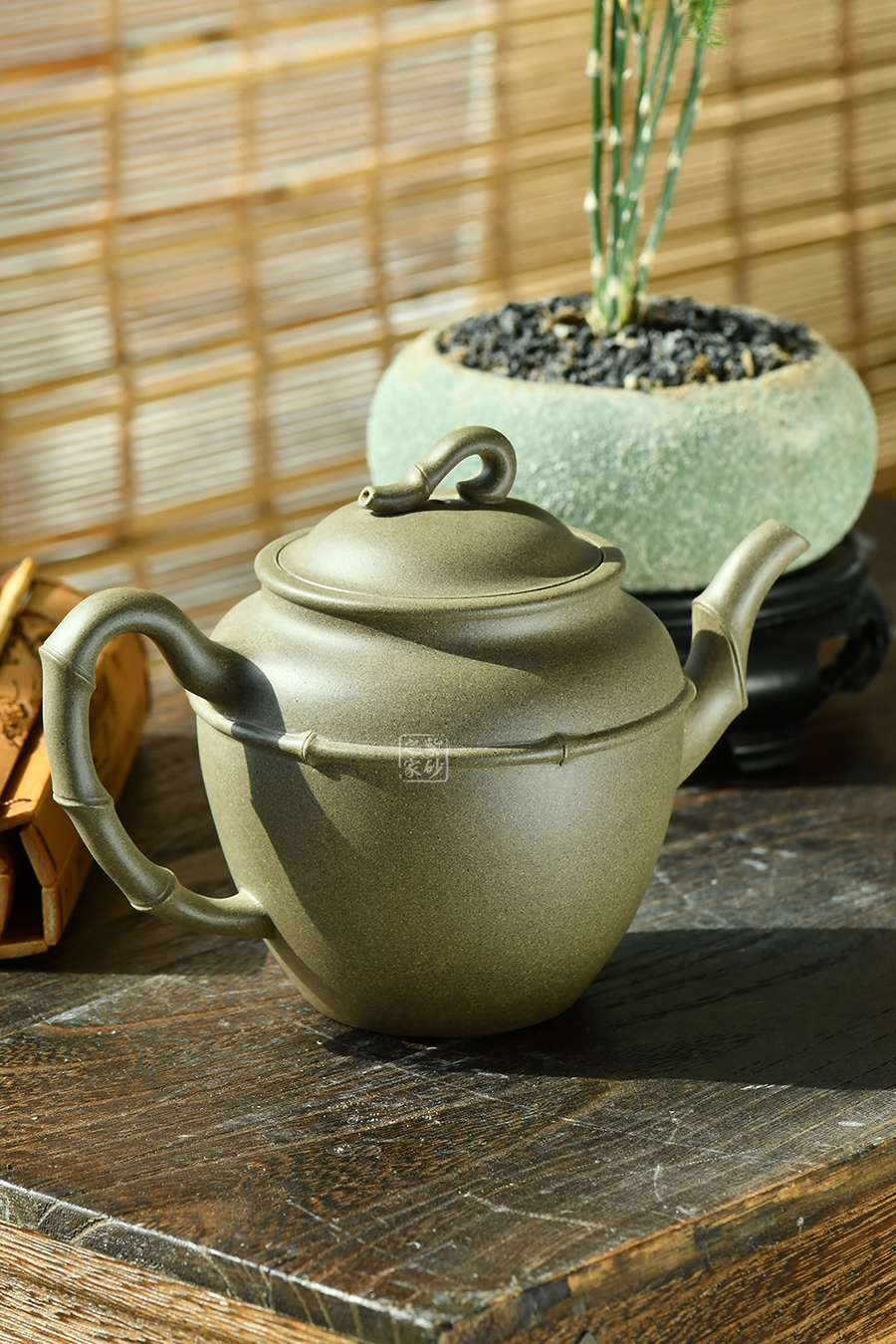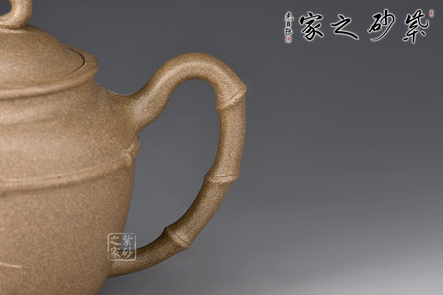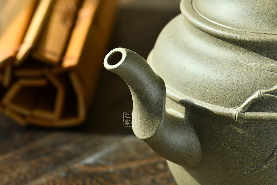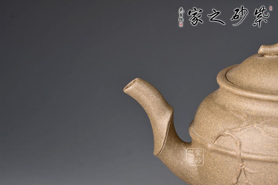 壺身若一節(jié)竹肚,壺腹飽滿,氣韻充沛。嵌蓋圓融,氣密性好,一截竹枝作壺鈕,竹節(jié)中空,方便拿捏。流把均為竹節(jié)樣式,壺嘴三彎,出水爽利,壺柄竹節(jié)彎成,蘊(yùn)力十足。
