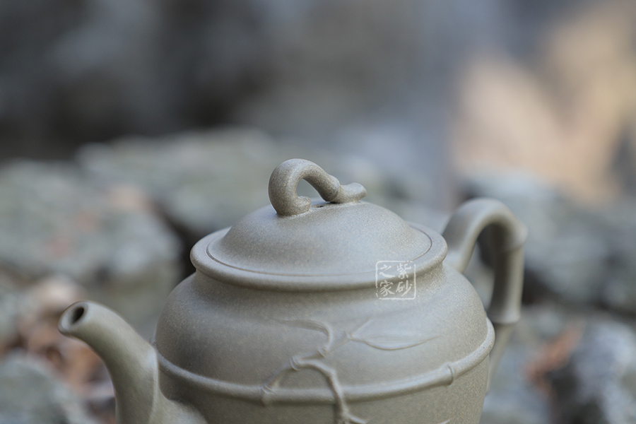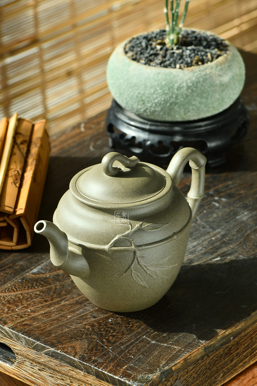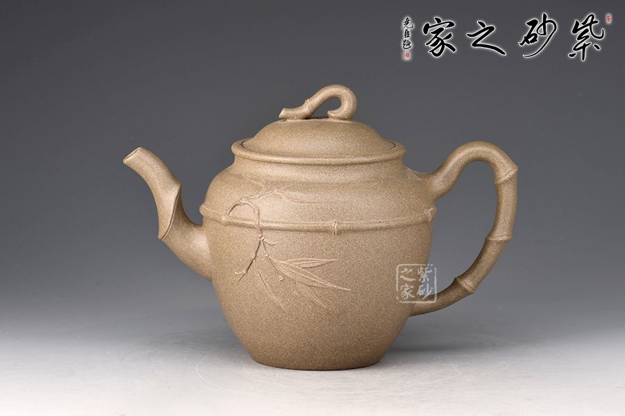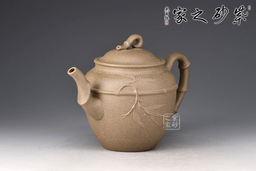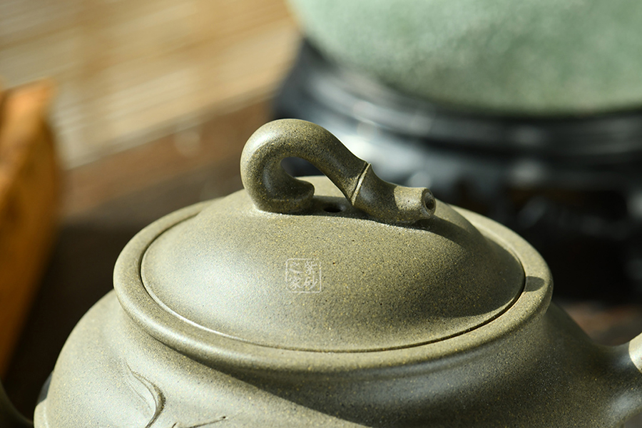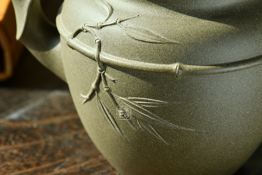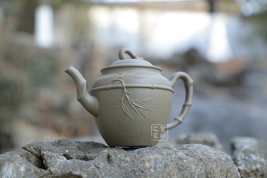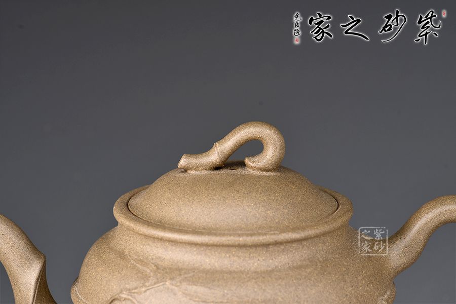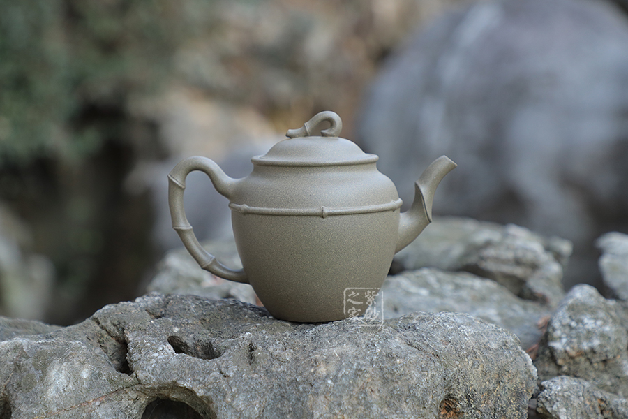 壺身若一節(jié)竹肚,壺腹飽滿,氣韻充沛。嵌蓋圓融,氣密性好,一截竹枝作壺鈕,竹節(jié)中空,方便拿捏。流把均為竹節(jié)樣式,壺嘴三彎,出水爽利,壺柄竹節(jié)彎成,蘊(yùn)力十足。