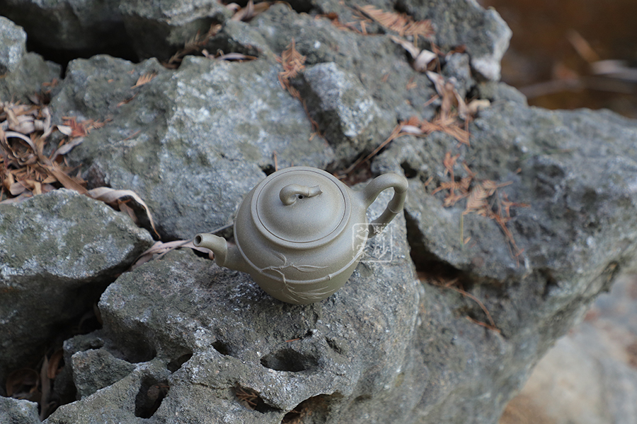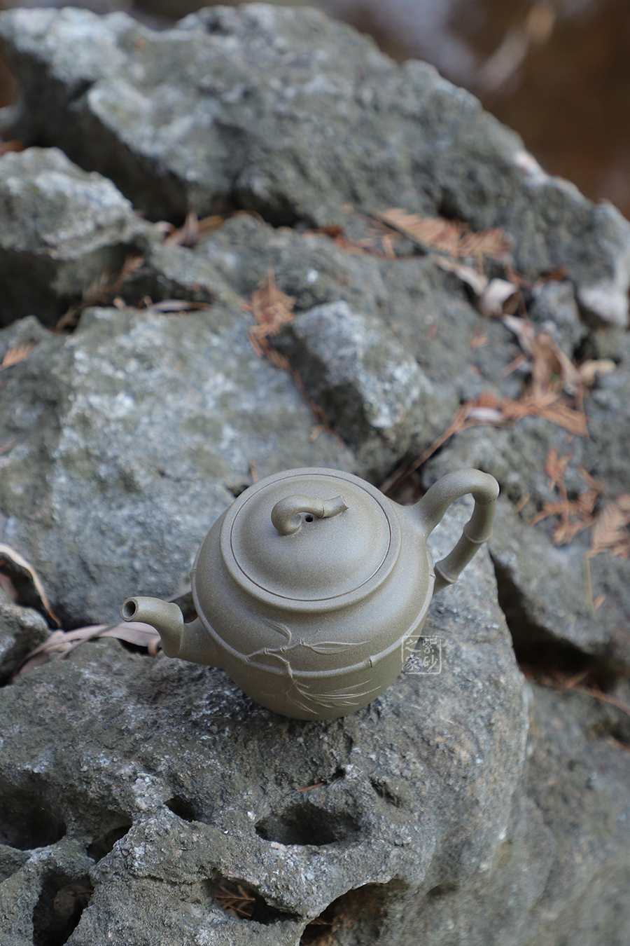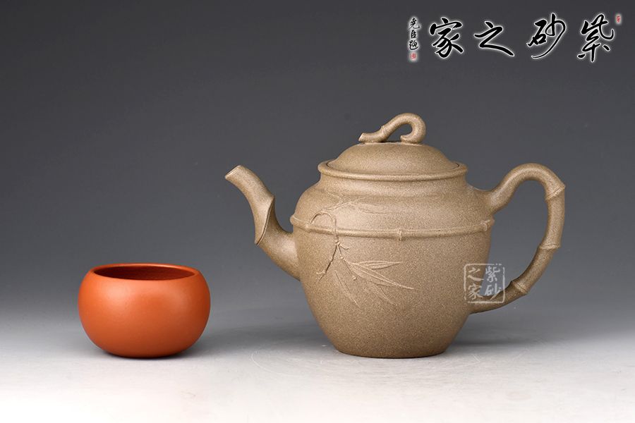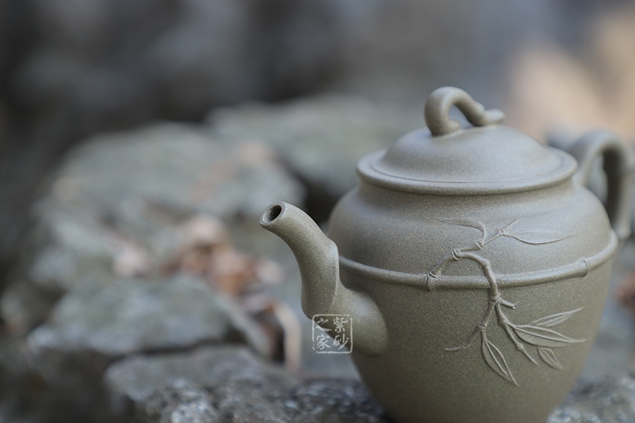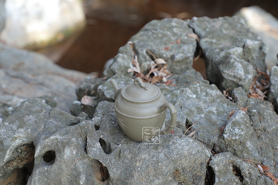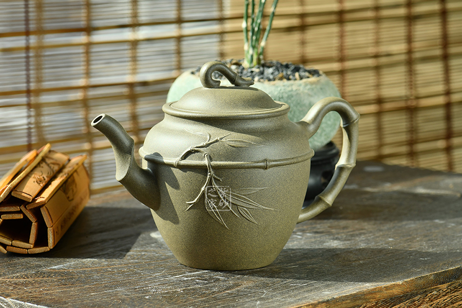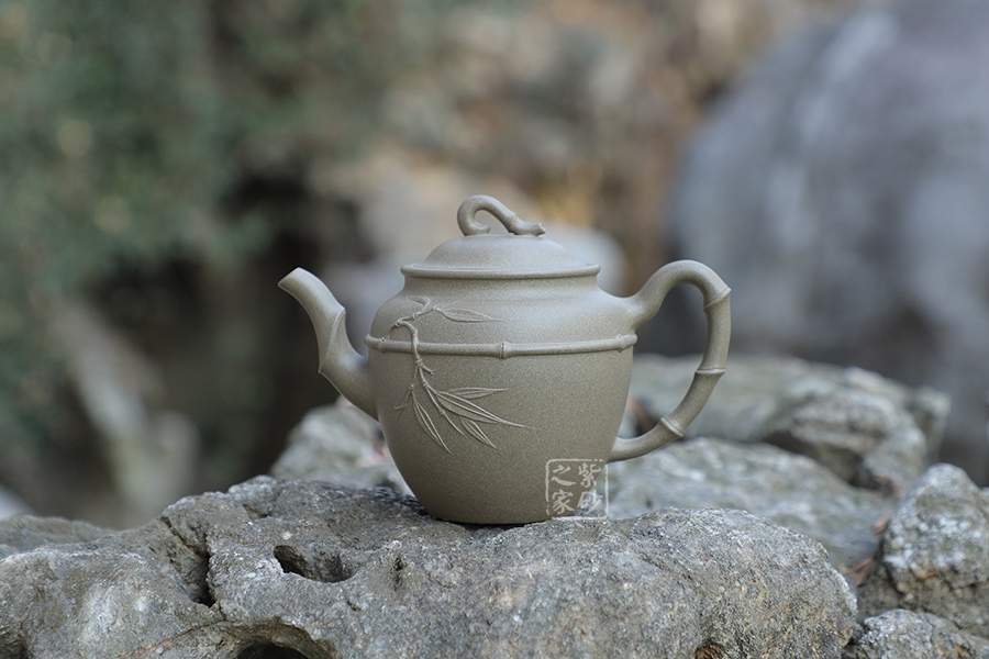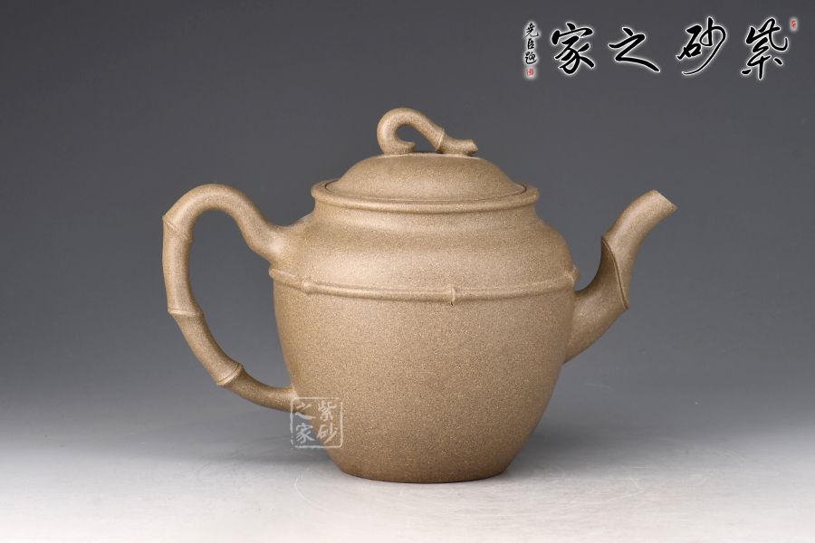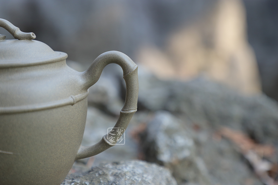 壺身若一節(jié)竹肚,壺腹飽滿,氣韻充沛。嵌蓋圓融,氣密性好,一截竹枝作壺鈕,竹節(jié)中空,方便拿捏。流把均為竹節(jié)樣式,壺嘴三彎,出水爽利,壺柄竹節(jié)彎成,蘊(yùn)力十足。
