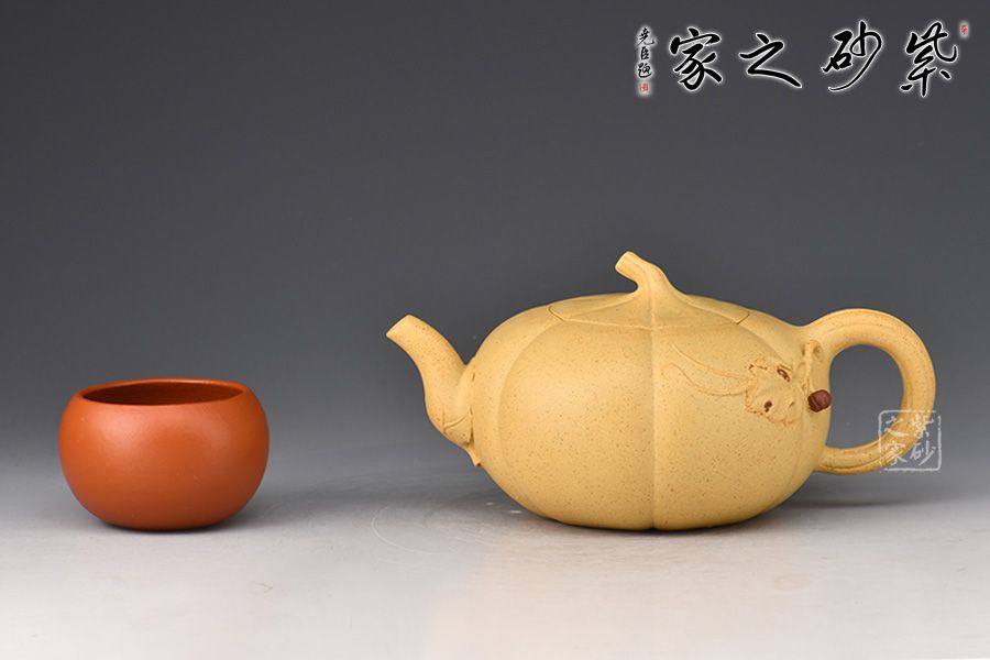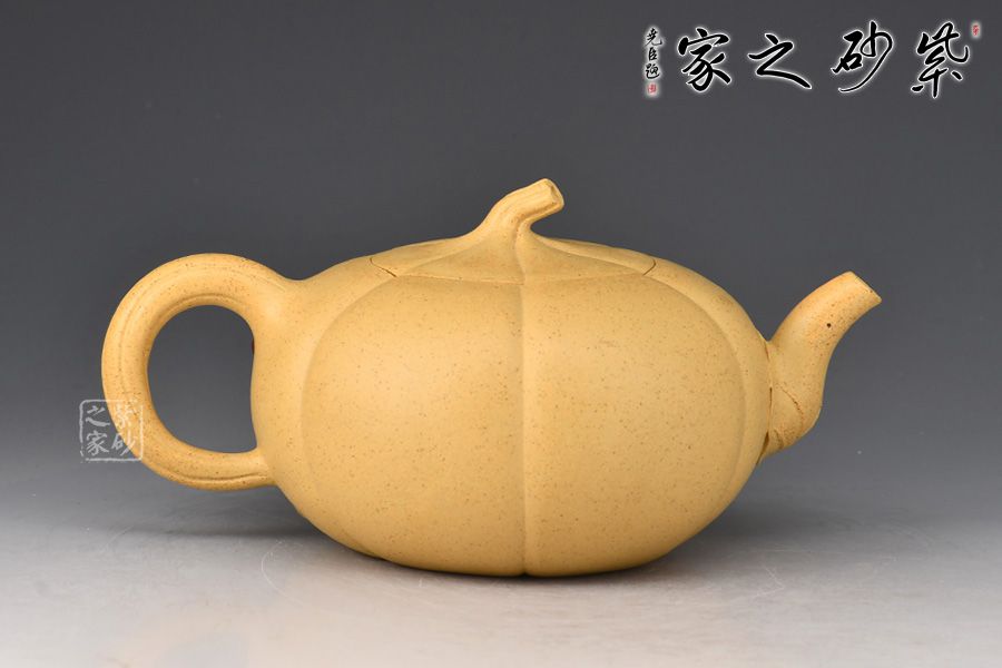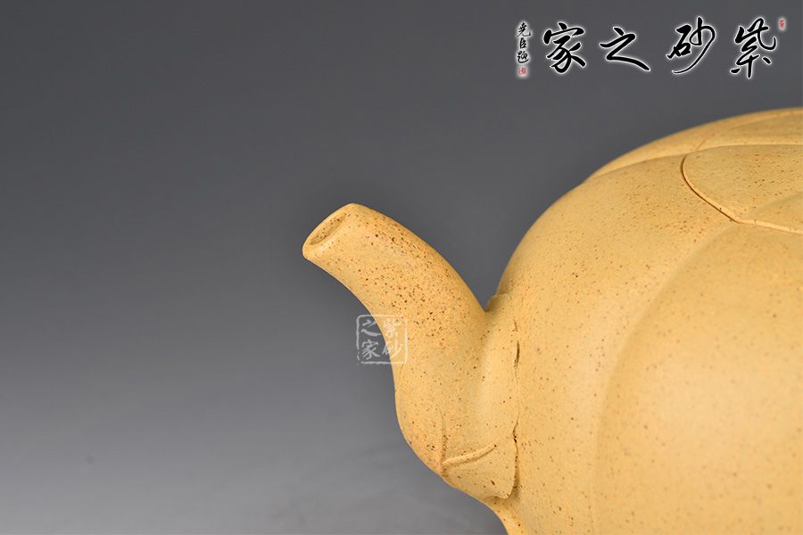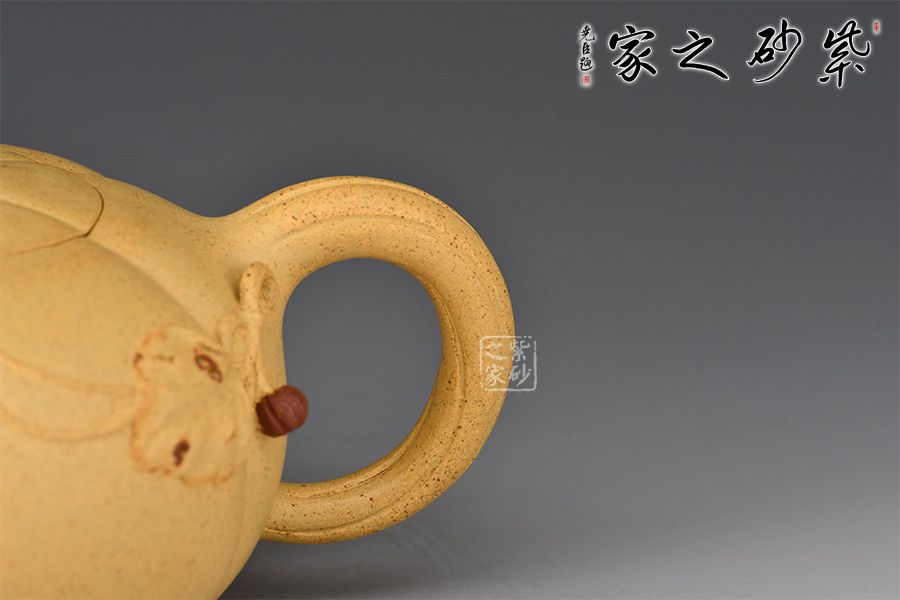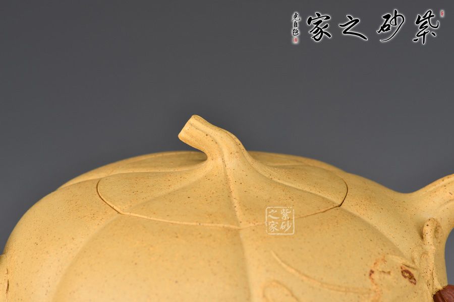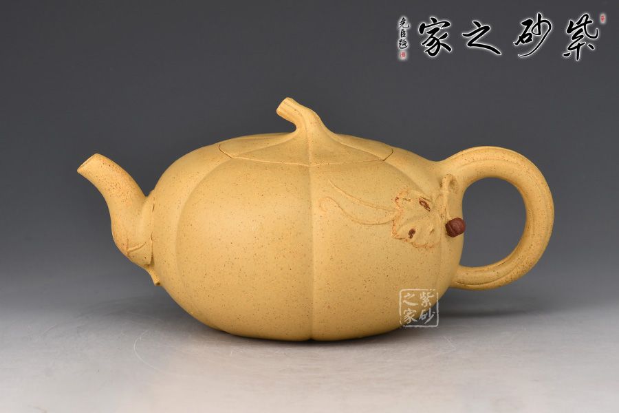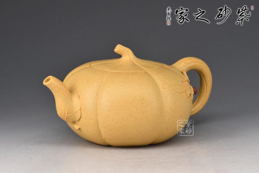 此壺選用本山綠泥精制而成,色澤溫潤柔和。壺容量為310cc,壺體仿一只成熟豐碩的大南瓜,瓜紐做的子,瓜葉成壺流,瓜藤為壺柄,各部細節(jié)細致入微,可見老師心思細膩,嵌蓋氣密性佳,壺體貼塑瓜葉、藤蔓、果實,其精心細致,立體生動,令人贊嘆,此壺?zé)o論泥、形、工俱佳,值得品賞收藏!