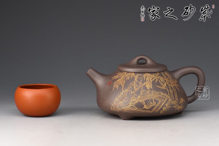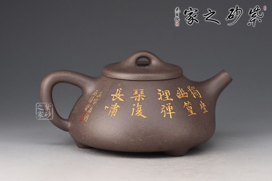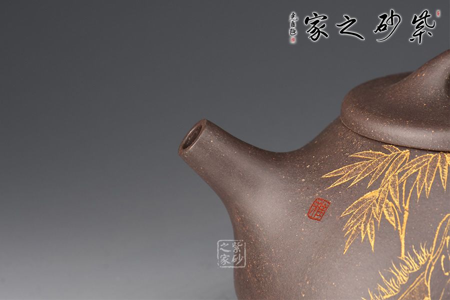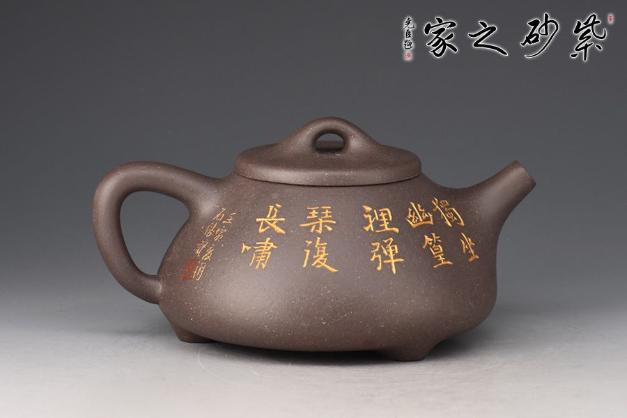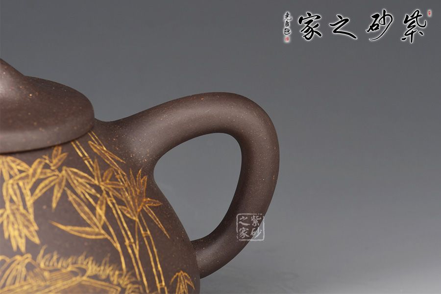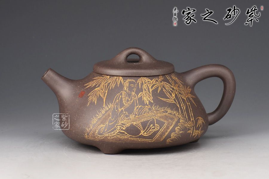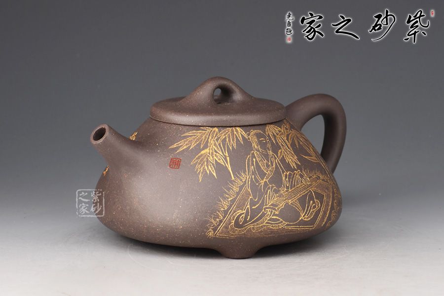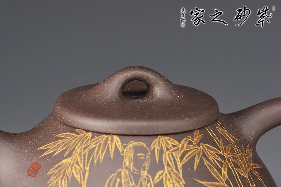 此件《子冶石瓢》全手精工制作。壺身骨力勁挺,橋鈕、直流、倒三角把比例精湛,渾厚有力。名家張雪超陶刻,壺身正面陶刻詩人撫琴,反面陶刻詩詞“獨坐幽篁里,彈琴復(fù)長嘯刻繪勁竹之貌”,充分展現(xiàn)文人壺之魅力,賞用藏珍品。