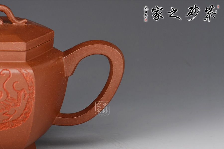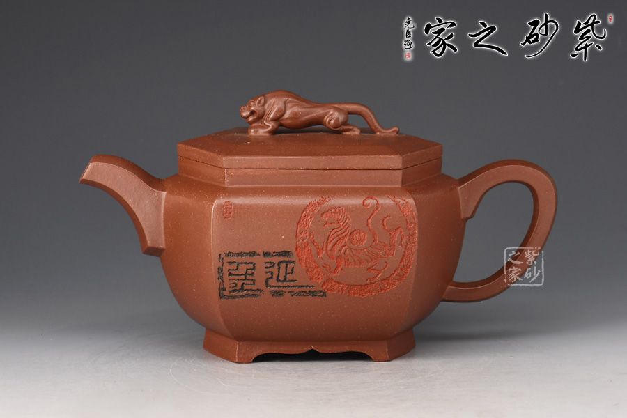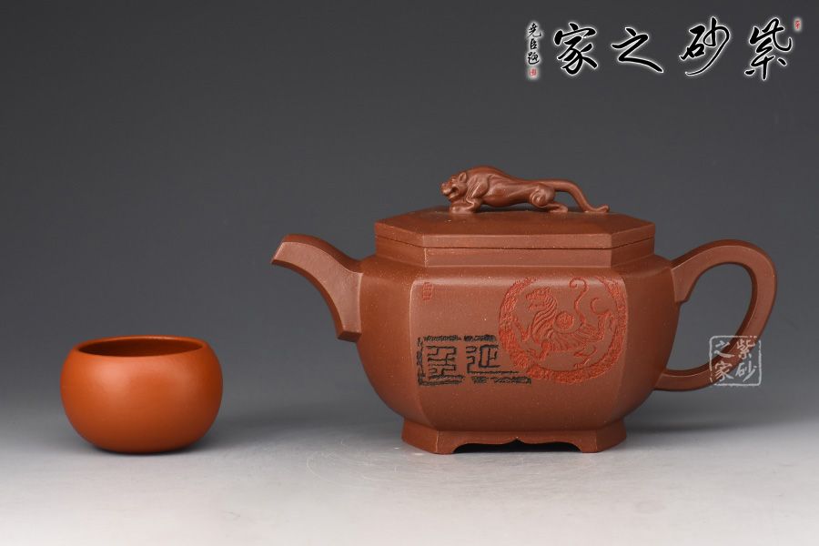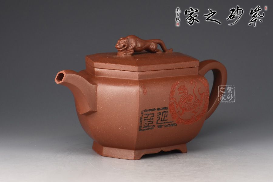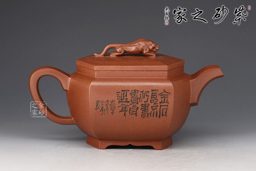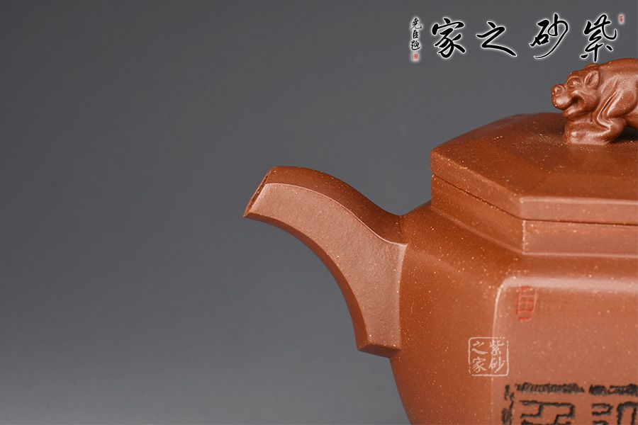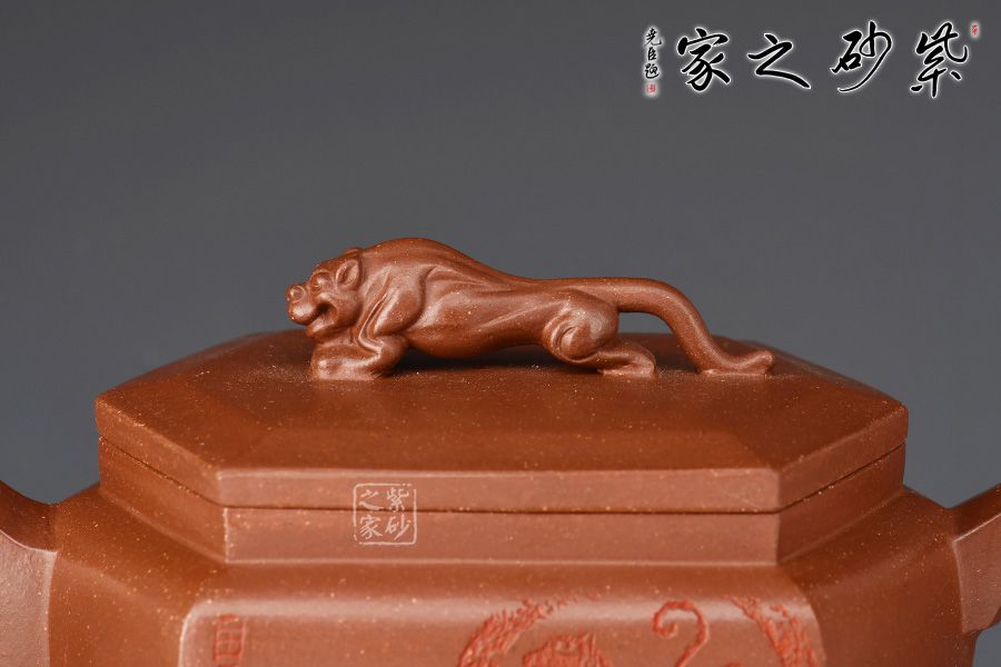 壺身六方,線條顯得剛正不阿、大氣,輪廓清醒,簡明有力,比例協(xié)調(diào),對稱工整,壓蓋設(shè)計,嚴絲合縫。壺鈕呈金錢豹式樣,寫意與寫實交替,塑形與傳神共融,極具視覺沖擊力。