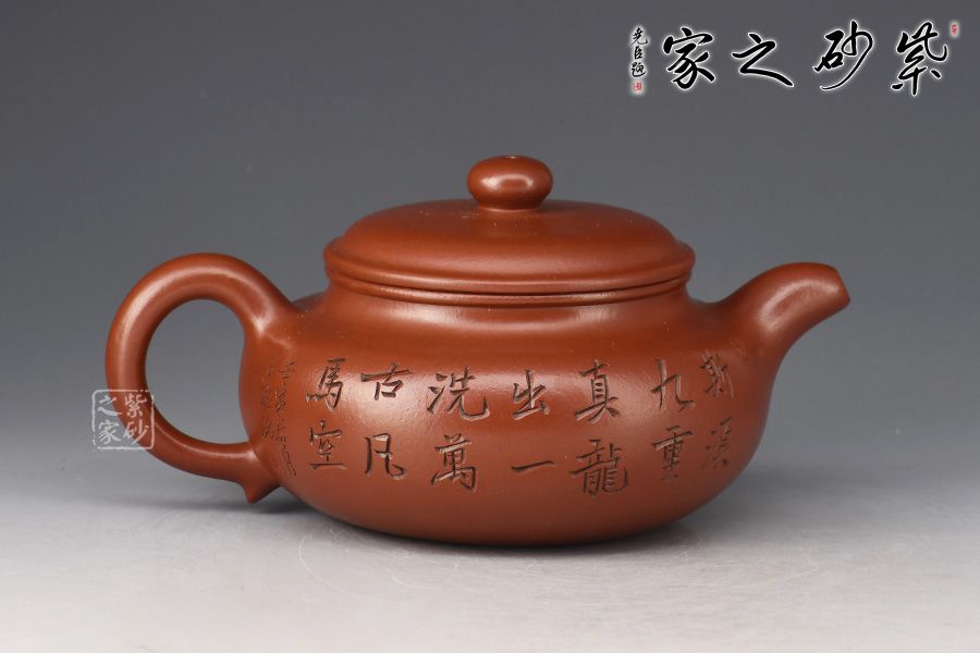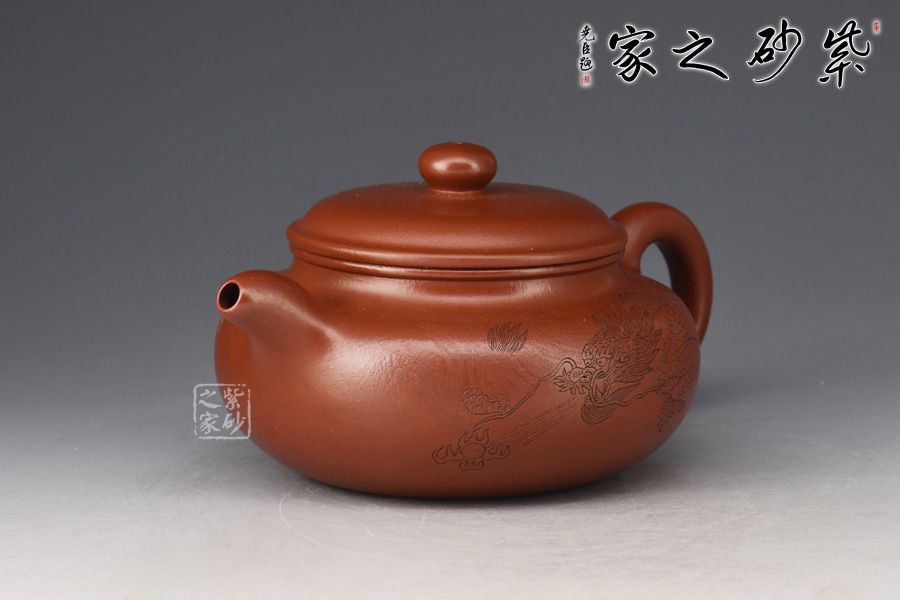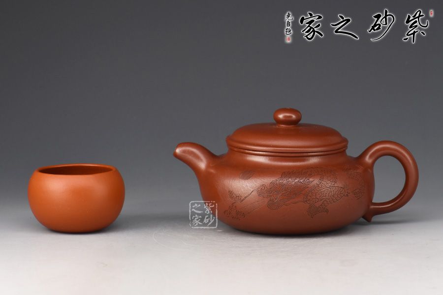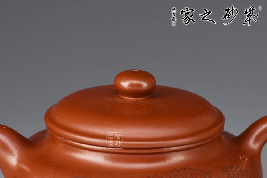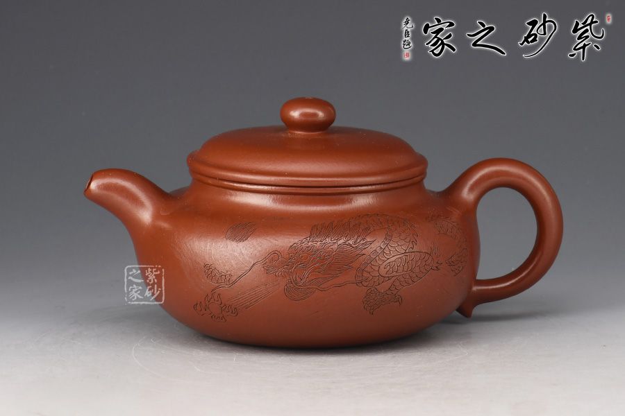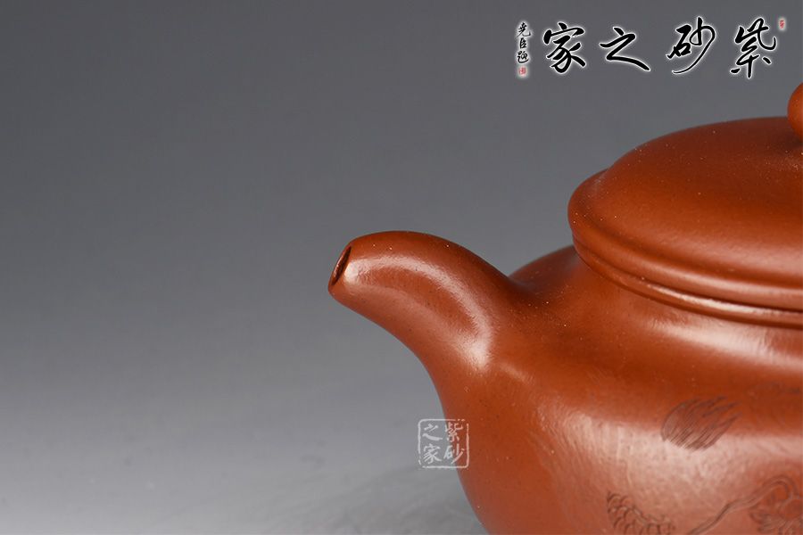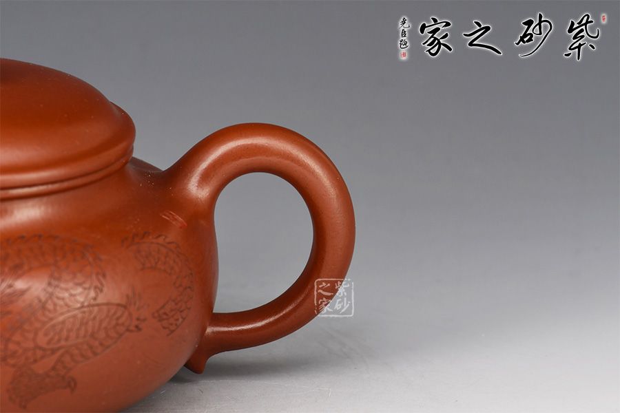 此壺為作者摹古經(jīng)典,以紫朱泥作胎,全手工精制而成,泥色溫潤雅致。鼓形壺身氣韻飽滿,鈕、流、把曲線流暢,走勢和諧,線條收放自如,一氣呵成。壺腹名家張雪超陶刻飛龍,栩栩如生。整器形體美觀,出水爽利,手感上佳,雅韻充沛,是一把高性價(jià)比、精工實(shí)用的殺茶利器,推薦入手。