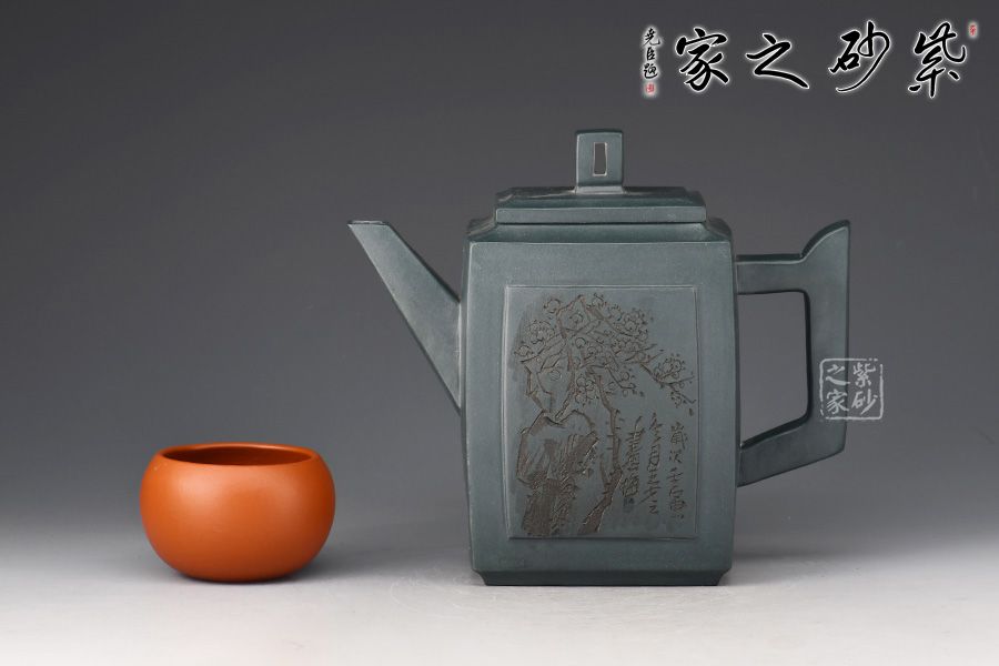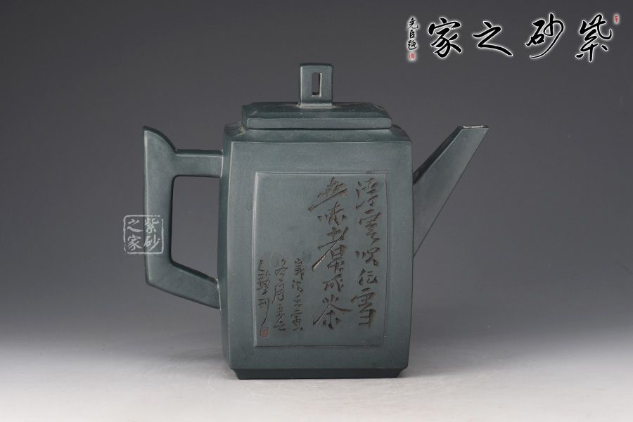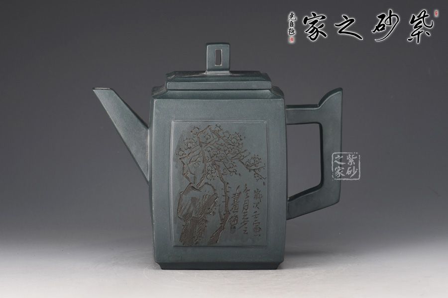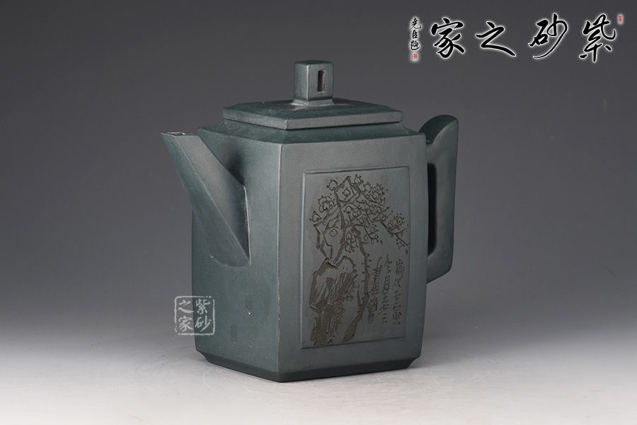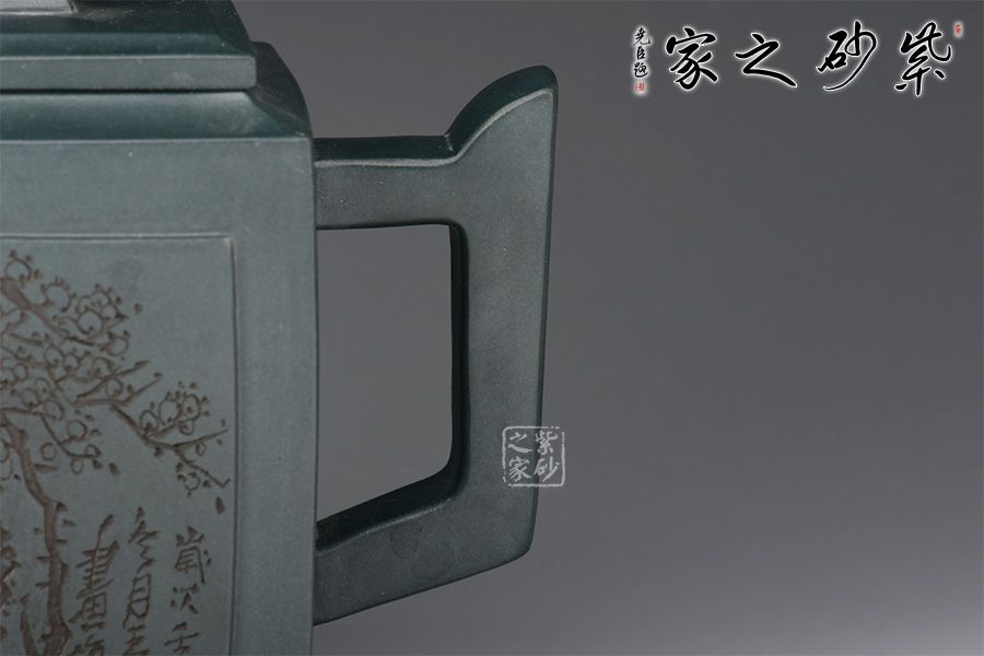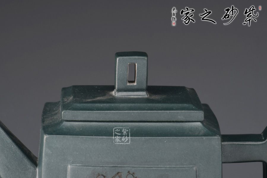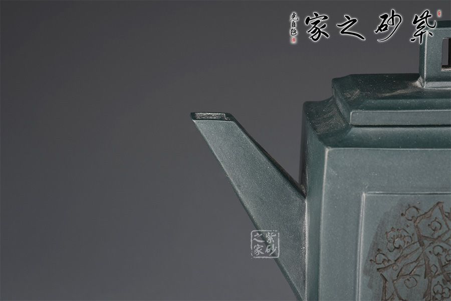 壺身為四方體,線條挺拔,切面工整,四角強(qiáng)化如柱,更顯沉穩(wěn)大氣。嵌蓋平滑洗練,四方壺鈕小巧工整,棱角分明。壺嘴四方外觀,粗細(xì)漸變,口沿卻工整利落。壺把為四方框,筆挺有力,幾何美感突出。整款作品無(wú)一處不是四方,無(wú)一處不是工整韻味。