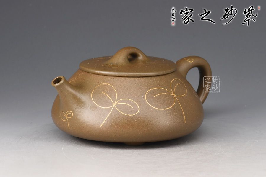 此壺取景舟石瓢之型,以原礦青段作胎,泥色清麗雅致,粒粒砂感盡顯古拙樸雅之味。壺身呈八字造型,豐潤飽滿,曲線柔和流暢,平壓蓋、橋鈕,拿取自如,流、把相互映襯,直流簡而有力,出水順暢,壺把優(yōu)雅揚起,提攜舒適。加之底部三乳足,給人以輕靈而穩(wěn)重之感。