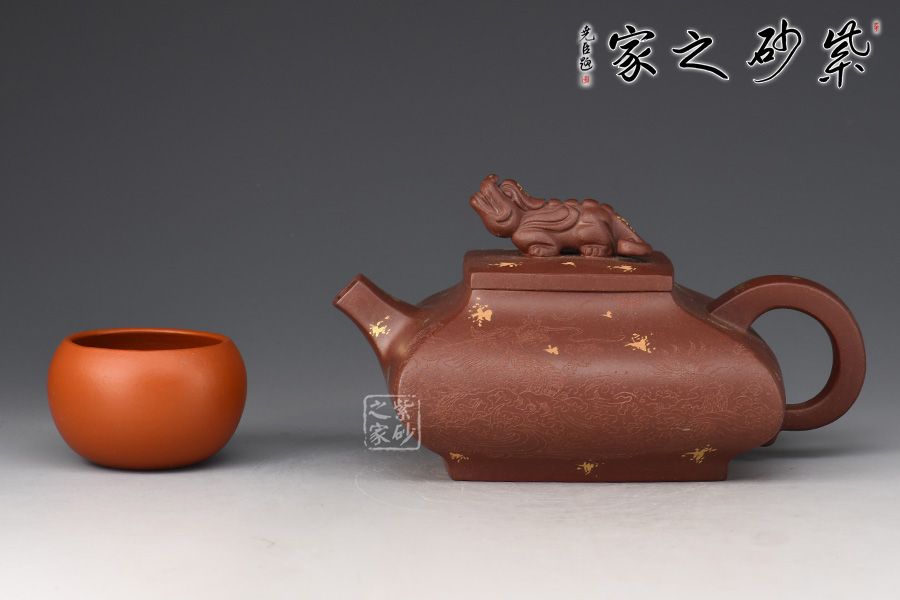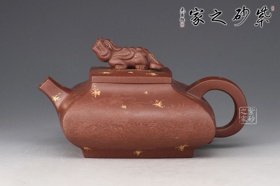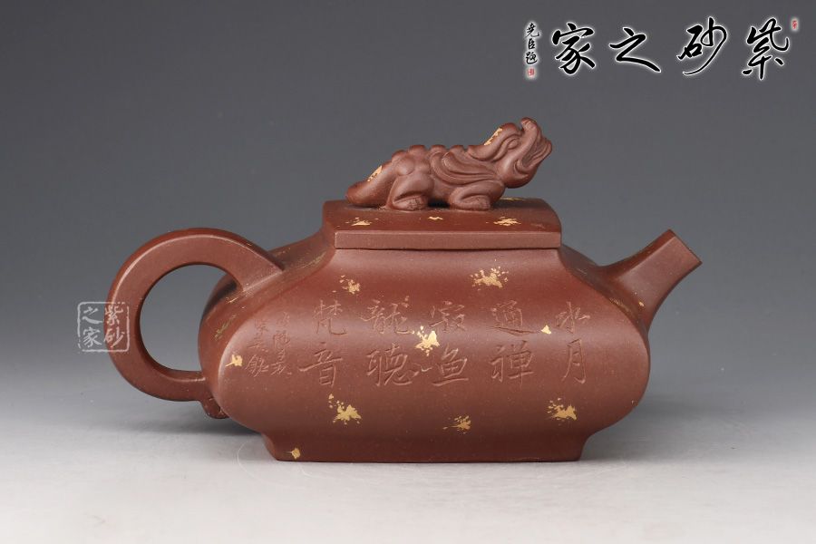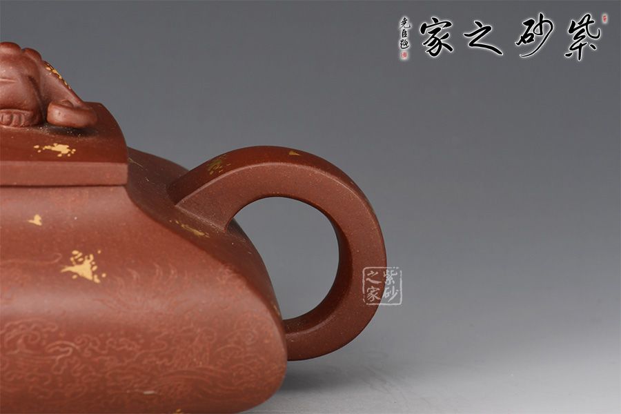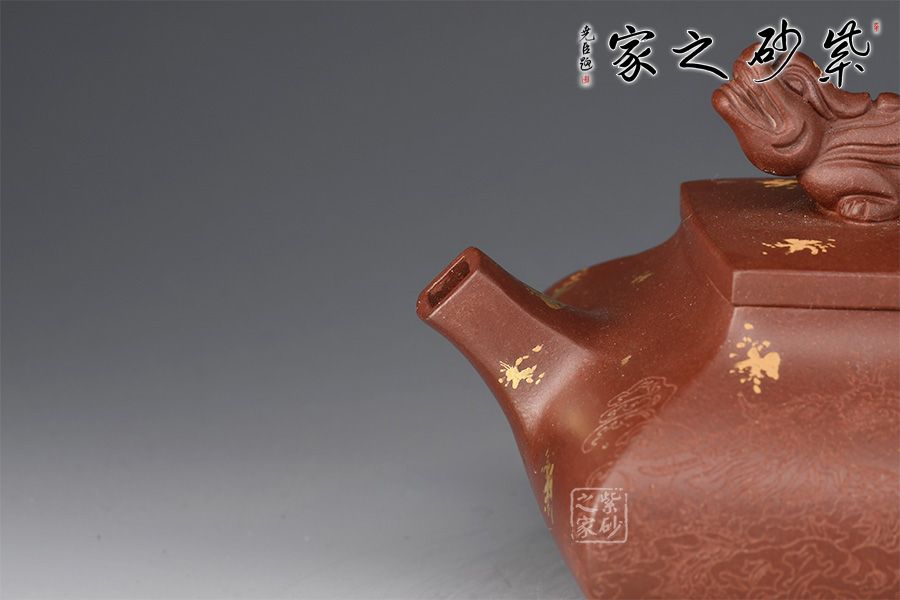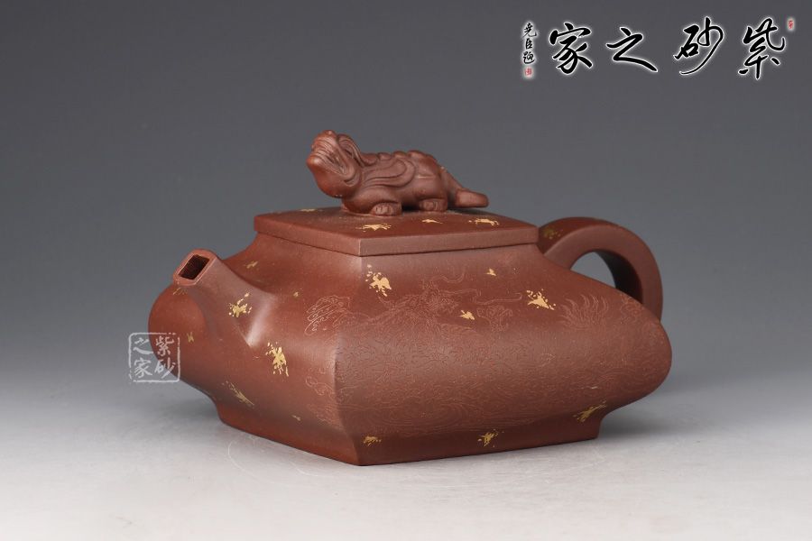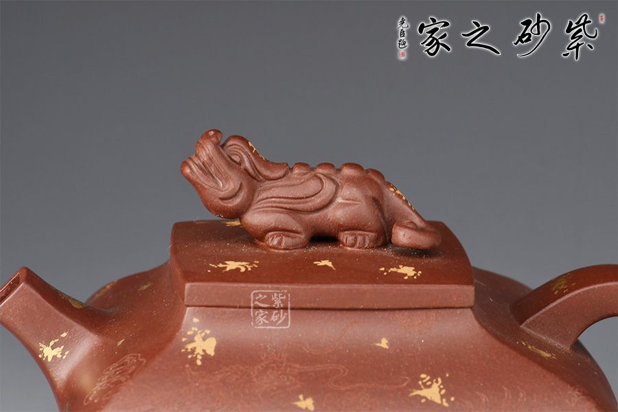 此壺名為“四方祥瑞”,壺身四方型豐斂自如,直中有曲、曲有中直,方中寓圓,其處理手法獨(dú)特,彰顯出作者純熟的功力。長(zhǎng)直嘴,耳型把,壺身雙面陶刻,灑金裝飾。平蓋設(shè)計(jì),瑞獸麒麟擬作壺紐盤踞壺蓋上,栩栩形態(tài)躍然眼前,帶有濃郁的民間祥瑞色彩,與壺身麒麟遙遙相望。此壺作為典型的方器,契合方器“挺拔、剛勁、有力”的造型特色。此壺傳統(tǒng)與創(chuàng)新相結(jié)合,盡顯渾厚的氣度。