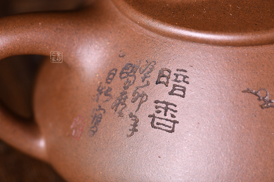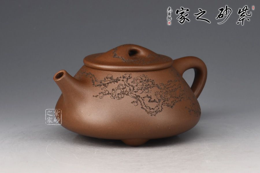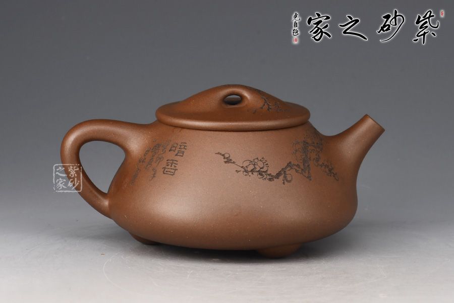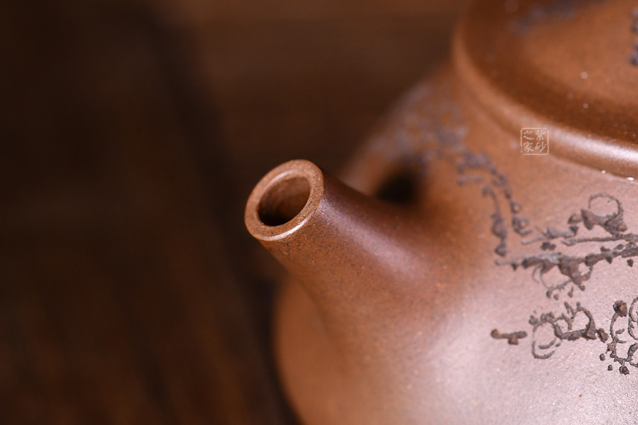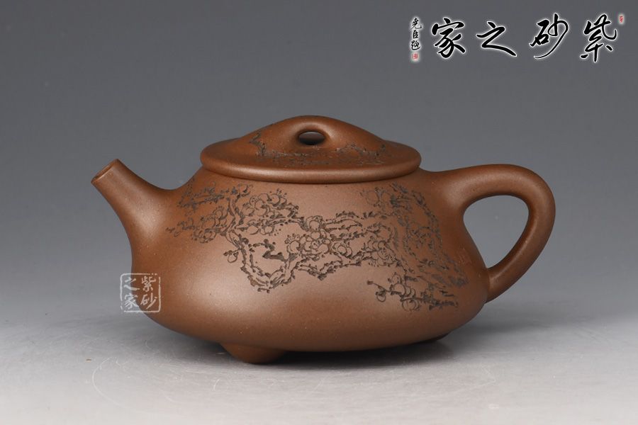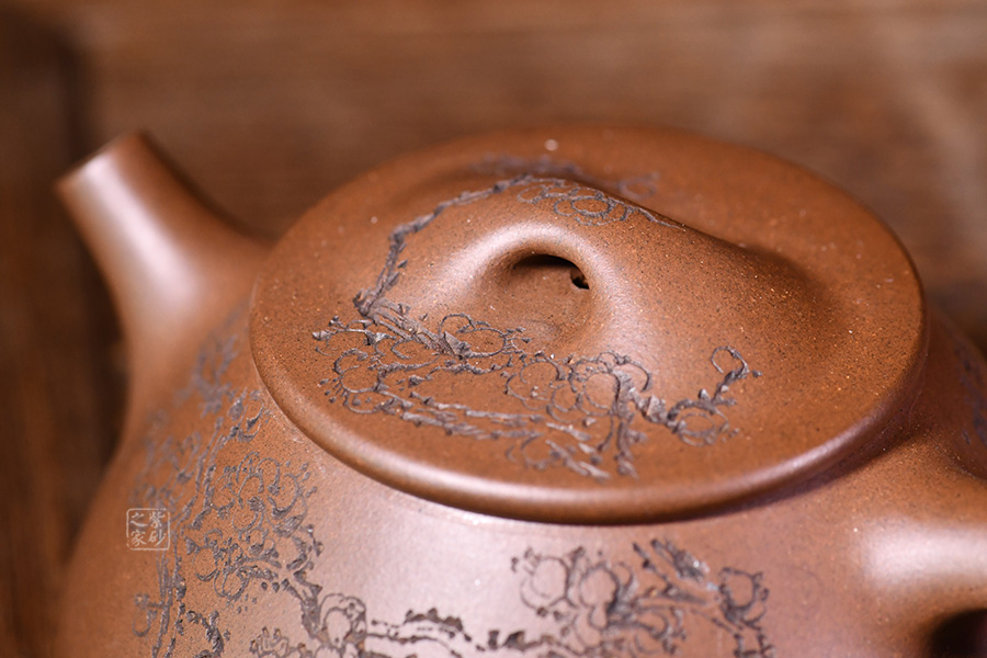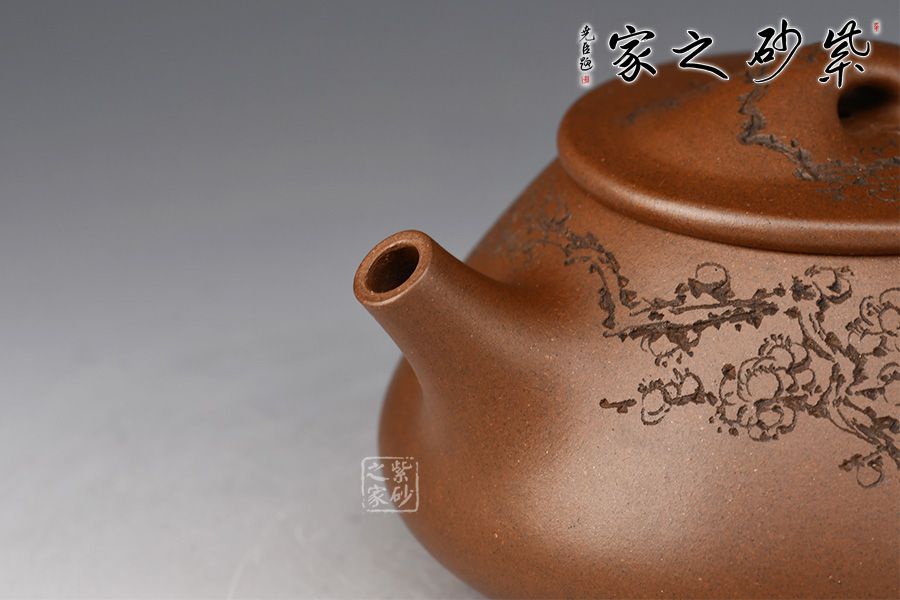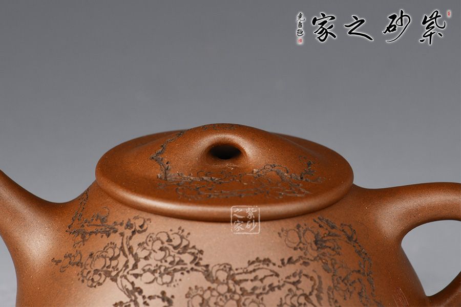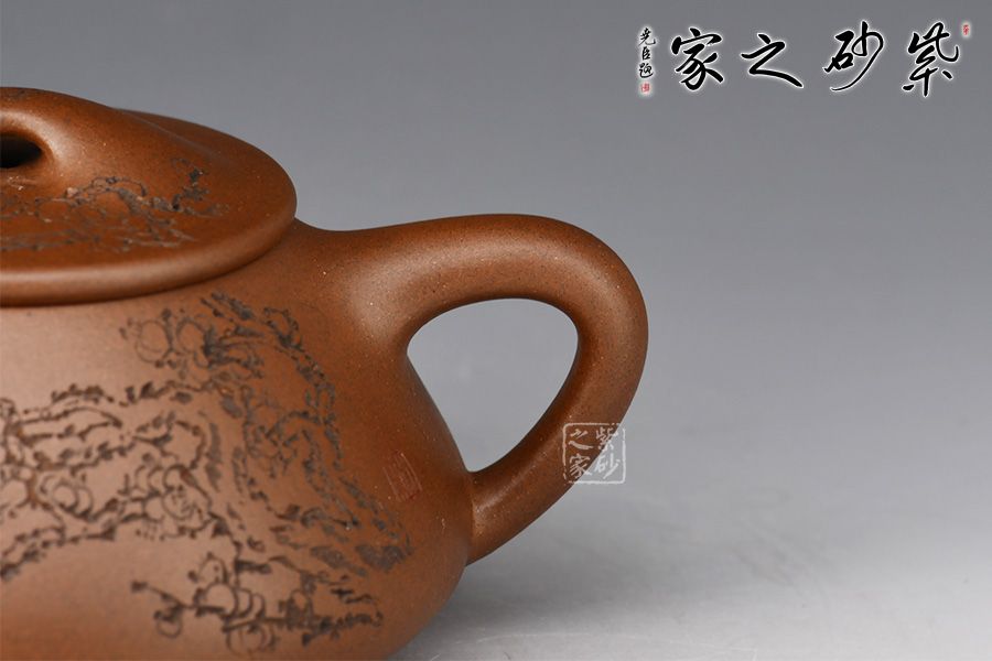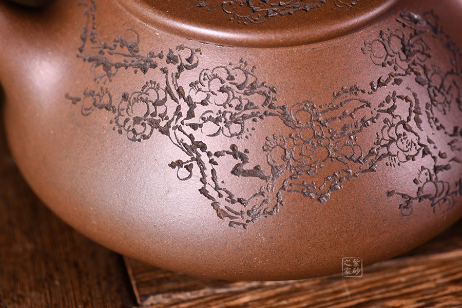 整體造型骨肉亭勻,簡(jiǎn)約大方,壺身豐潤(rùn)飽滿,平壓蓋、橋鈕,投茶、揭拿便利。直流簡(jiǎn)而有力,出水爽利,倒三角壺把,上豐下斂,比例和諧。壺身陶刻寒梅,梅花布局合理。壺體古雅敦厚,大氣古樸,值得品賞收藏。