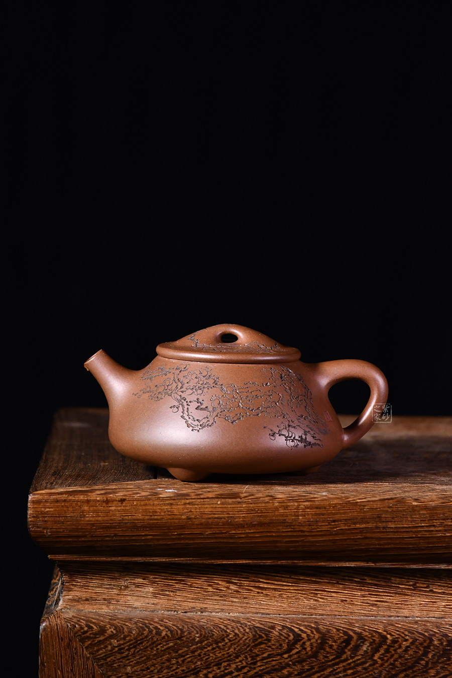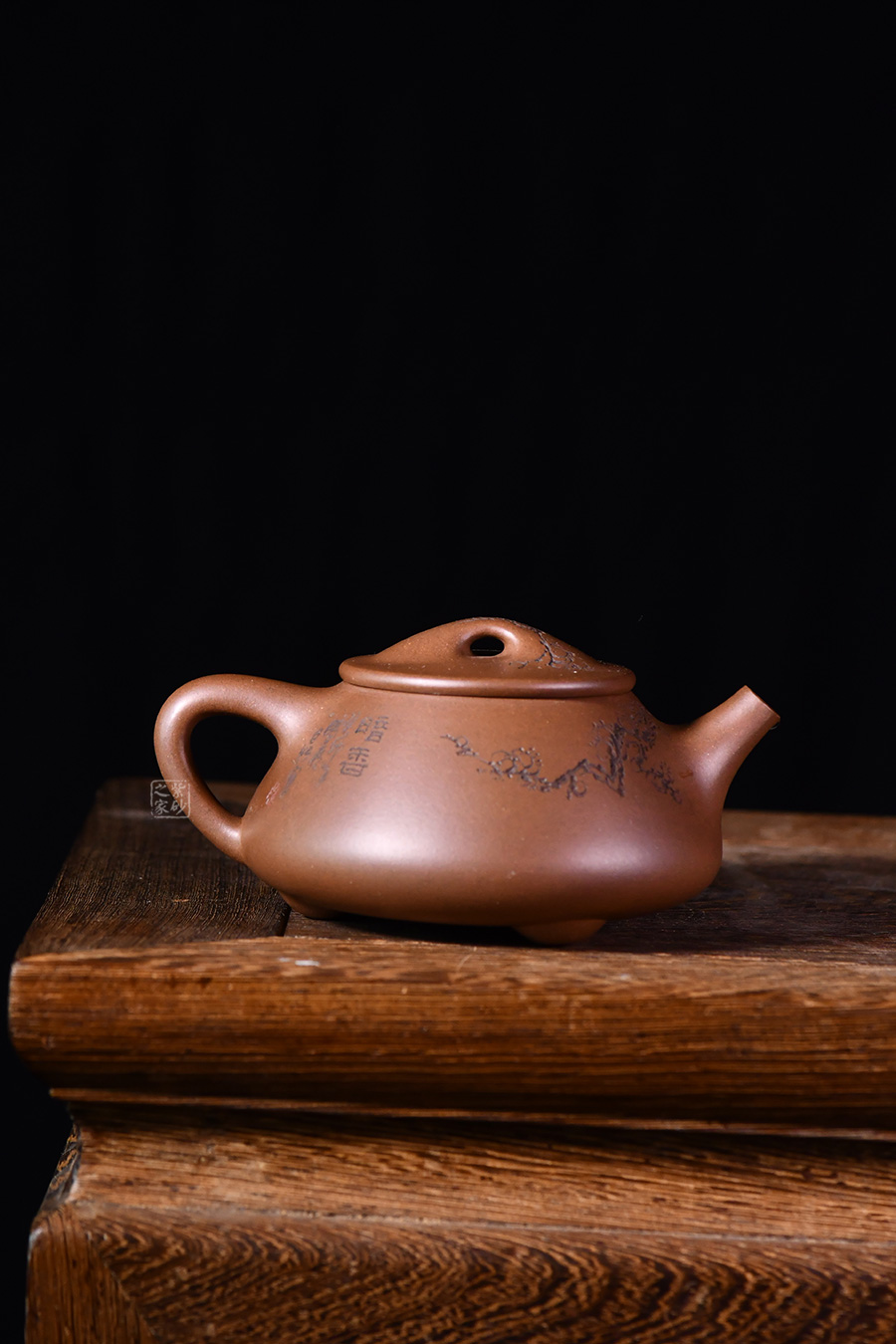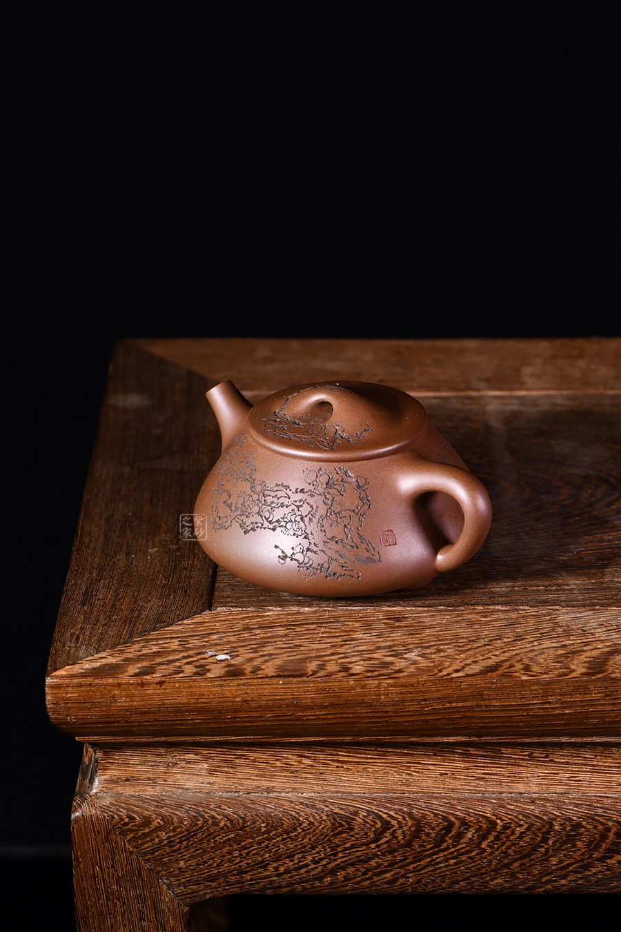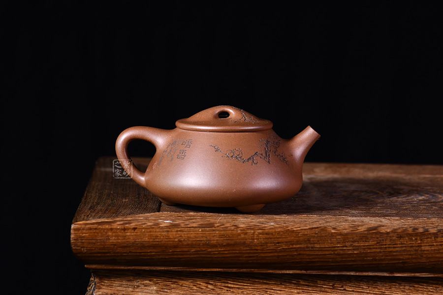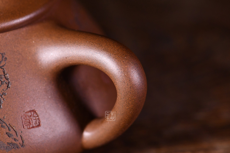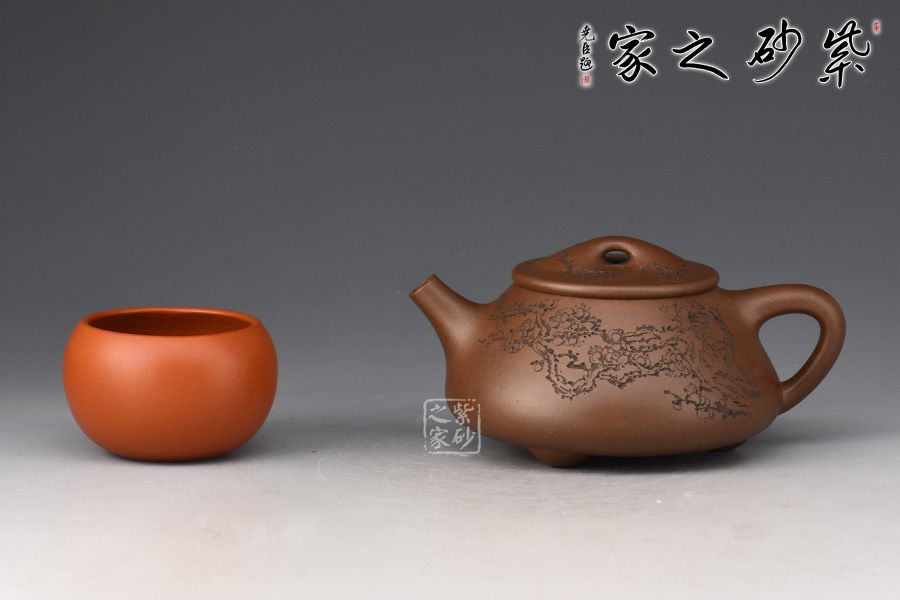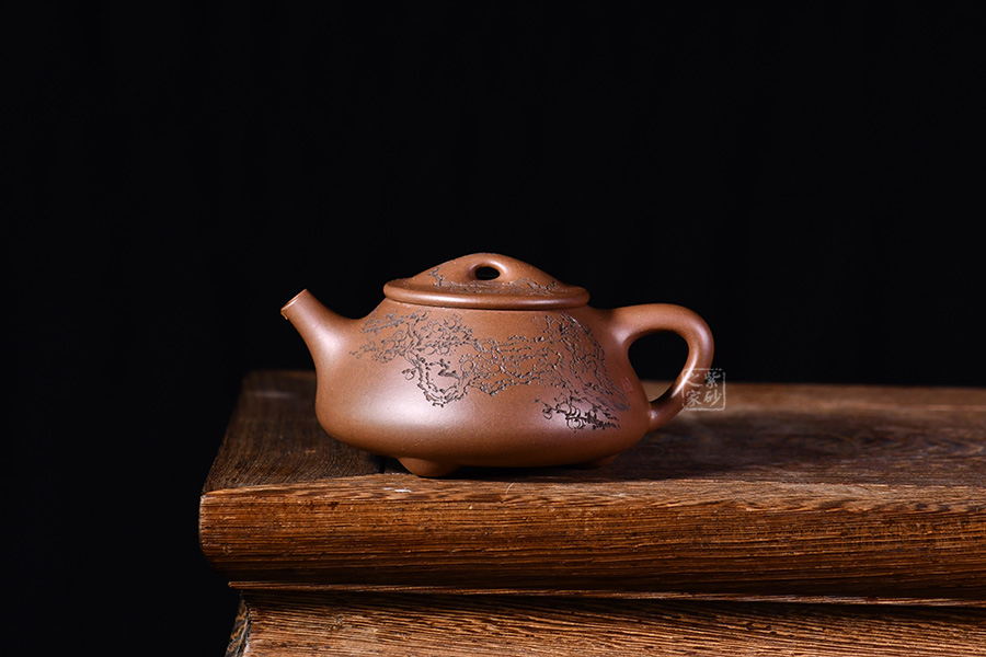 整體造型骨肉亭勻,簡(jiǎn)約大方,壺身豐潤(rùn)飽滿,平壓蓋、橋鈕,投茶、揭拿便利。直流簡(jiǎn)而有力,出水爽利,倒三角壺把,上豐下斂,比例和諧。壺身陶刻寒梅,梅花布局合理。壺體古雅敦厚,大氣古樸,值得品賞收藏。