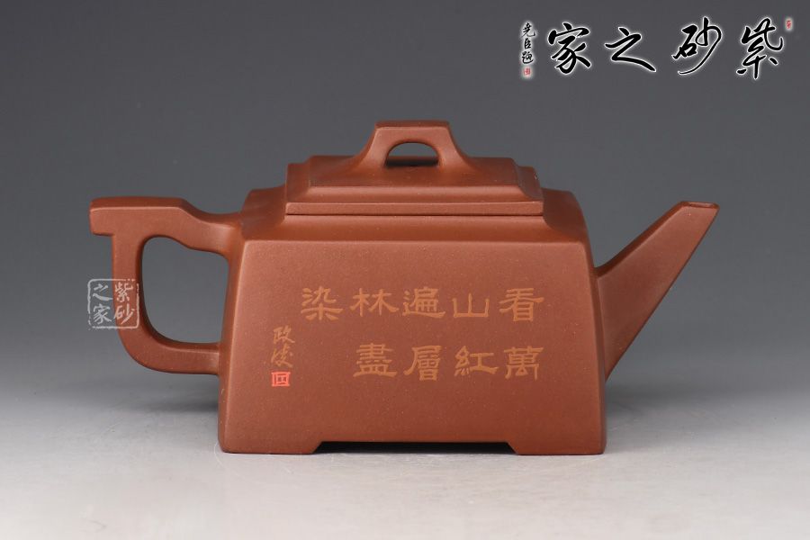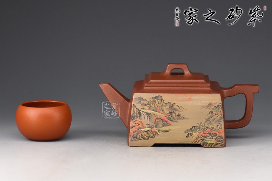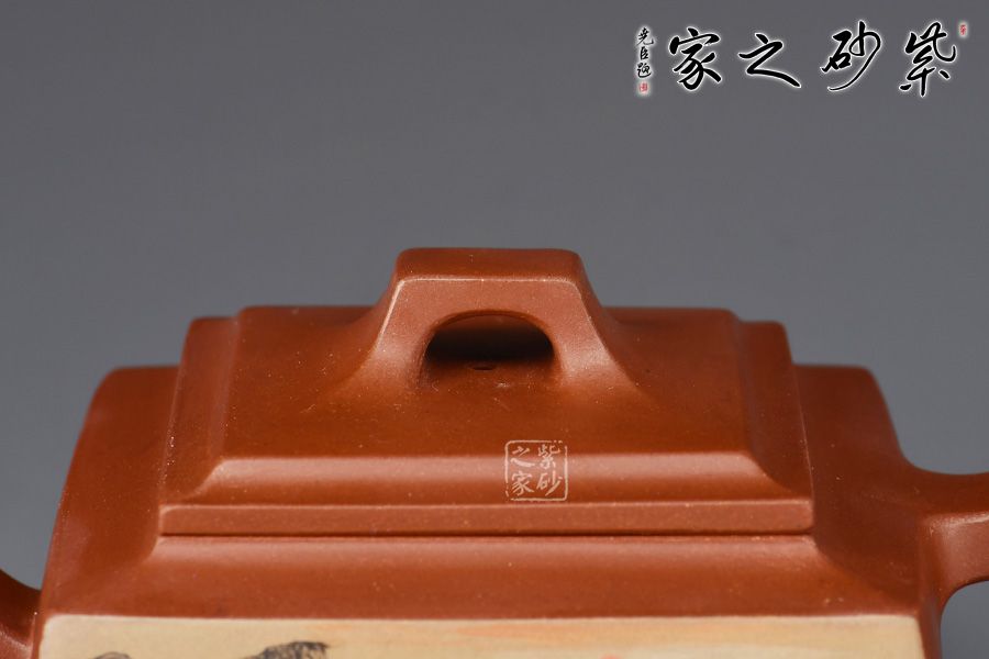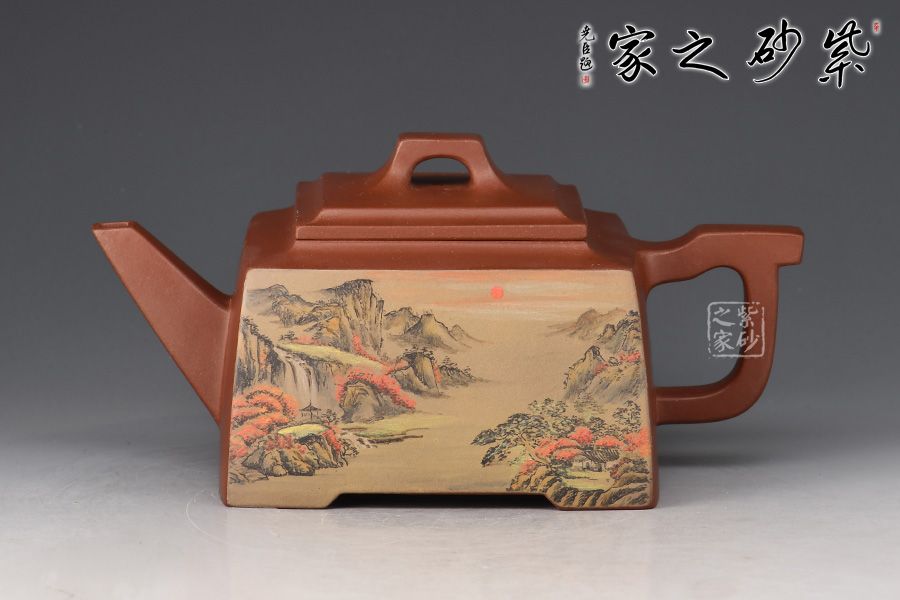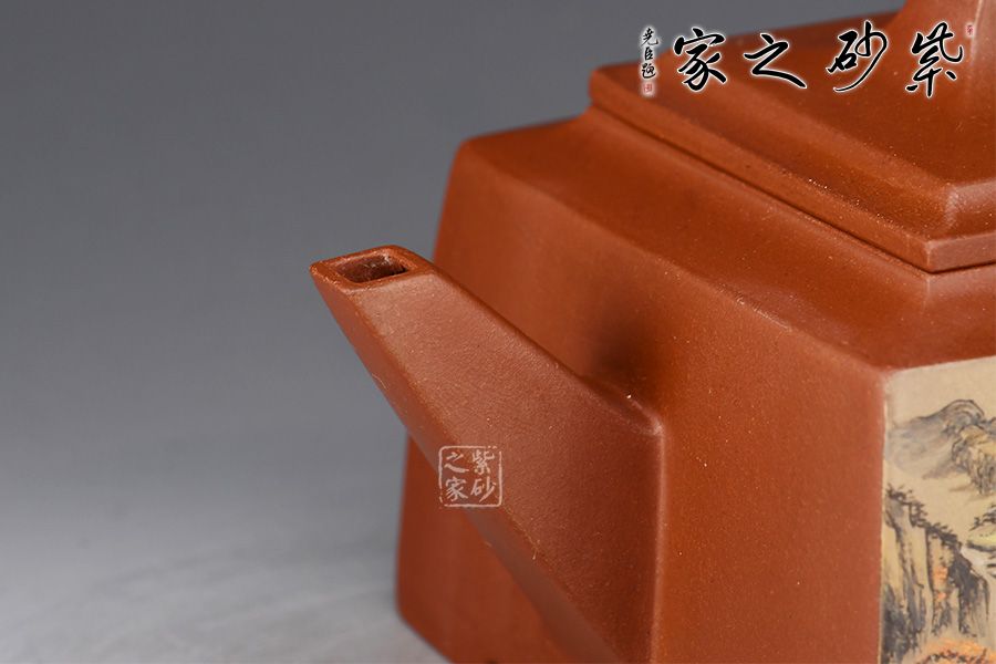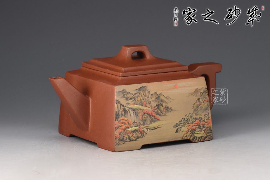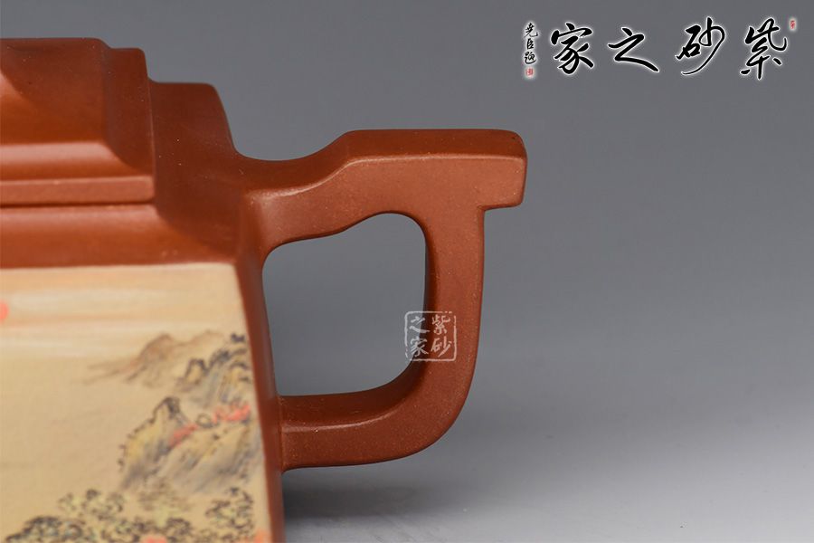 四方橋頂工藝難度頗大,橋形鈕。方形壺身,壺把,壺蓋,流、把亦呈四方不規(guī)則型。線條清晰分明,型制周正,工藝純熟。壺身彩繪江南美景,飽含詩(shī)情畫意的山水畫,看一眼就是享受!