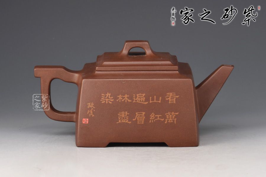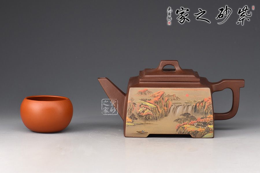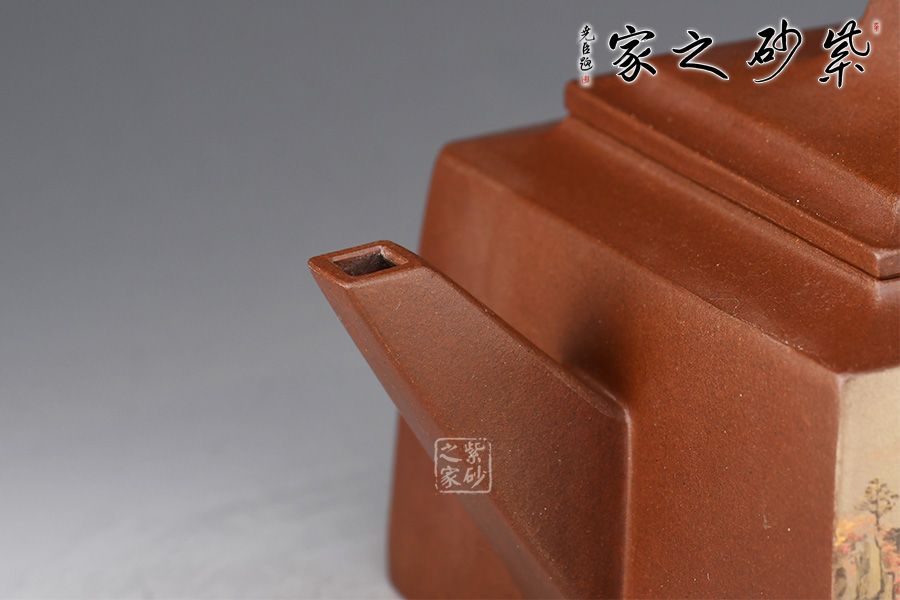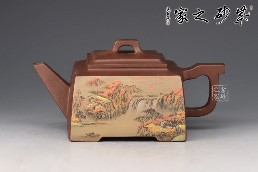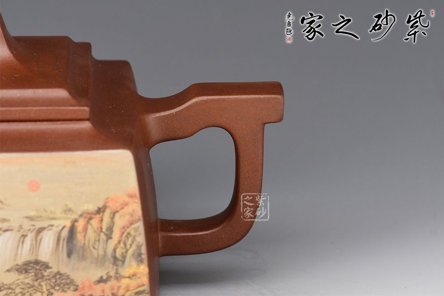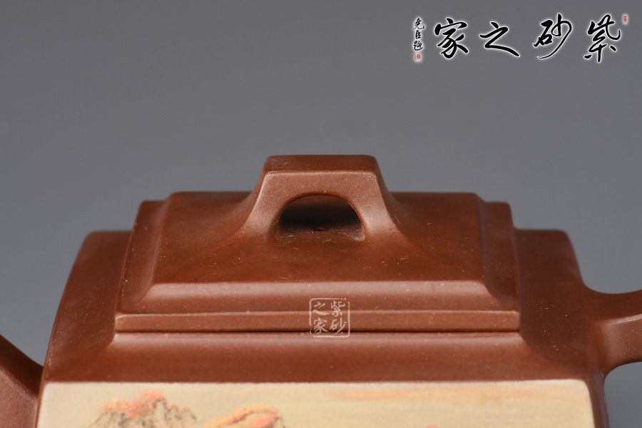 大方壺工藝難度頗大,橋形鈕。方形壺身,壺把,壺蓋,流、把亦呈四方不規(guī)則型。線條清晰分明,型制周正,工藝純熟。壺身彩繪江南美景,飽含詩情畫意的山水畫,看一眼就是享受!