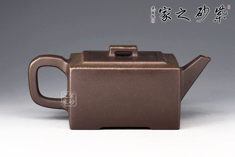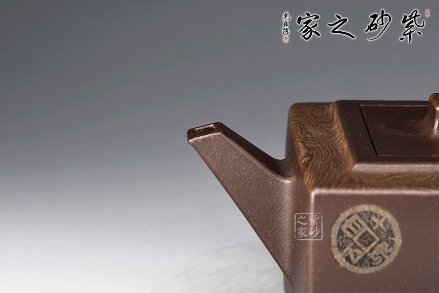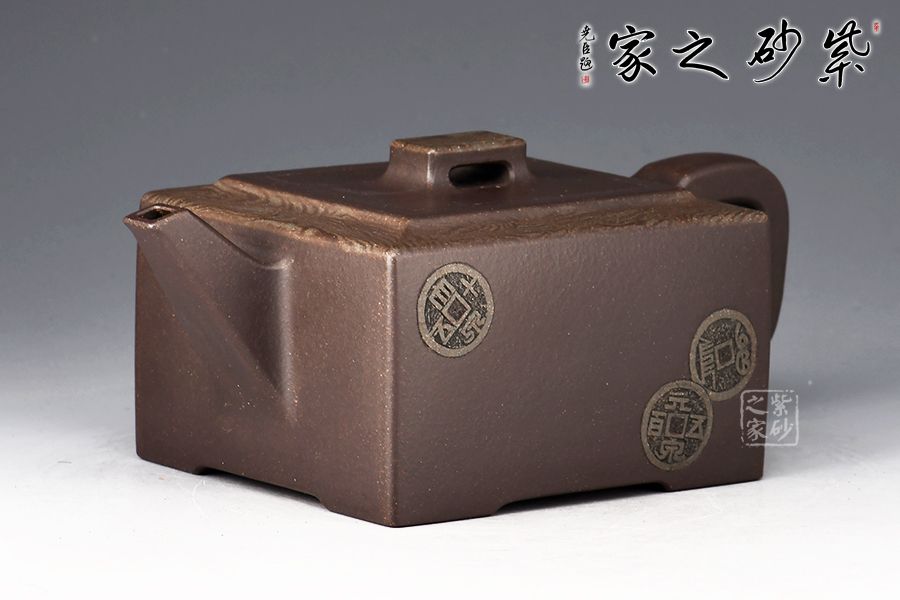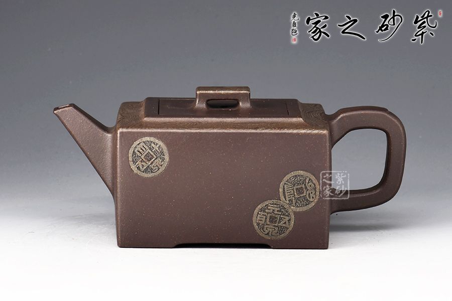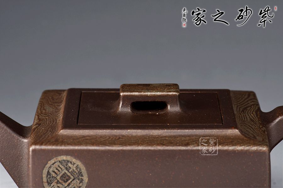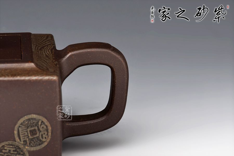 絞泥“金律”壺是曹奇敏老師的代表作之一,榮獲2002年華東工藝美術精品展金獎,采用嵌泥與陶刻裝飾手法,全手工精制而成,玄色泥料的壺身鑲嵌墨綠色的方圓古幣于壺體,壺型扁方穩(wěn)重,氣質高貴典雅。壺體上部,墨綠絞泥紋飾,淡雅柔柔,恰似微雨輕煙,薄羅輕衫,有正人溫潤之情,有貴婦儀態(tài)之美。取名“金律”,切壺之美,切意之深,內蘊文化哲理,“己所不欲,勿施于人”被古人奉為“清規(guī)戒律”,“金律”壺,尊貴自持的造型,寄意處應事成人成己,忠孝仁愛的人倫之理。
