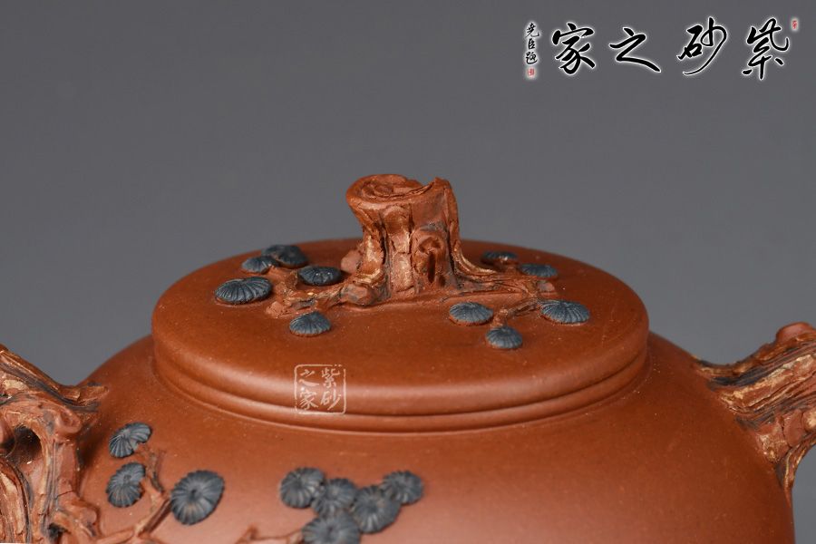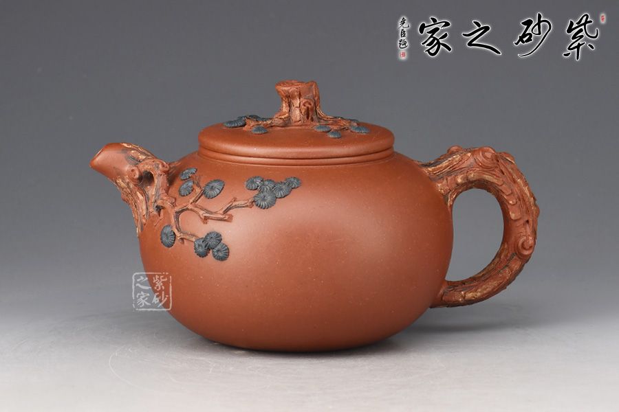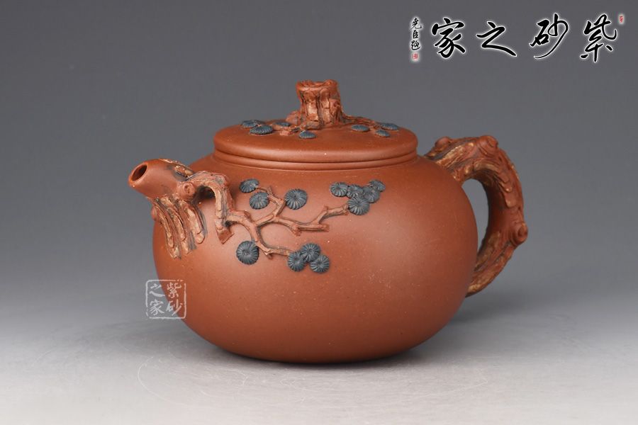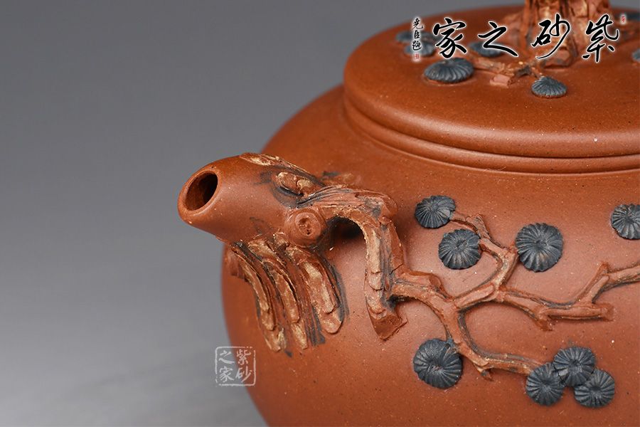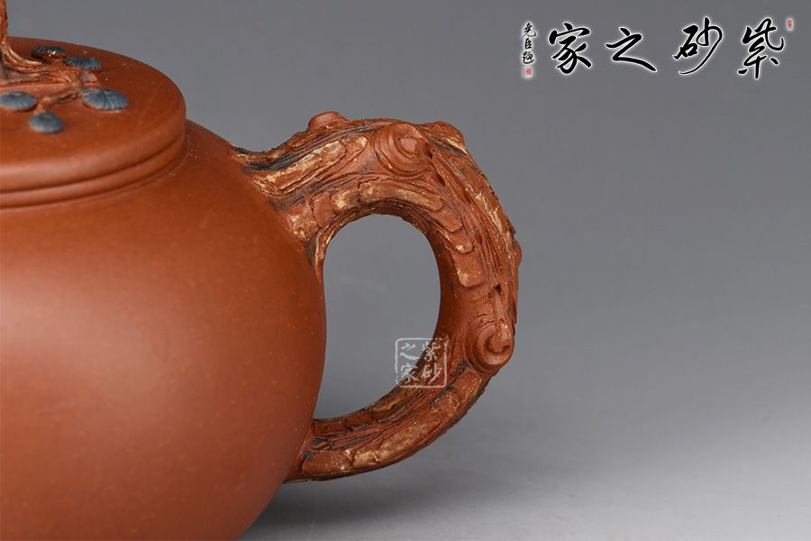 《勁松壺》精選原礦清水泥制成,泥色紅潤,好泡養(yǎng)。壺體圓潤飽滿,線條流暢!壺鈕、壺流、壺把捏塑成老松枝干,老樹皮逡裂開來,很有滄桑美感與經(jīng)過歷史洗禮的厚重質(zhì)感。壺蓋與壺身貼塑球形松針,立體而生動(dòng)!