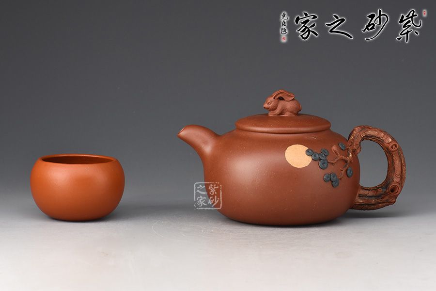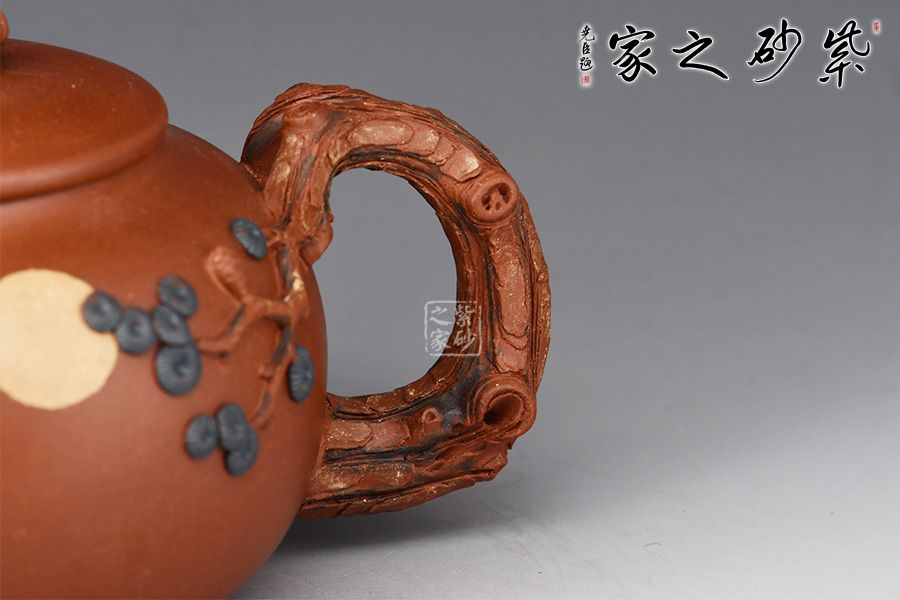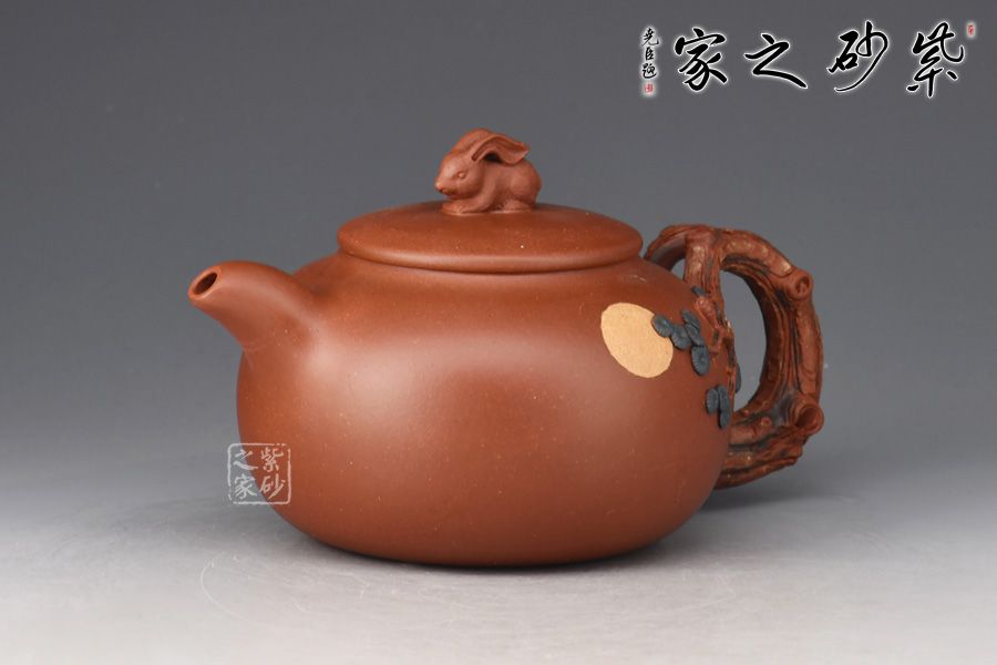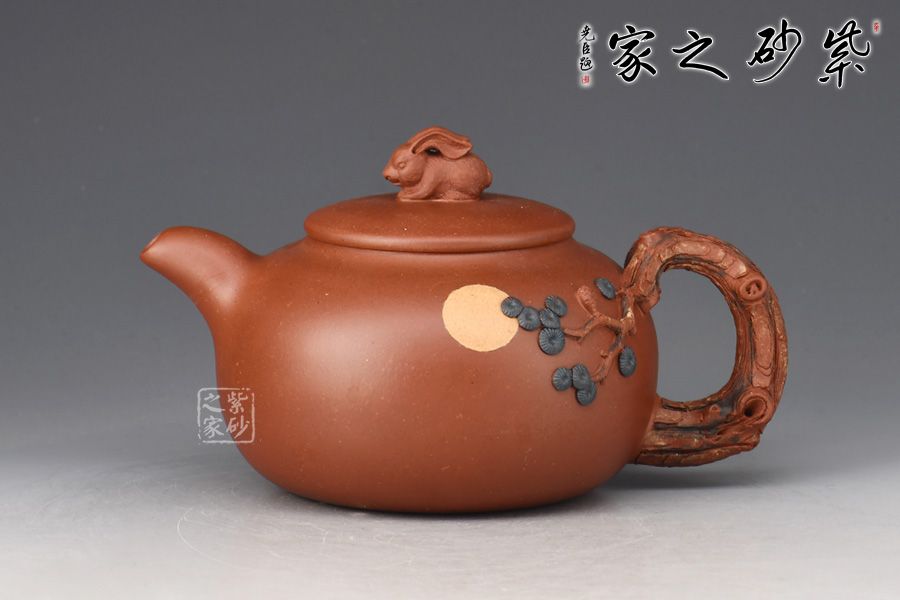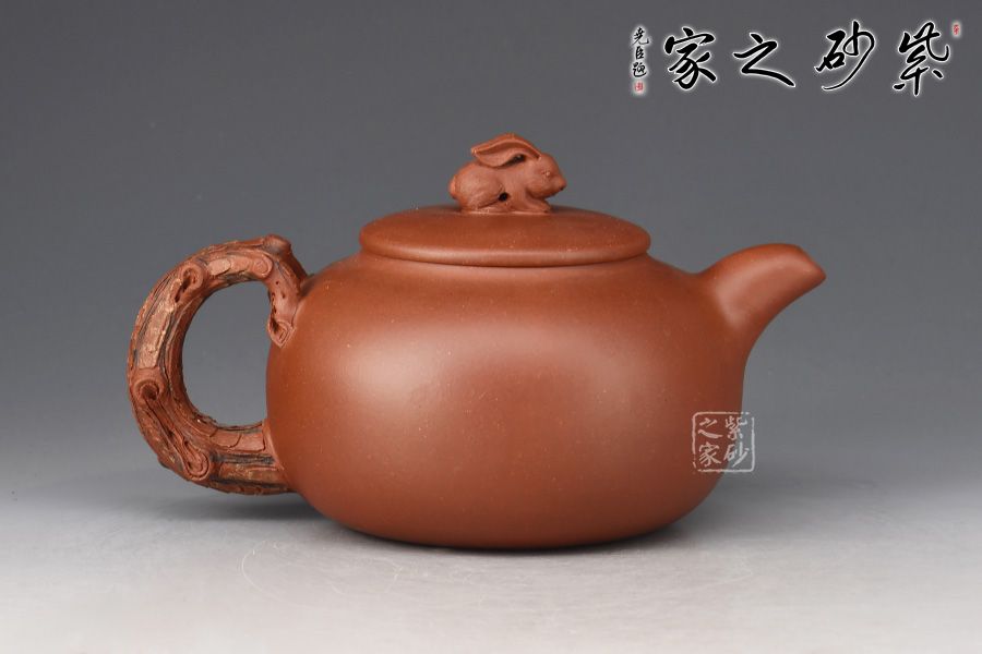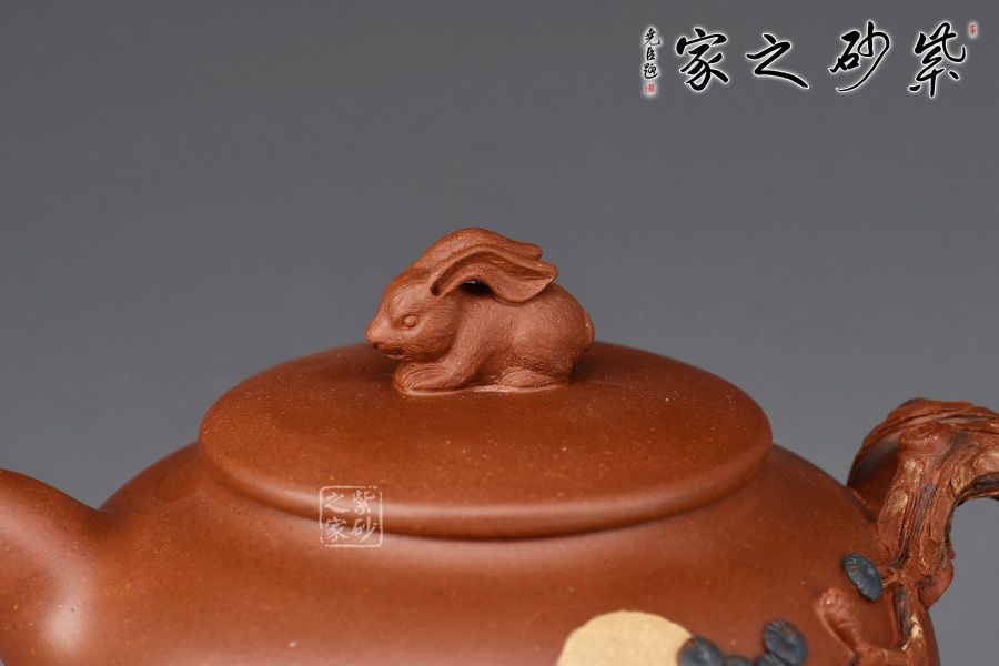 此壺壺體圓潤(rùn)飽滿,以“松”為題。整體結(jié)構(gòu)簡(jiǎn)約不繁,挺秀有神。通體氣格高古,韻之清絕。壓蓋設(shè)計(jì),嚴(yán)絲合縫,壺鈕雕塑設(shè)計(jì),一只小兔子活靈活現(xiàn),與壺身圓月相呼應(yīng)。一彎嘴出水爽利,把以松為形塑成,其上松針、松果極其逼真,精細(xì)入微,層層迭迭,推薦收藏。