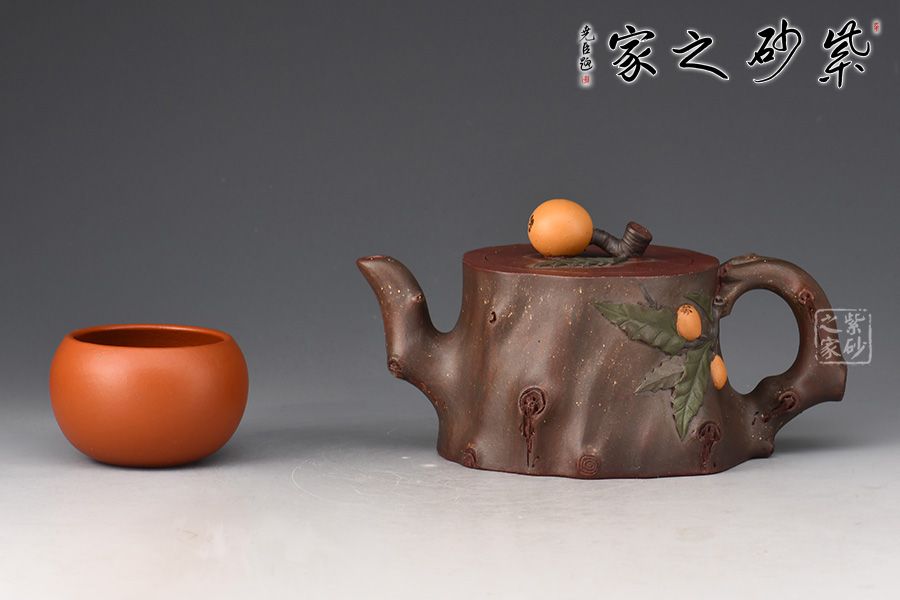 以粗壯的枇杷樹干為器身,不求規(guī)整,呈寫意的橢圓形,嘴、把塑成枇杷樹的細(xì)枝,粗糙任意,保留其自然形態(tài)。作品以江南鮮果枇杷為創(chuàng)作題材,