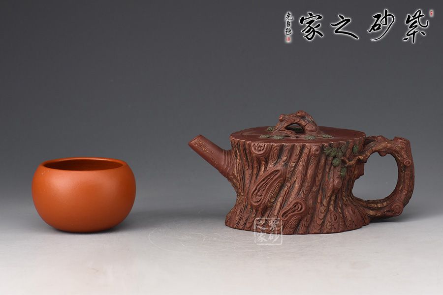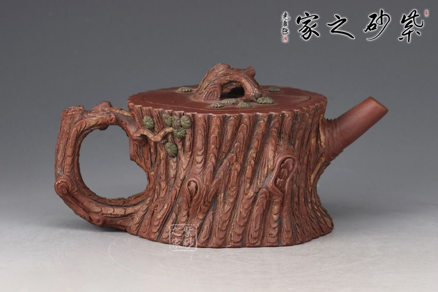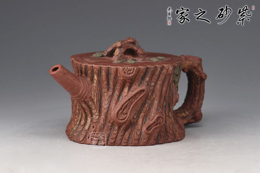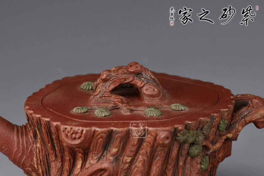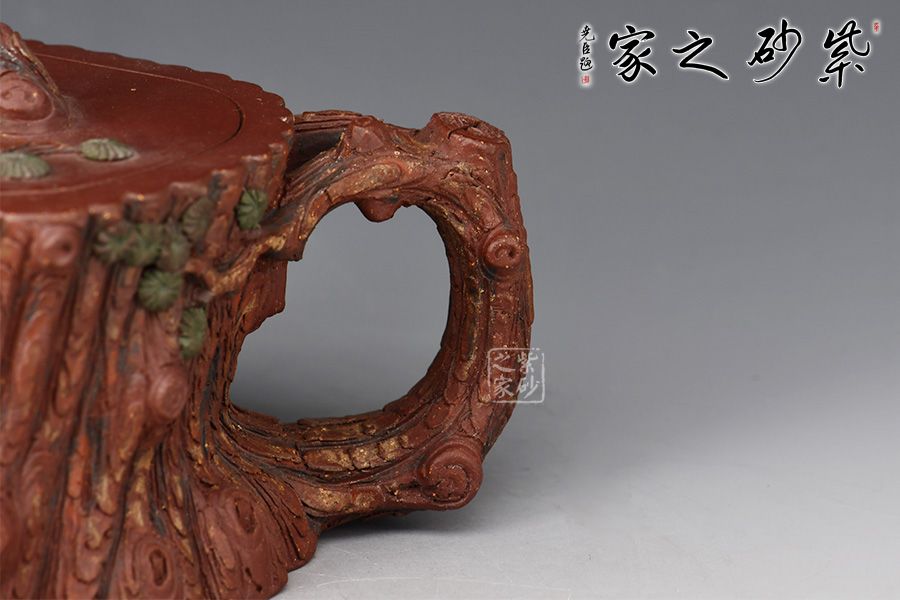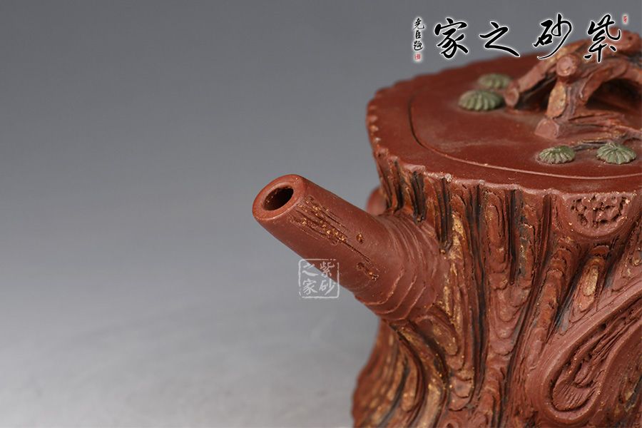 此壺是花貨中常見(jiàn)造型,精美自然,仔細(xì)觀賞,趣味無(wú)限。壺身為松樁,流似松枝探出,把狀若虬屈的松枝,探出壺身一段松枝。整件松段壺泥塑工藝精美,層層迭迭,將古松蒼老之外皮塑造的分外相似。壺鈕更是巧取松節(jié)一段,匍匐貼合于蓋上,蓋皆做松樹(shù)枝節(jié),極其逼真,甚是可愛(ài)。此壺做的嚴(yán)絲合縫,做工出眾,實(shí)在有趣、有趣。