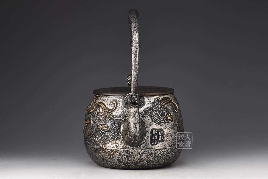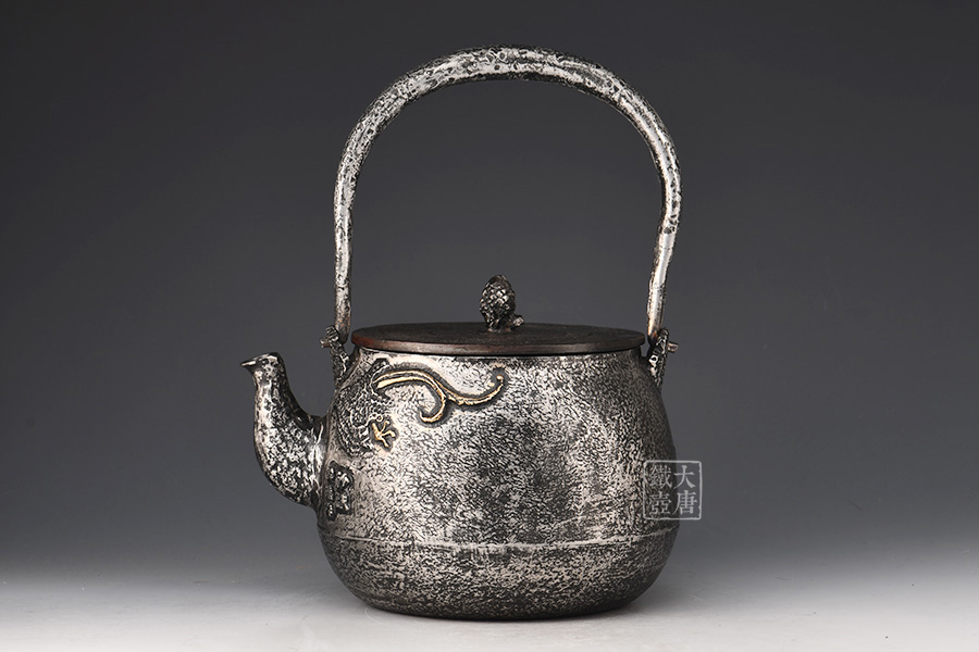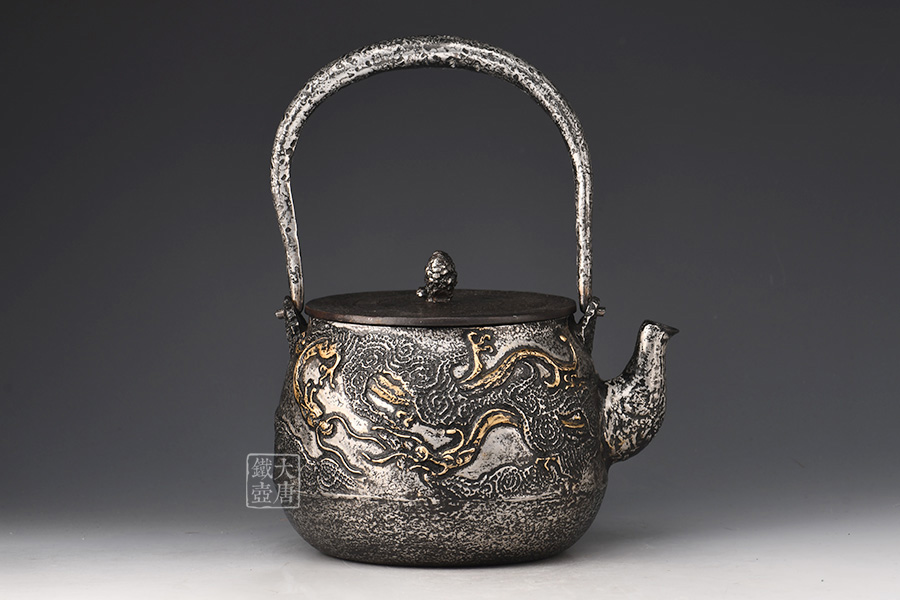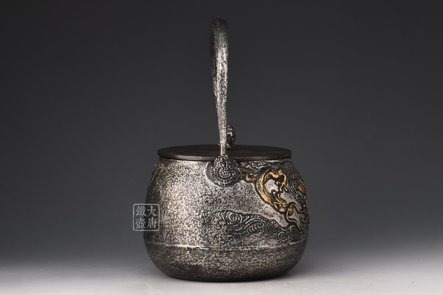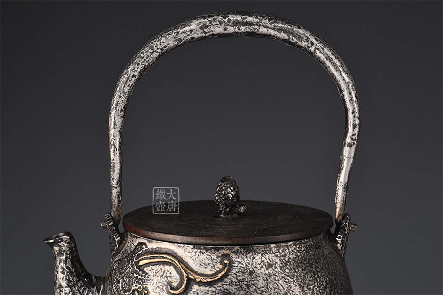 荒井工房的鐵瓶除了在鑄造工藝上有嚴格的規范和體系,在鐵瓶裝飾技術上也頗有建樹。除了傳統的印刻技術外,荒井工房還掌握了非常出色的金銀鑲嵌技藝,尤其以大片的鏨刻銀片最為出眾,這在山形當地堂口中獨樹一幟。