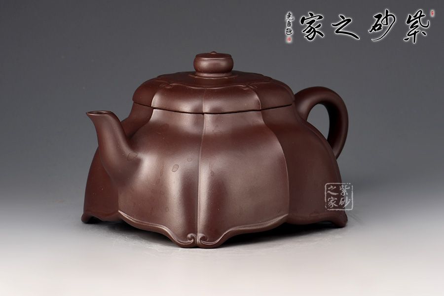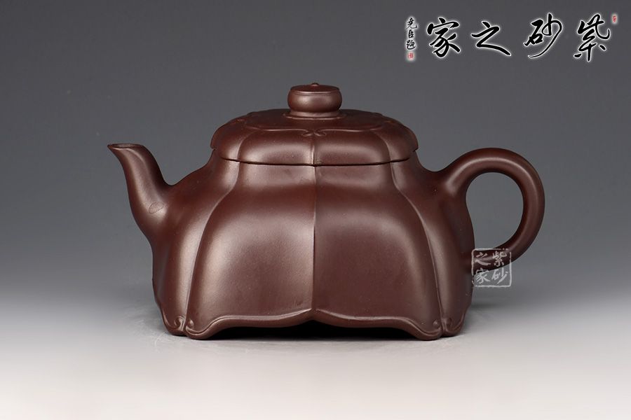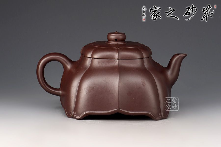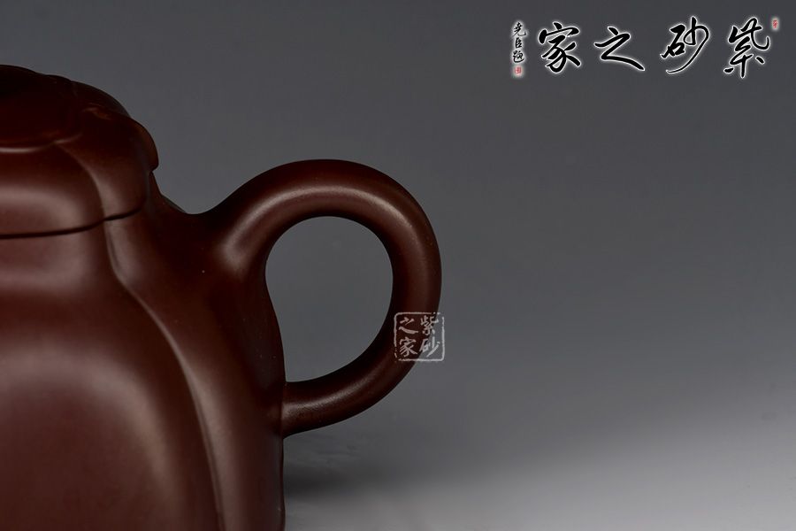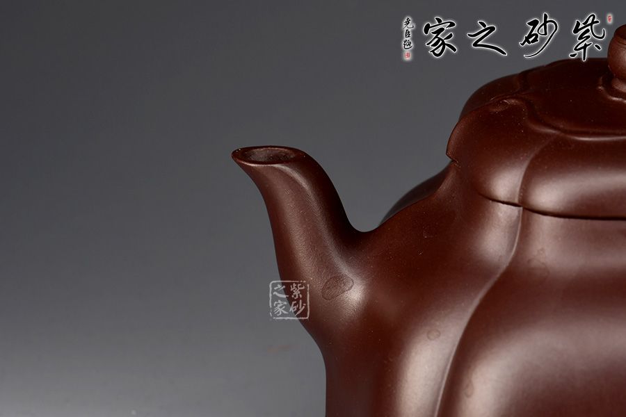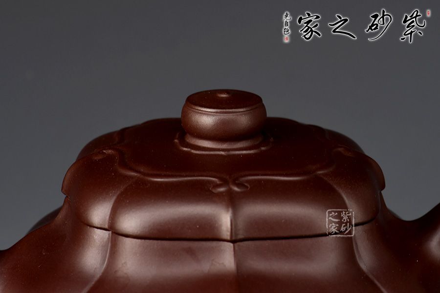 此壺構(gòu)思巧妙,制作難度極高,每一瓣筋紋的演繹都詮釋著骨感與豐腴的雙重魅力。壺身成扁方圓式,造型嚴(yán)謹(jǐn)端莊、色澤雅致,線條勒成的曲面有凸有凹,壺蓋作對應(yīng)處理,壺肩線與壺嘴、壺把的側(cè)線接連一氣,自然舒暢、整體感強(qiáng),微細(xì)中見神韻。