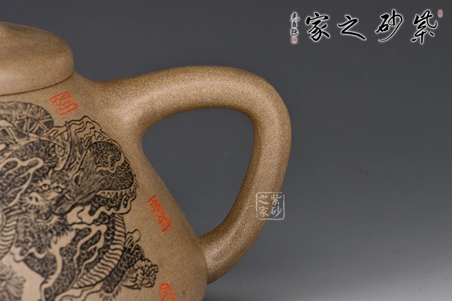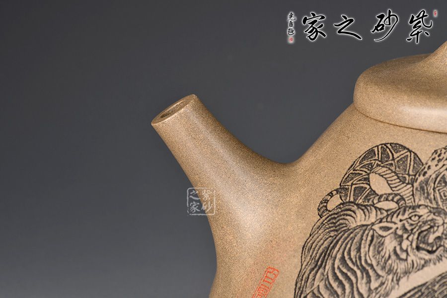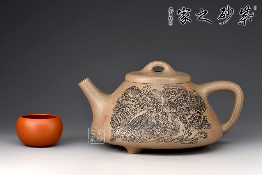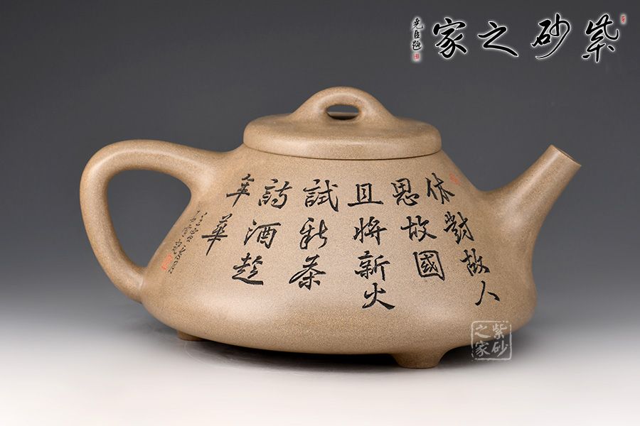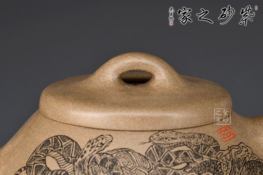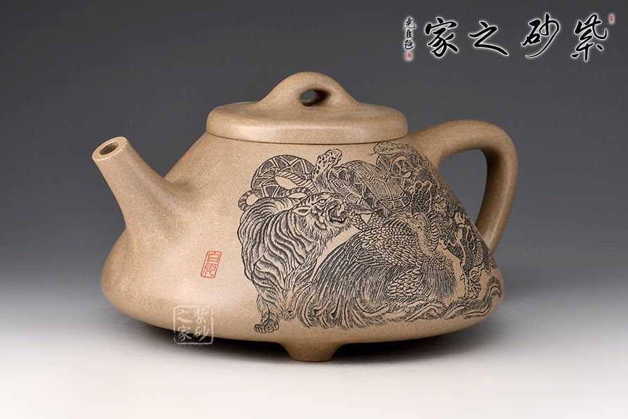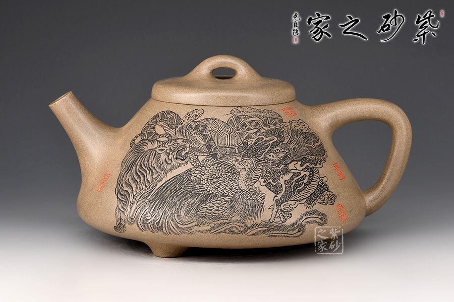 此壺為作者摹古而作,取經典子冶石瓢之型,采用蟹殼青精制而成,泥色溫潤。整體造型簡約大方,壺身呈金字塔形,豐潤飽滿,壓蓋之上以橋鈕裝飾,直流簡而有力,出水順暢,壺把呈倒三角勢,與壺身之型互補,形成和諧的美學效果。此外,壺身雙面陶刻,正面刻繪四大神獸,白虎、青龍、朱雀、玄武,反面刻繪詩詞“休對故人思故國,且將新火試新茶”。
