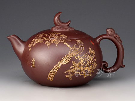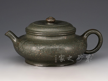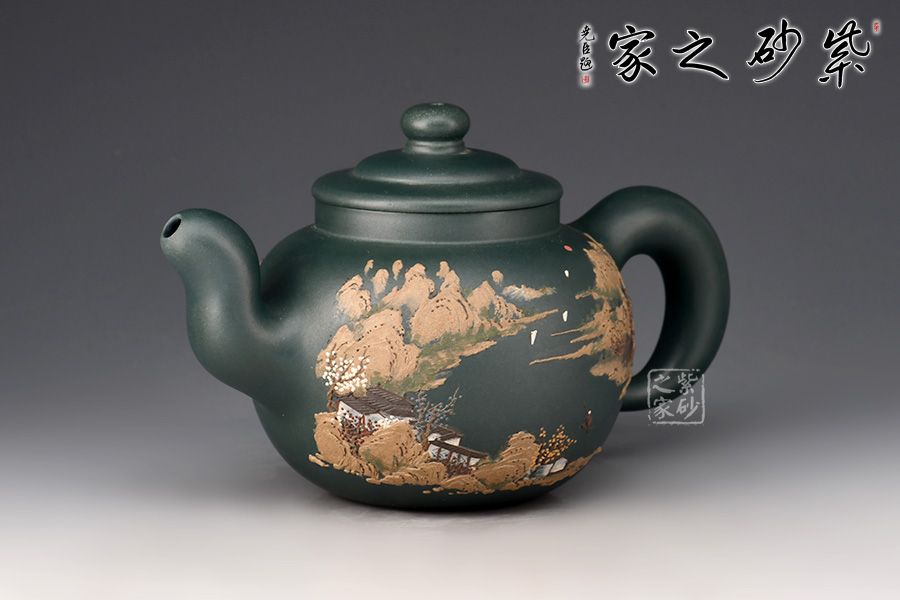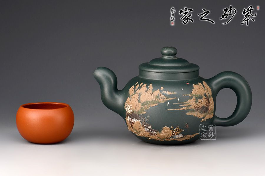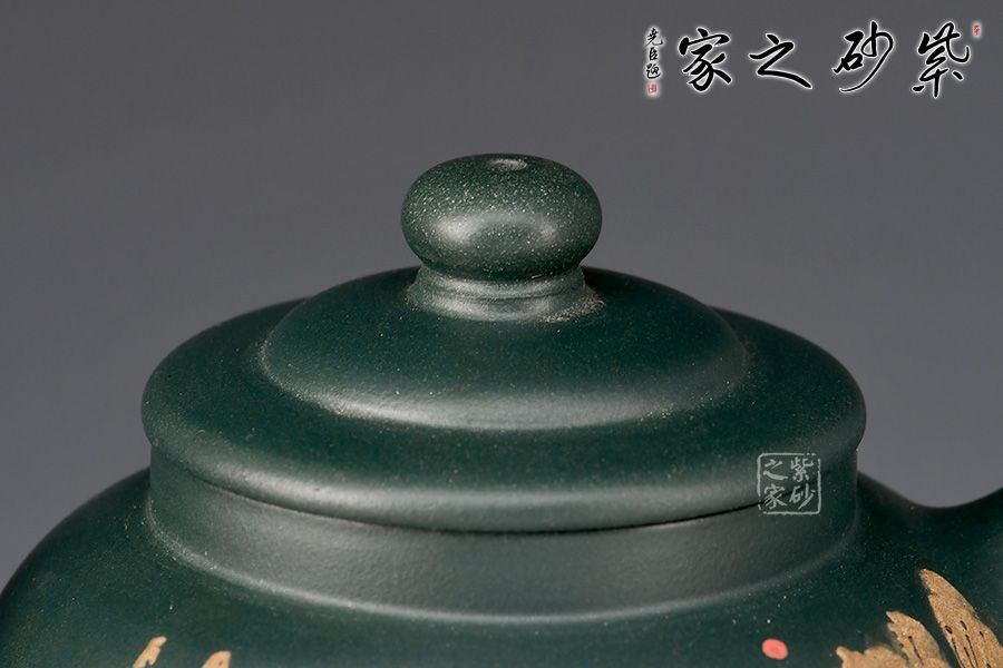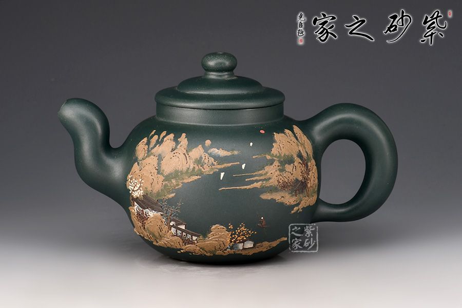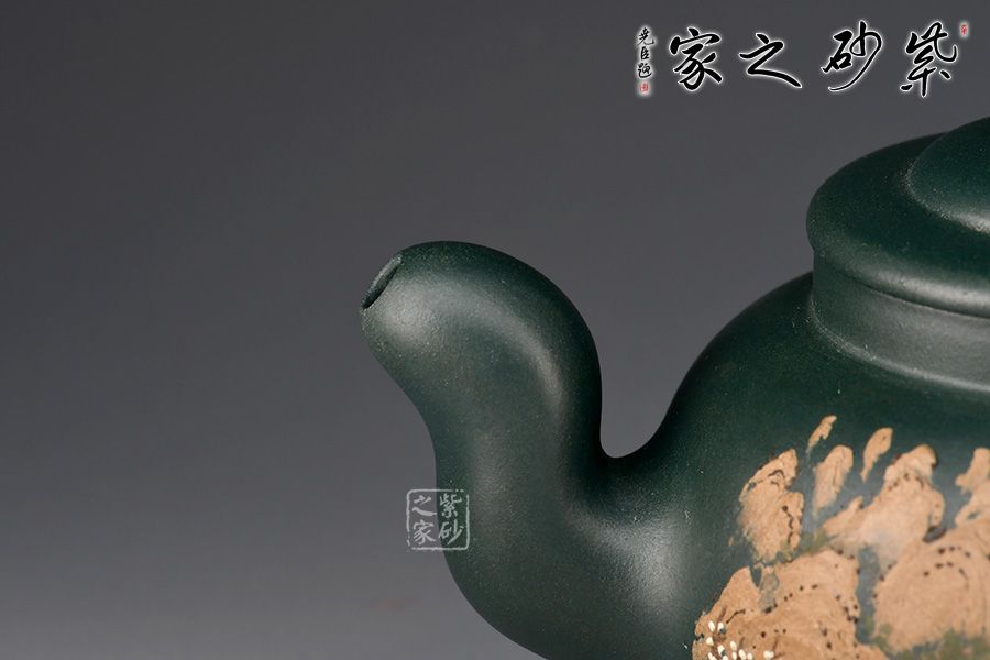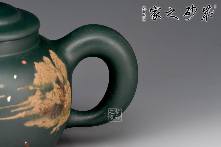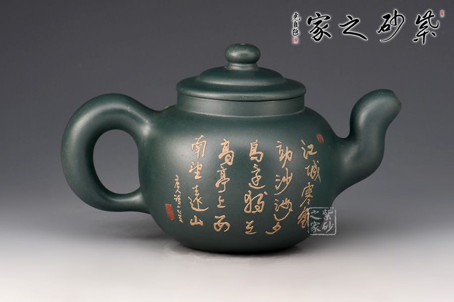 道洪疾風(fēng)壺精選民國(guó)綠泥制作,壺身鼓腹似圓珠,削肩,直頸,壓蓋板面隆起,壺鈕扁圓,小巧可愛。三彎嘴,額厚豐滿,圈曲把,線型流暢,力度夸張,整器給人氣宇軒昂的感覺(jué),雖靜如山,動(dòng)則如疾風(fēng)。此壺,壺身雙面泥繪山水詩(shī)詞,風(fēng)景美如畫,立體感十足,字體剛勁,有大家之風(fēng)。