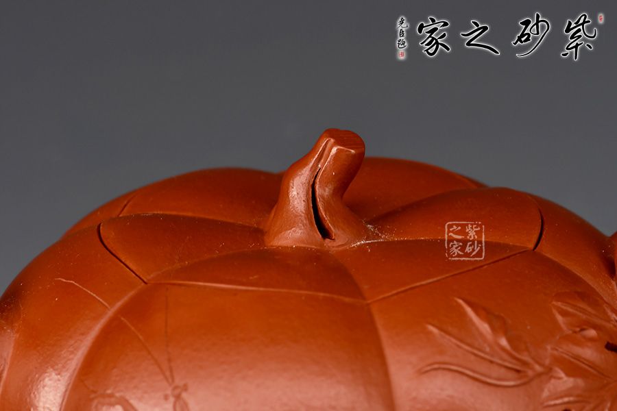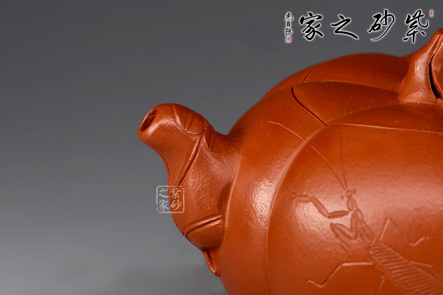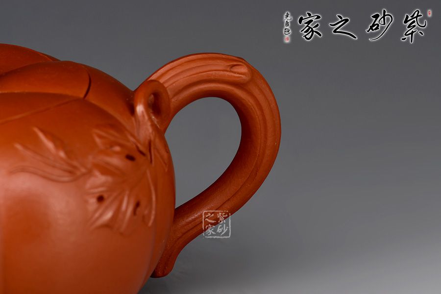 南瓜筋紋壺精選大紅袍精制而成,泥色亮麗長,質(zhì)感潤澤。整器以南瓜為形,演變而成,壺身由六瓣筋囊組成,筋紋流暢,筋囊飽滿,氣韻流暢。南瓜葉包裹成壺流,環(huán)形把底部貼塑藤蔓及藤條瓜葉,蜷曲自然,生動(dòng)形象,五瓣瓜蒂為壺蓋,蓋仿生自然,與壺身相契。