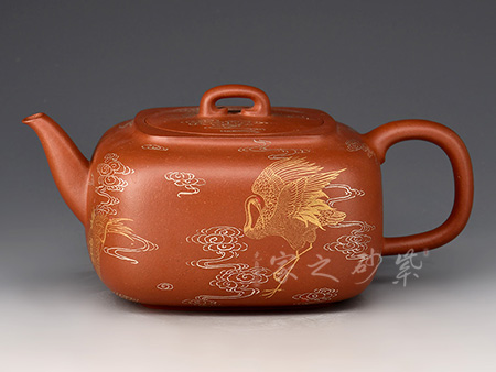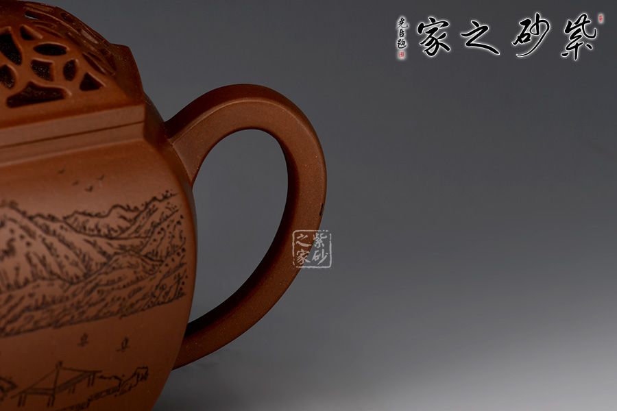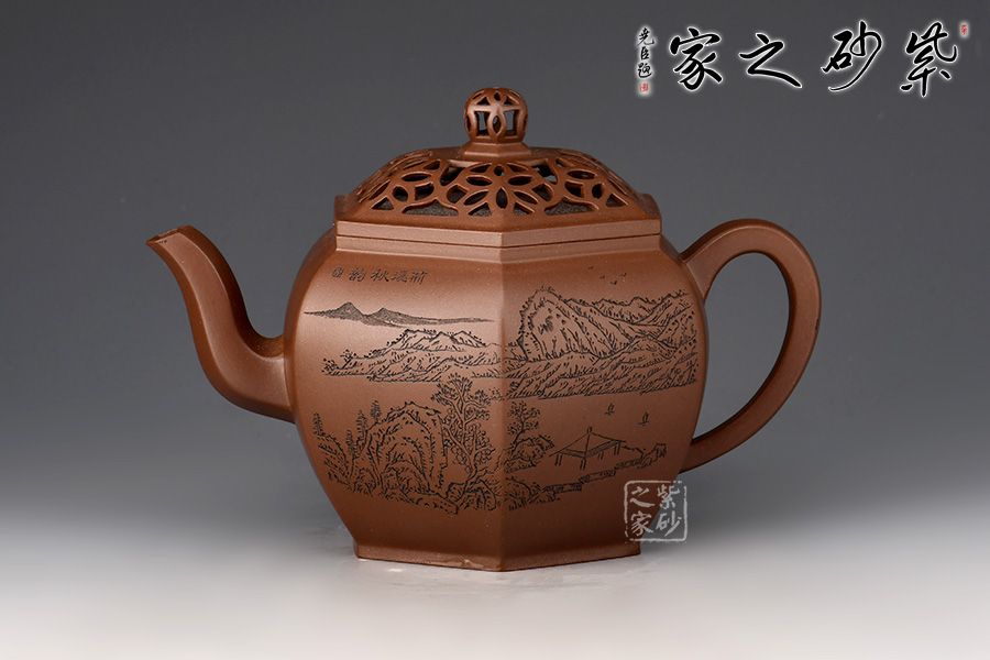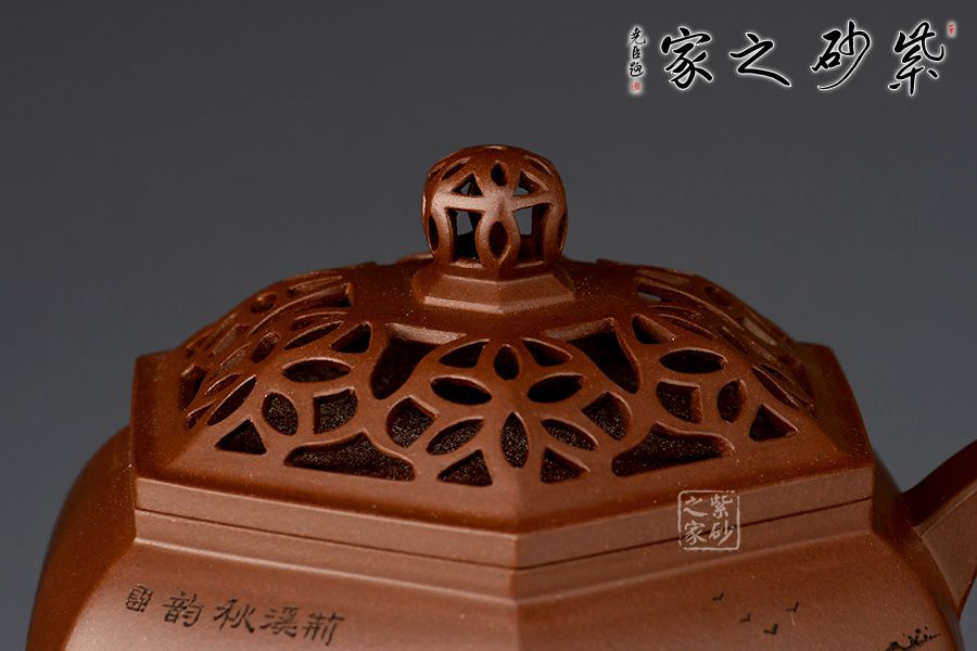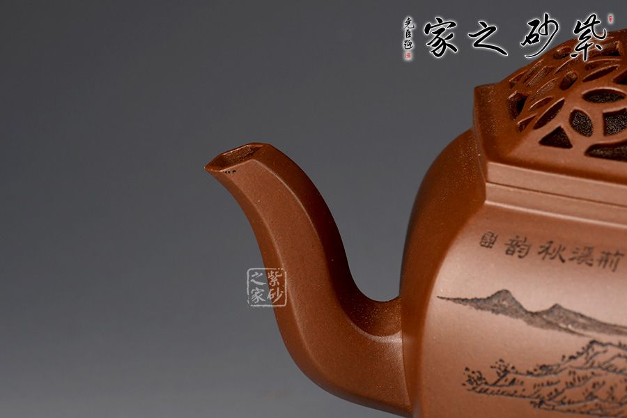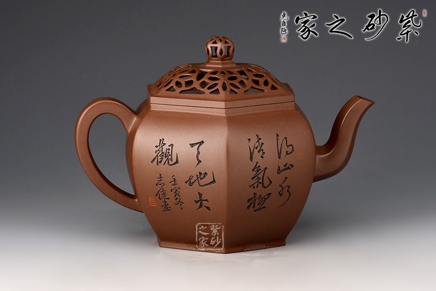 此宮燈壺以六方呈現(xiàn),為作者精選原礦紫泥,全手工制作而成,泥色溫潤(rùn)雅致,造型新穎別致。壺身輪廓優(yōu)雅,上下收斂。鈕、蓋、頸、身皆為六方,氣韻通貫。三彎流出水爽利,飛天把端握舒適。壺蓋、壺鈕造型別致,鏤空設(shè)計(jì),極具創(chuàng)意。壺身之上的山水詩(shī)詞刻繪,品茗間更添文人雅致,推薦收藏!